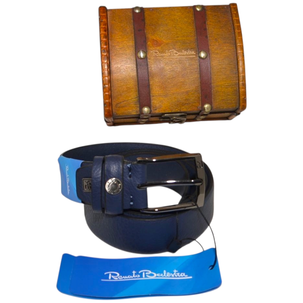 Cintura vera pelle blu abrasivato Renato Balestra liscia con fibbia in metallo quadrata regolabile scatola legno scuro