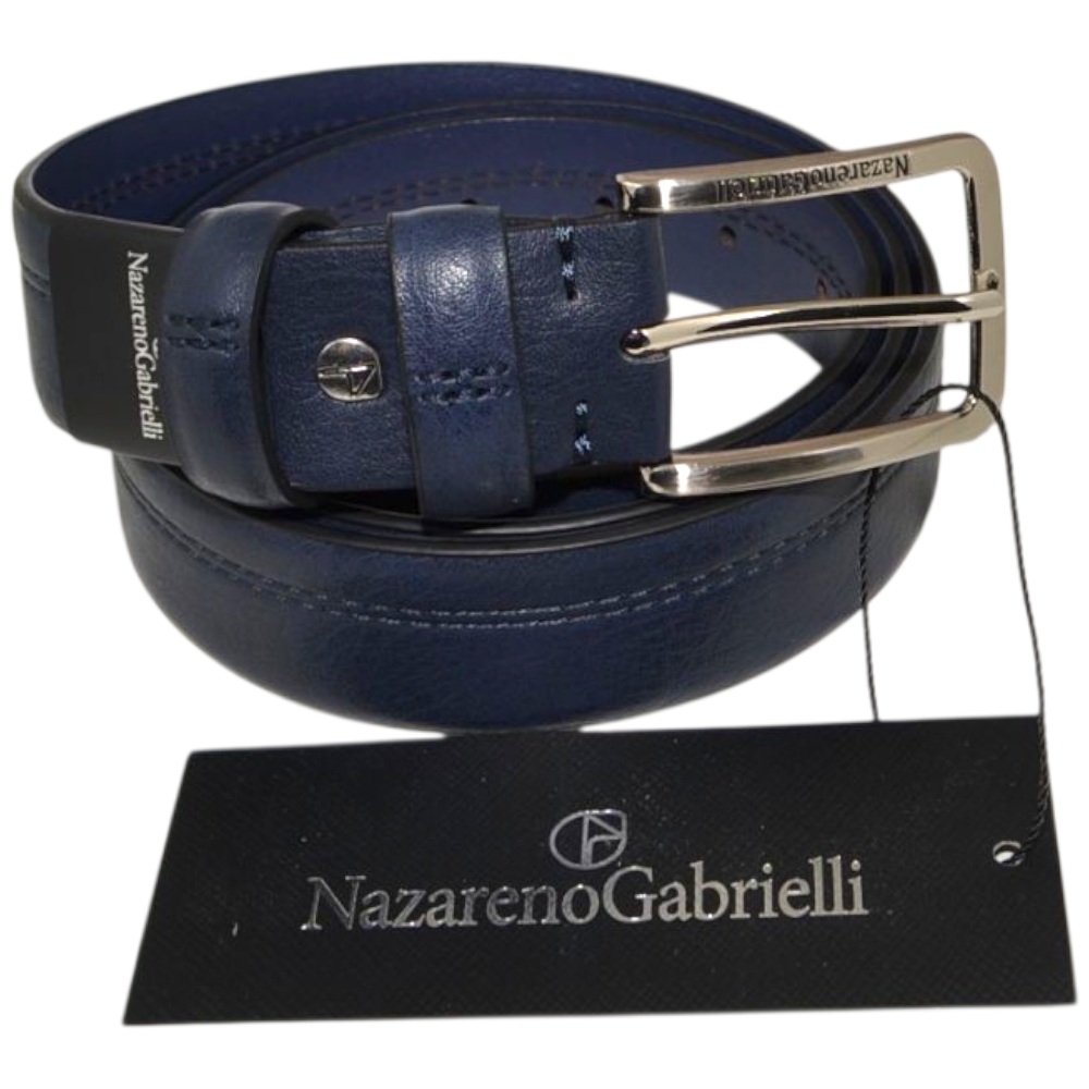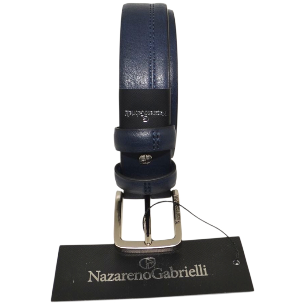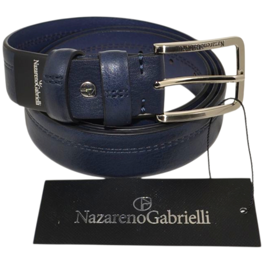 Le cinture Nazareno Gabrielli sono pensate per gli uomini dinamici che scelgono accessori pratici ed eleganti. Realizzata in pelle blu resistente è una cintura giovane ma con design classico: la fibbia ad ardiglione silver con logo inciso e il taglio minimal della cintura, liscia e con impunture rendono il modello sobrio e adatto ad abbigliamento classico.