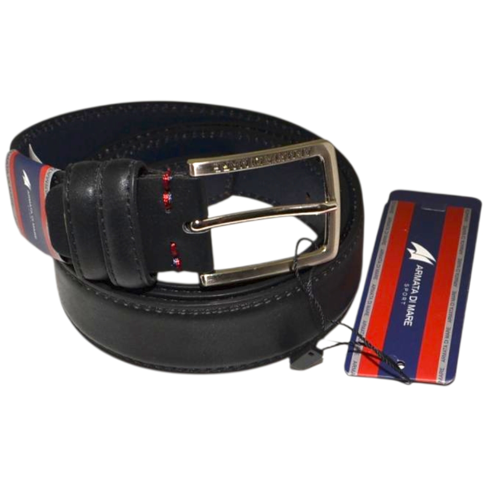 Cintura uomo vera pelle nera cuciture a contrasto Armata di mare con fibbia in metallo quadrata regolabile scatola legno.