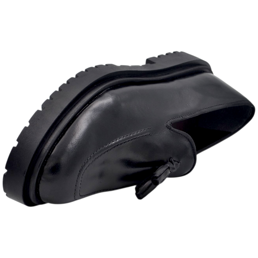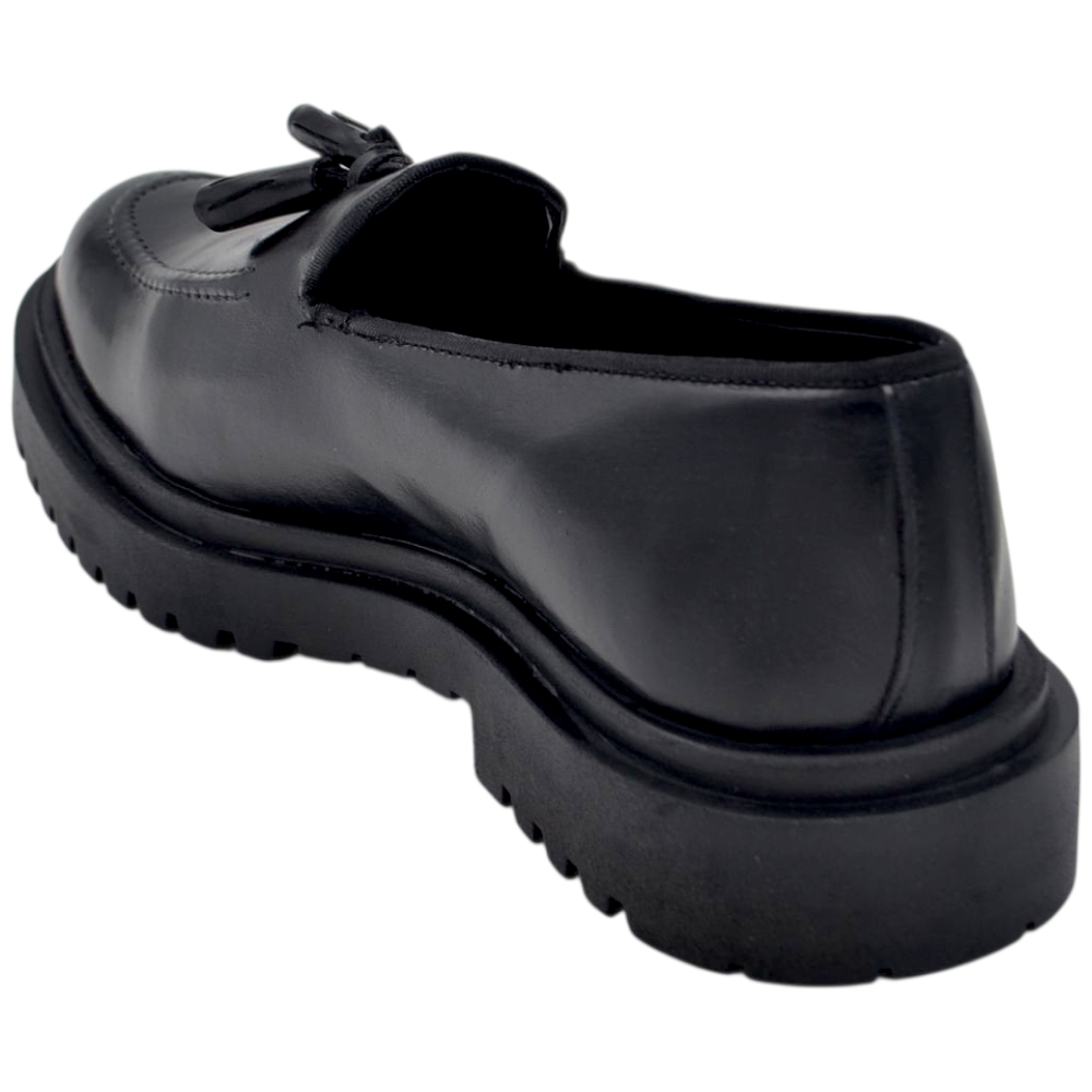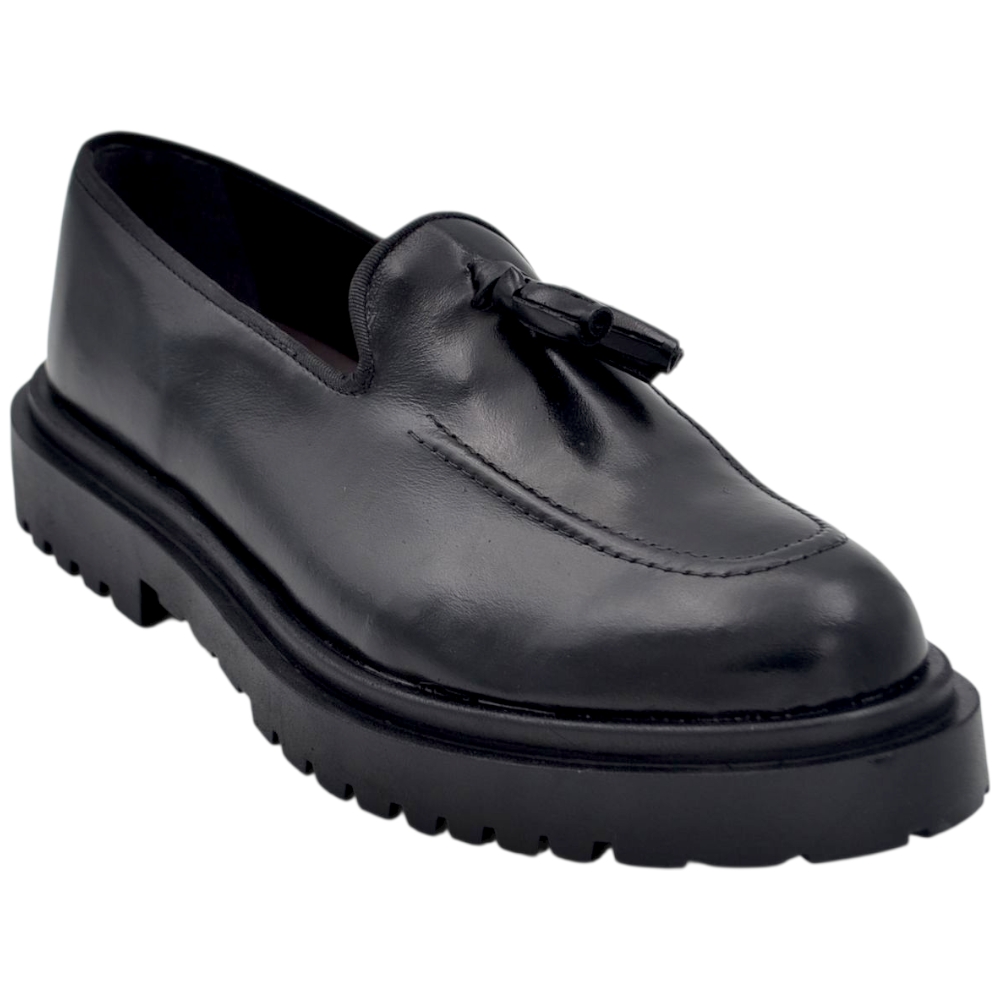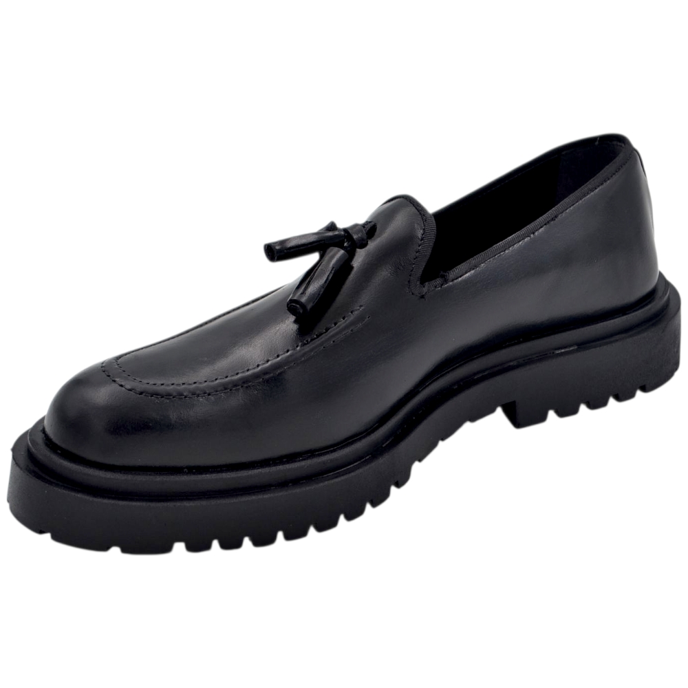 Scarpa mocassino uomo ls con fibbia borchie e frangia in vera pelle matte nera cucita a mano fondo cuoio antiscivolo.