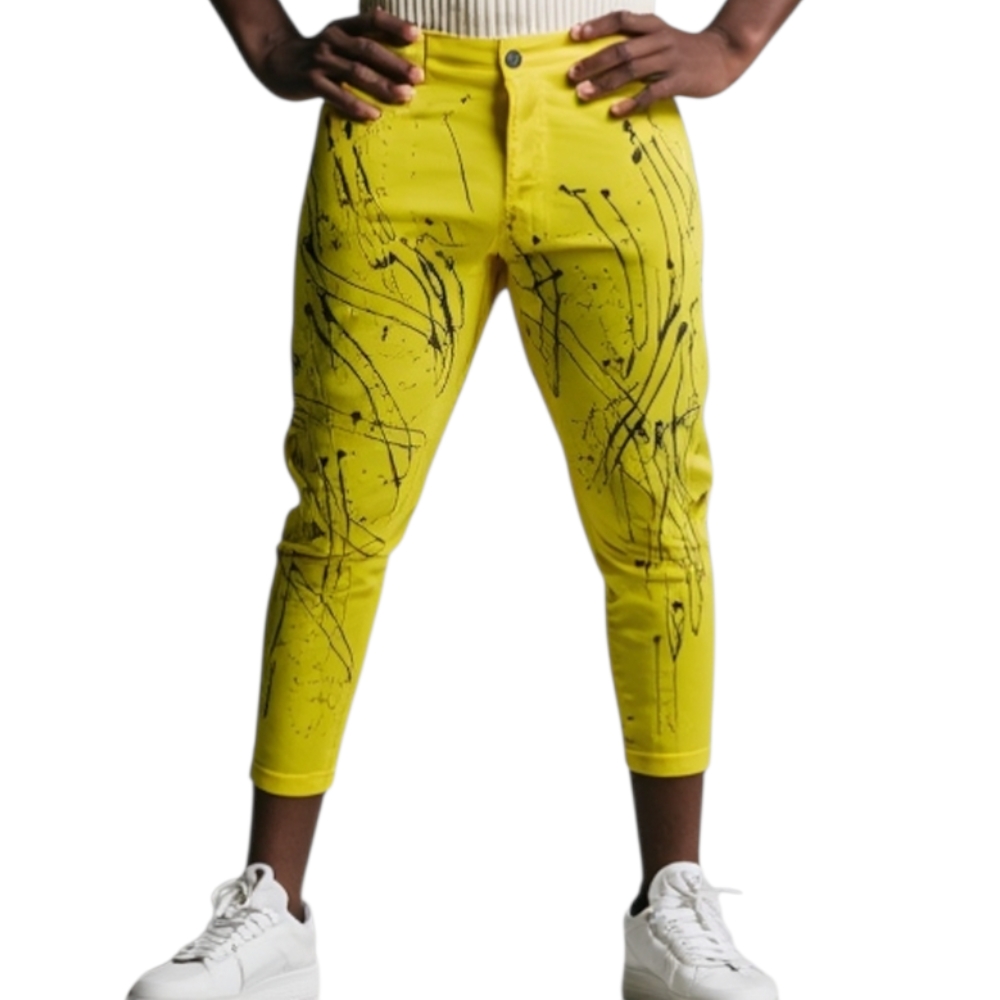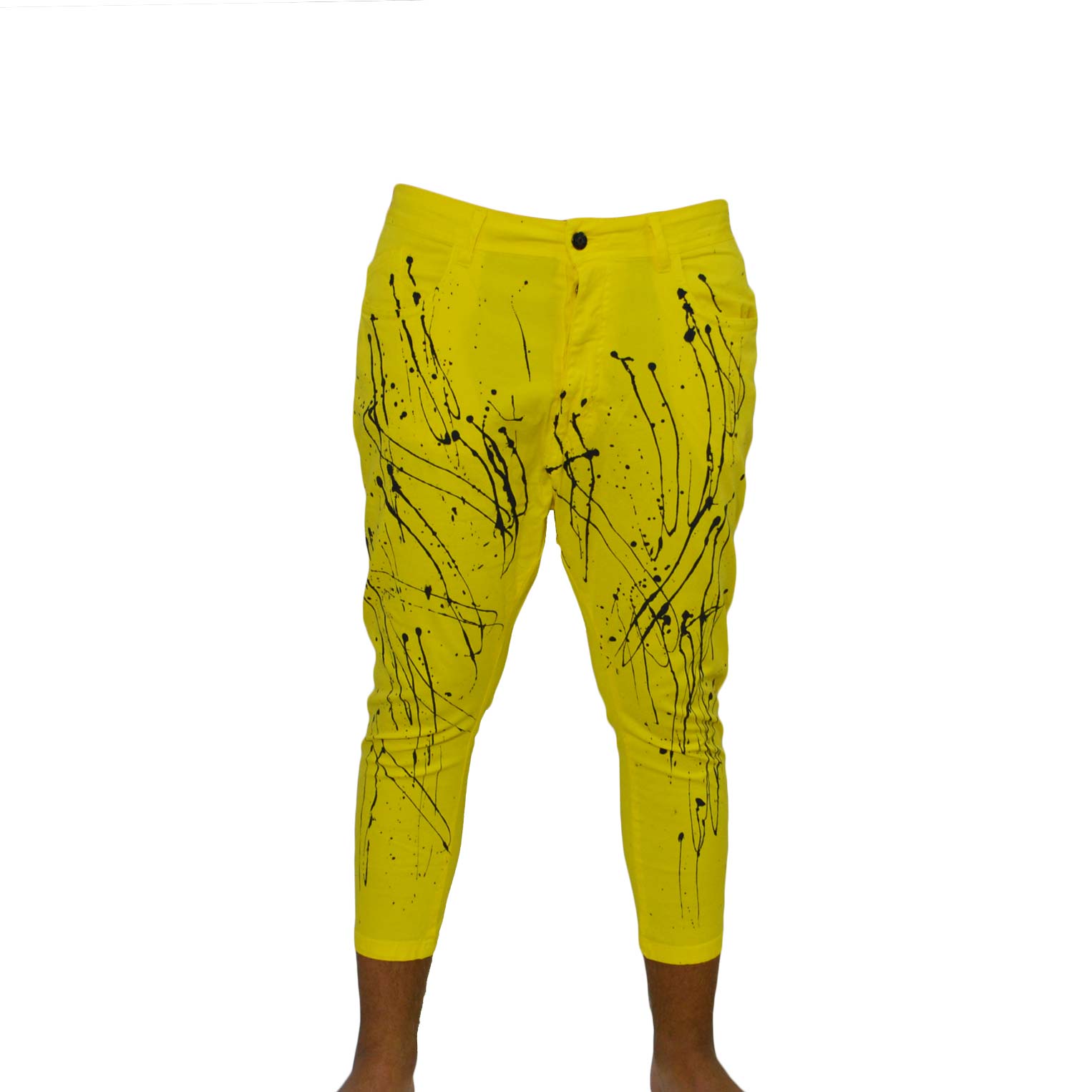 Jeans slim fit color giallo, schizzi di colore nero chiusura con cerniera glamour