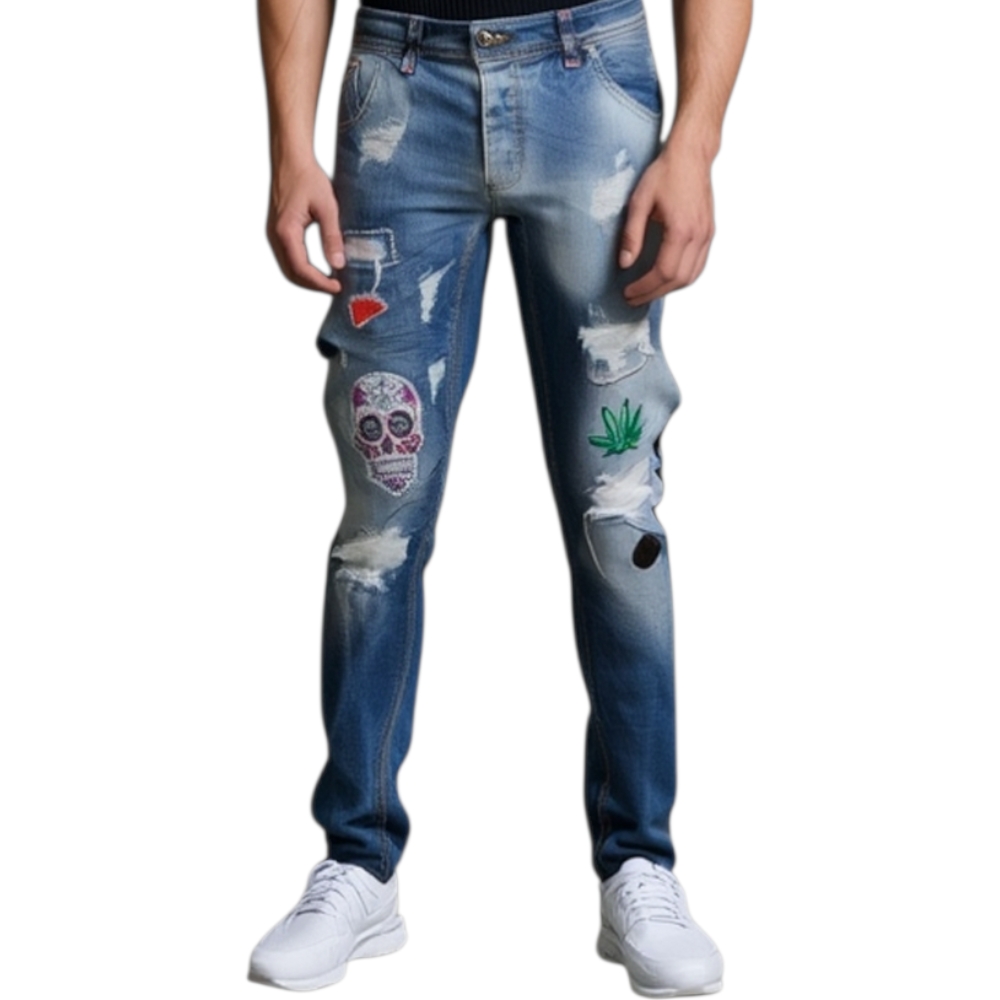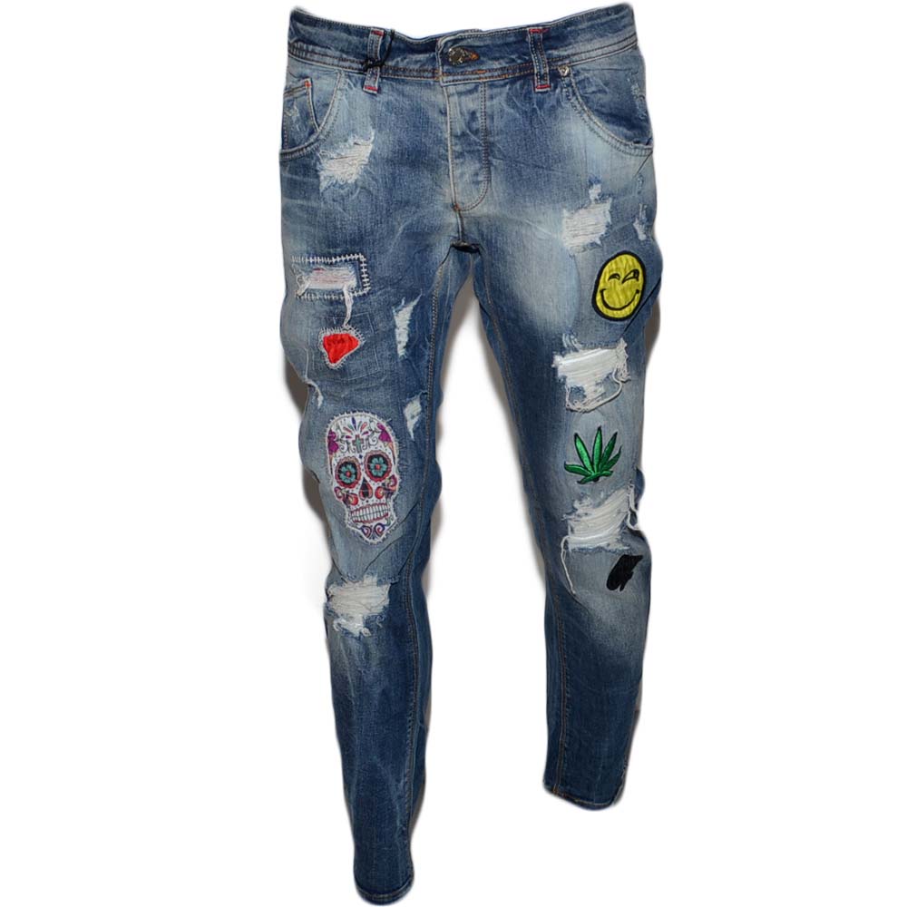 Pantaloni Jeans blu scuro denim biker. Skinny fit. Chiusura con bottone e cerniera strappato e toppe moda