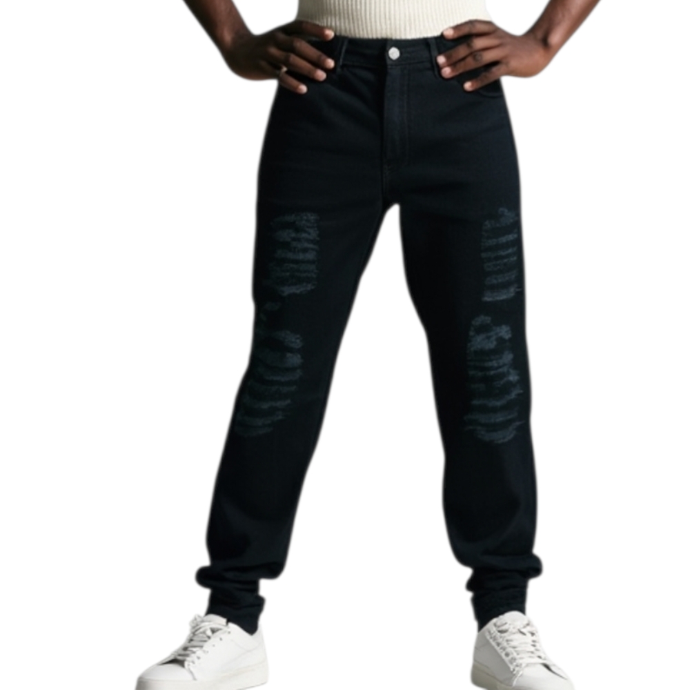 Jeans denim uomo jogger fit cavallo basso lavaggio chiaro Cinque tasche cerniera e bottone con strappi made in Italy.