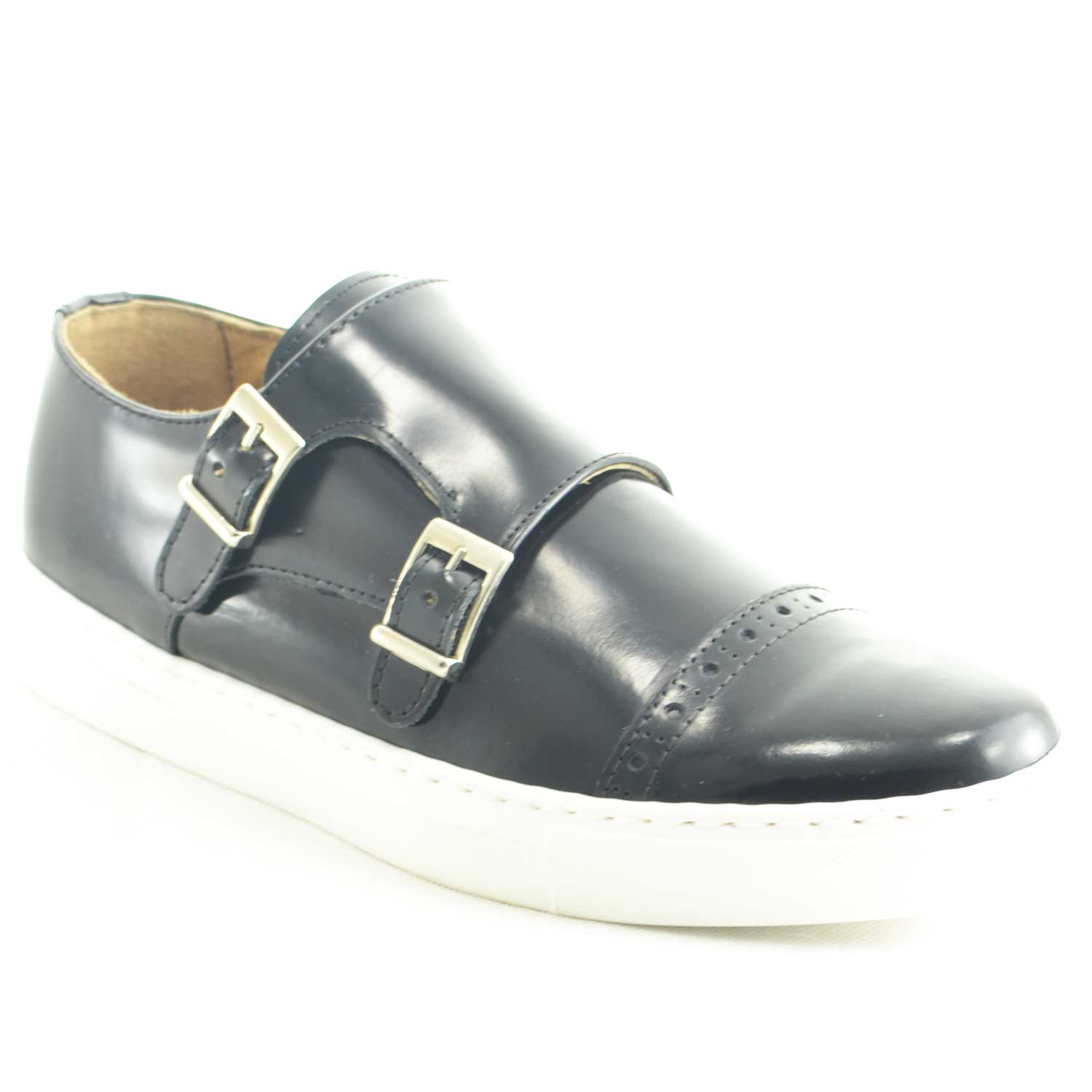 SCARPE UOMO CLASSICO SPORTIVO DOPPIA FIBBIA VERA PELLE NERO FONDO BIANCO MADE IN ITALY MODA ELEGANTE GIOVANILE