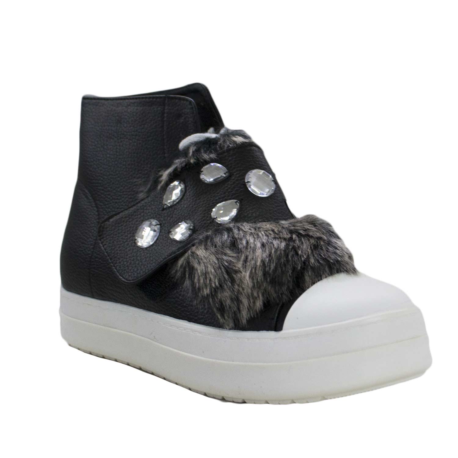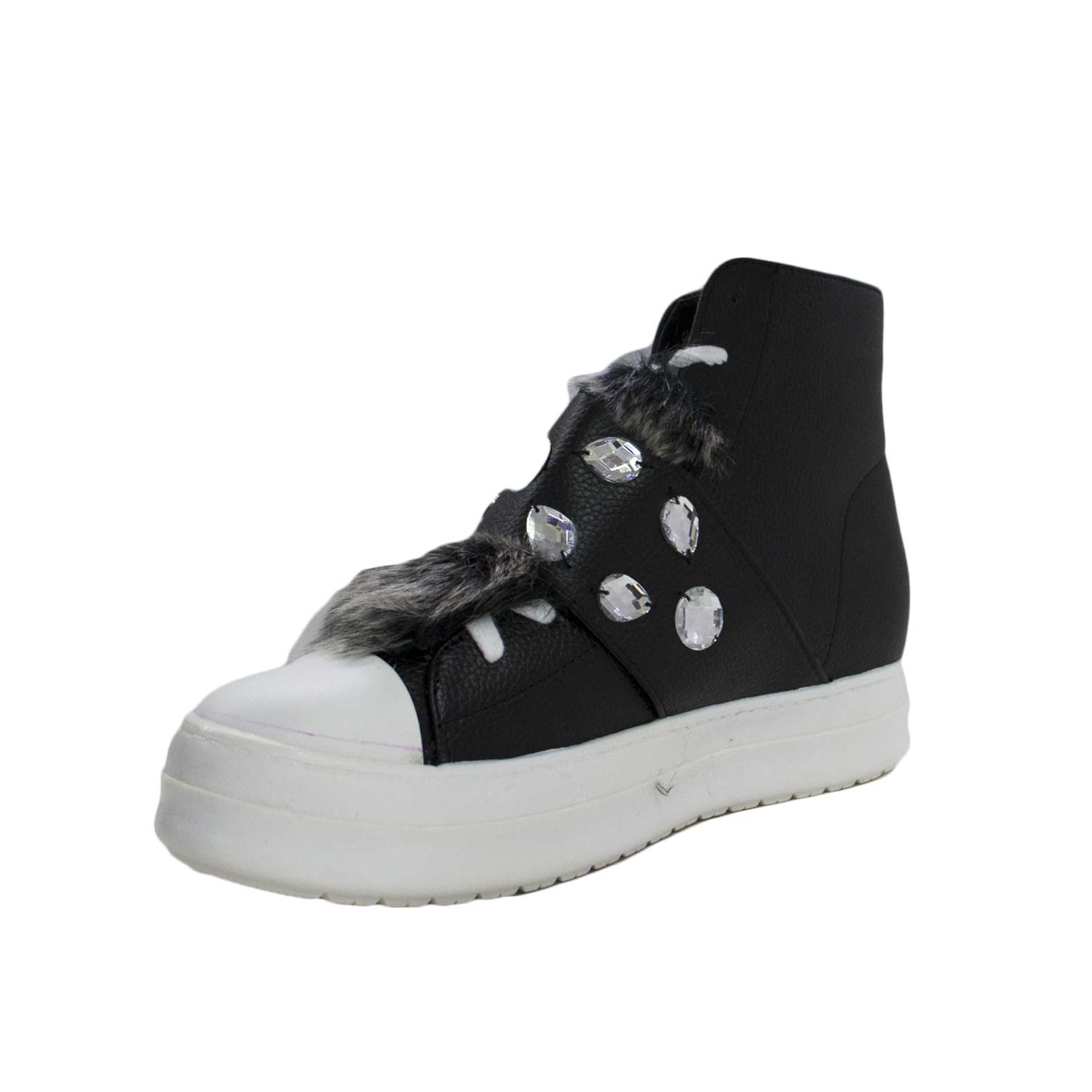 Sneakers alta eco pelle accessori pietre pelliccia morbidissima strappo e lacci fondo bianco comfort catena moda trend fashion