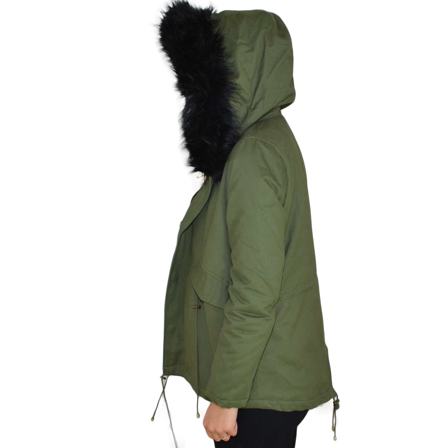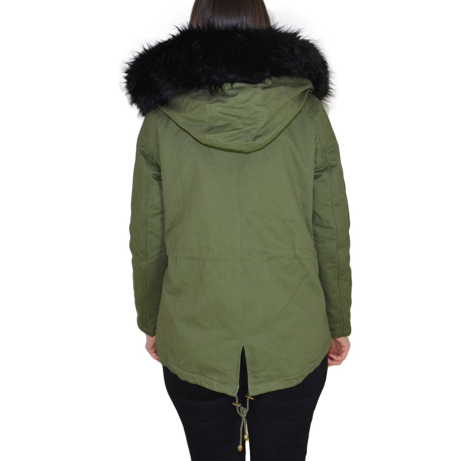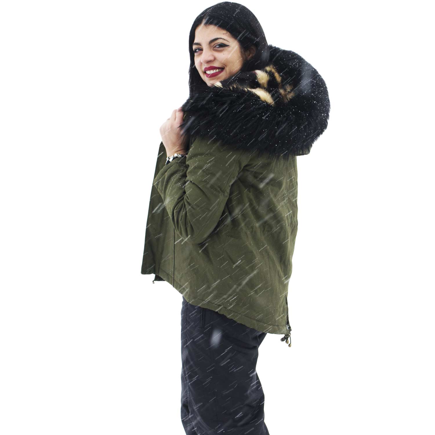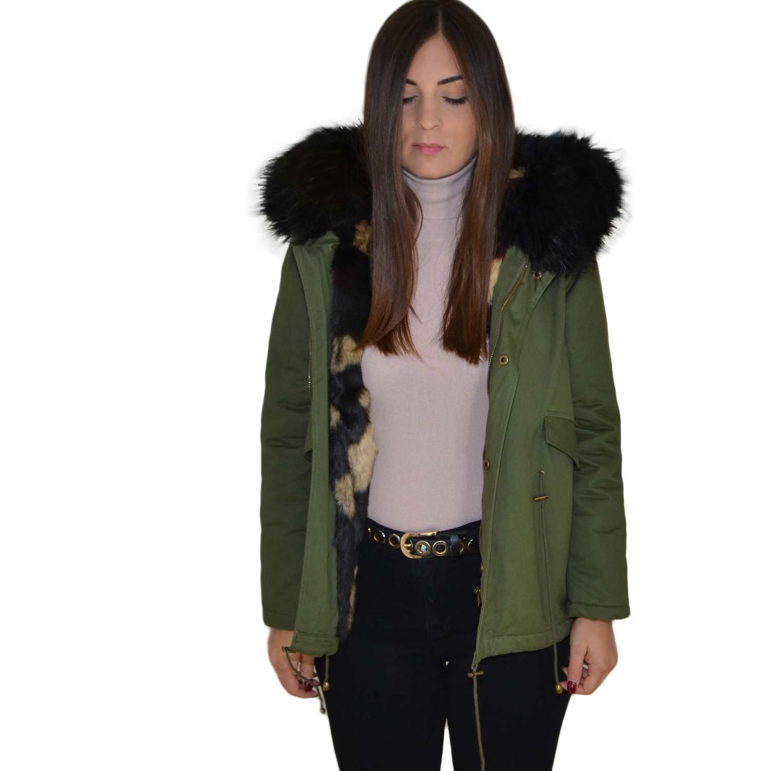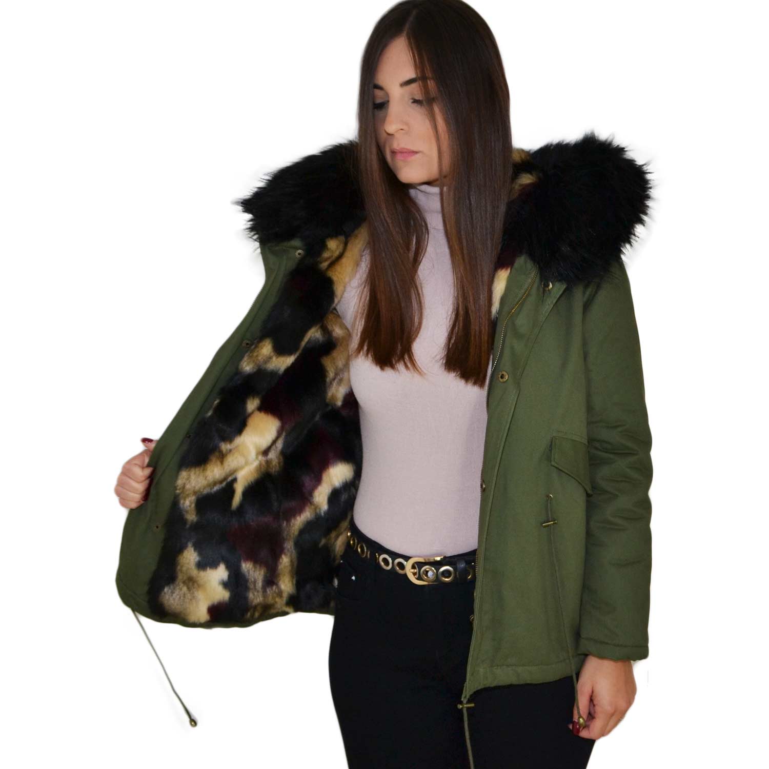 Parka donna corto verde con pelliccia nera multicolor voluminosa glamour