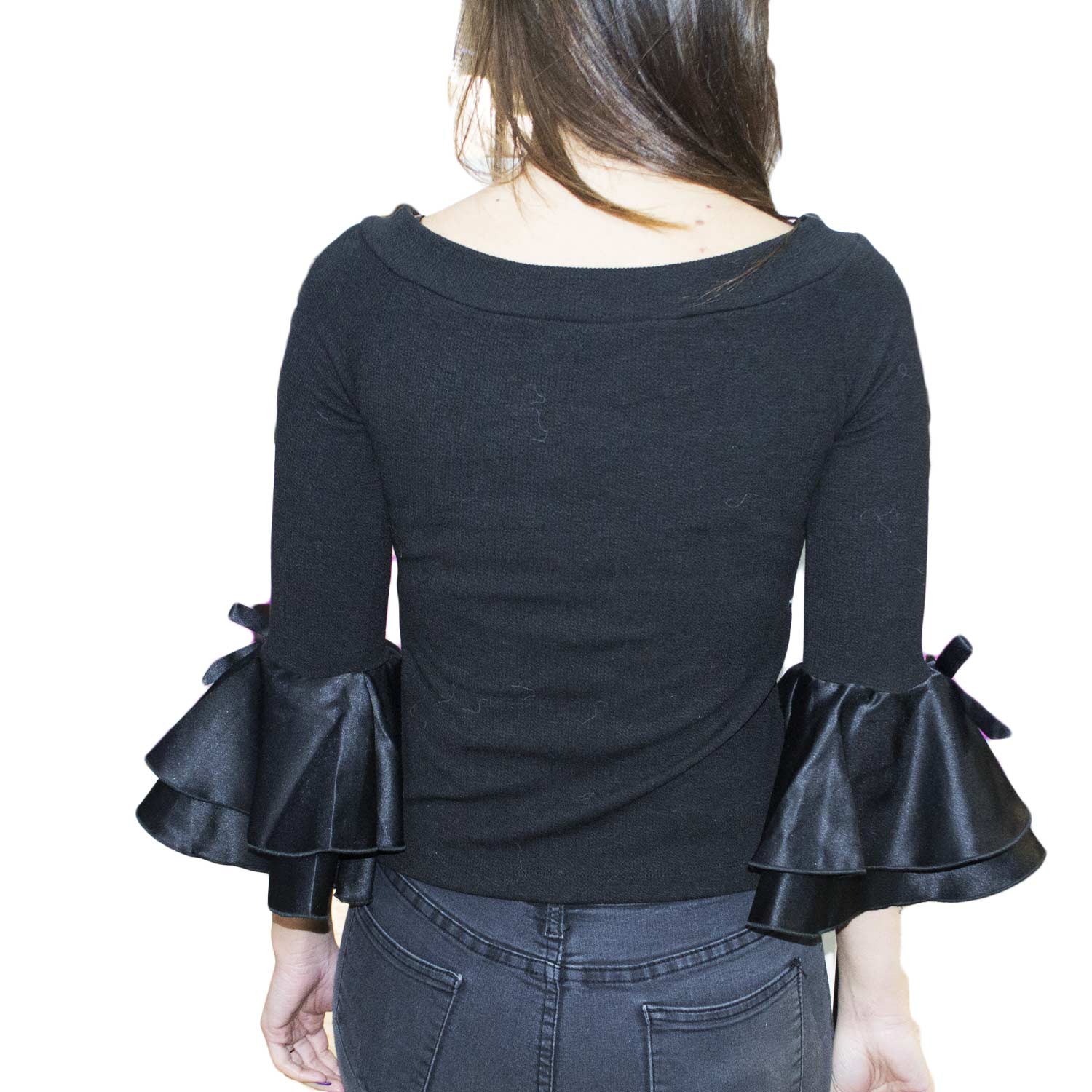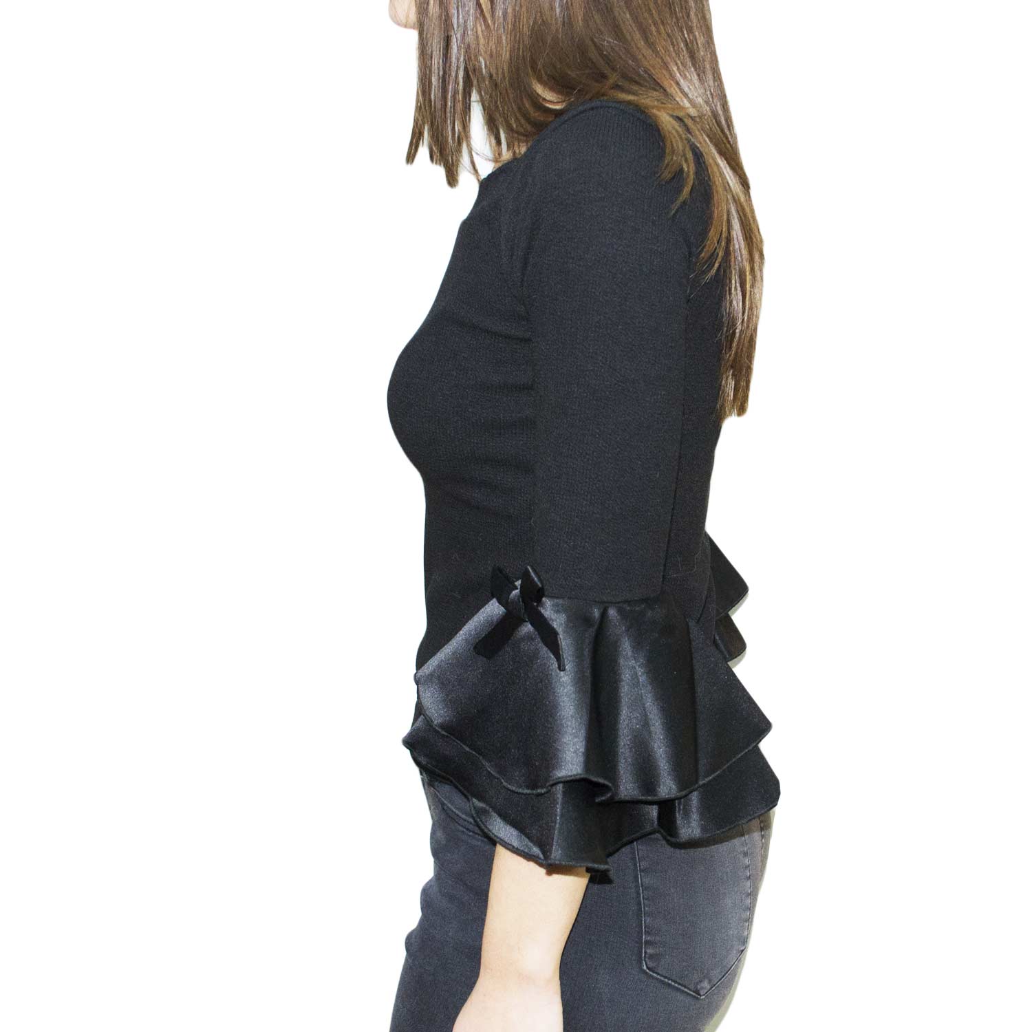 Maglia nera scollo a barca manica a campana cotone e raso elegante anni 30 glamour vintage
