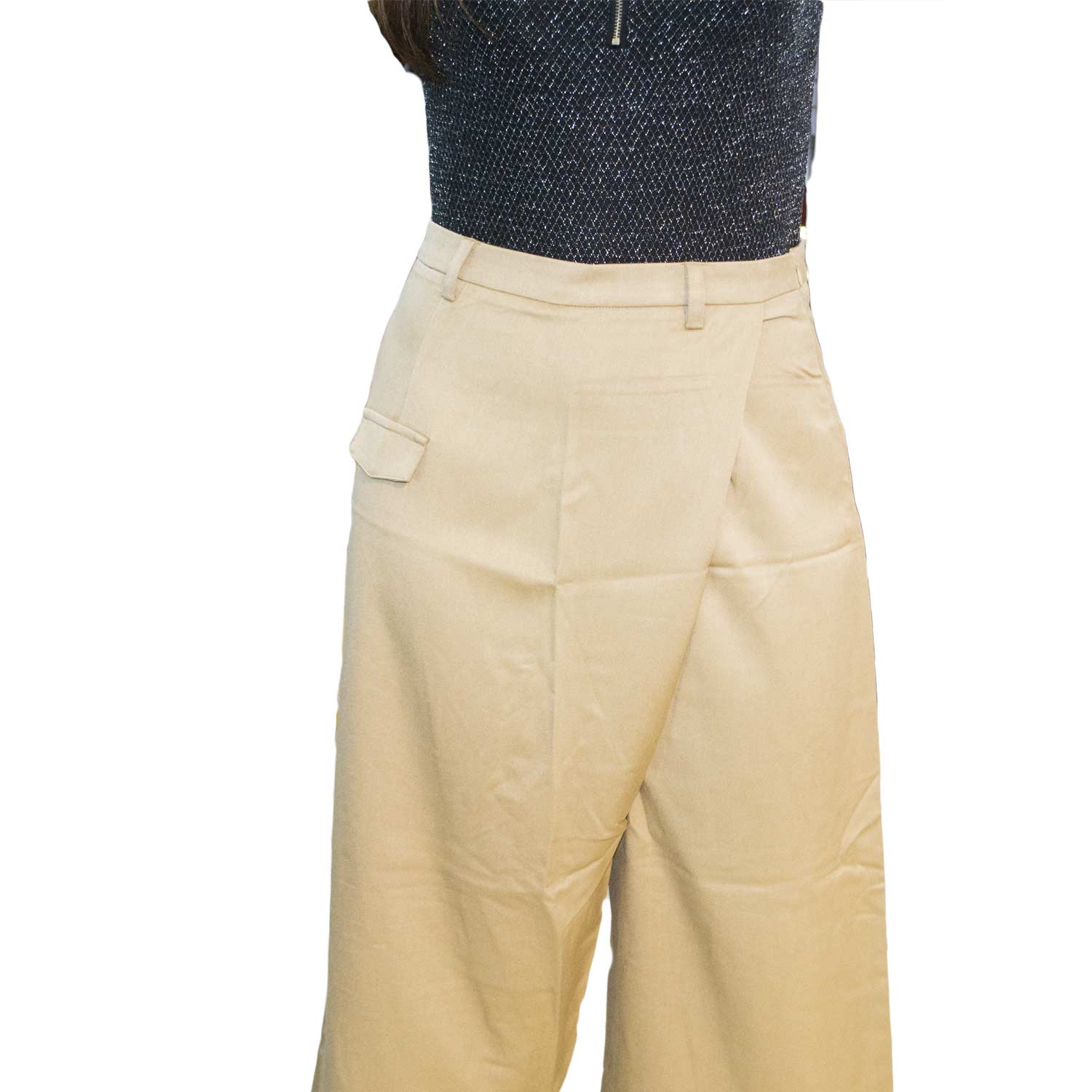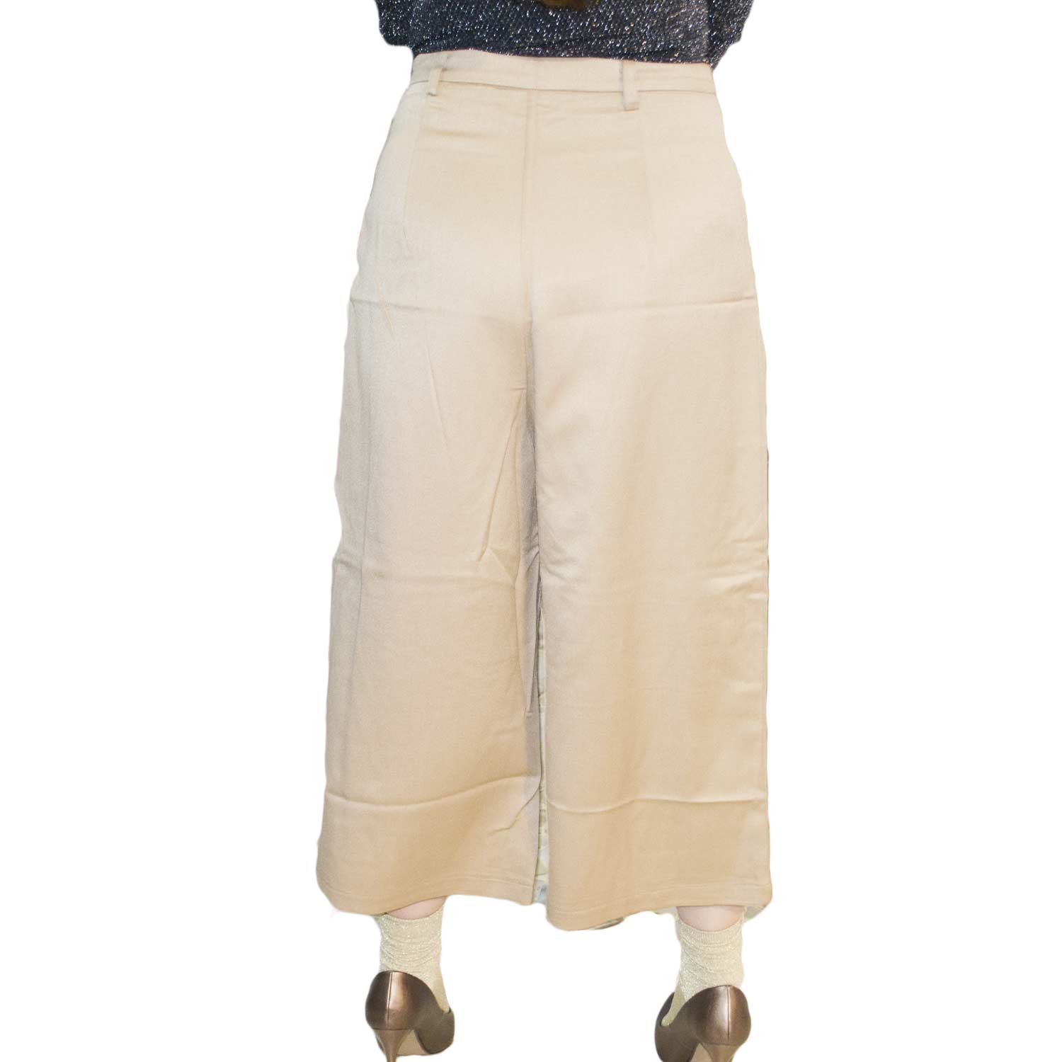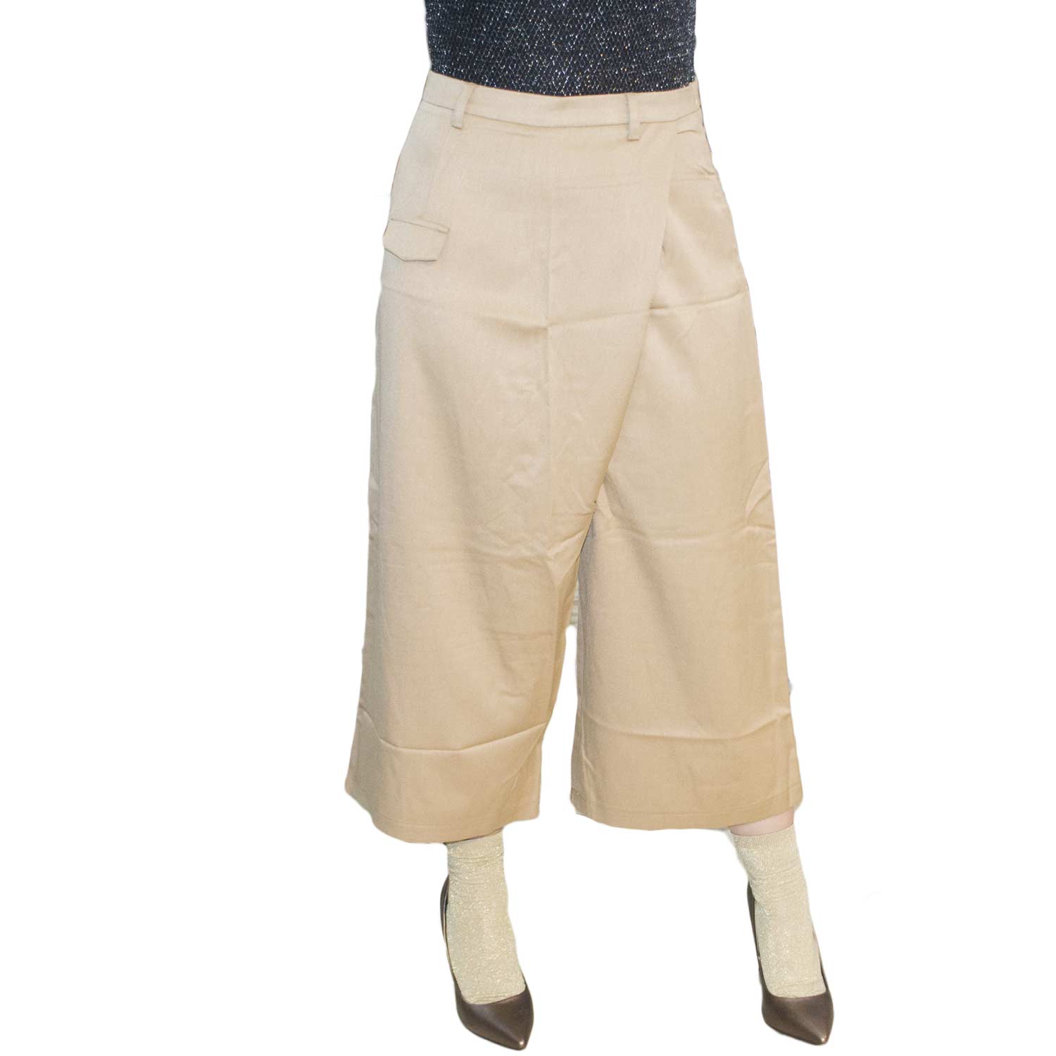 Pantagonna culotte camel taglio trasversale abbottonatura glam linea palazzo a tre quarti