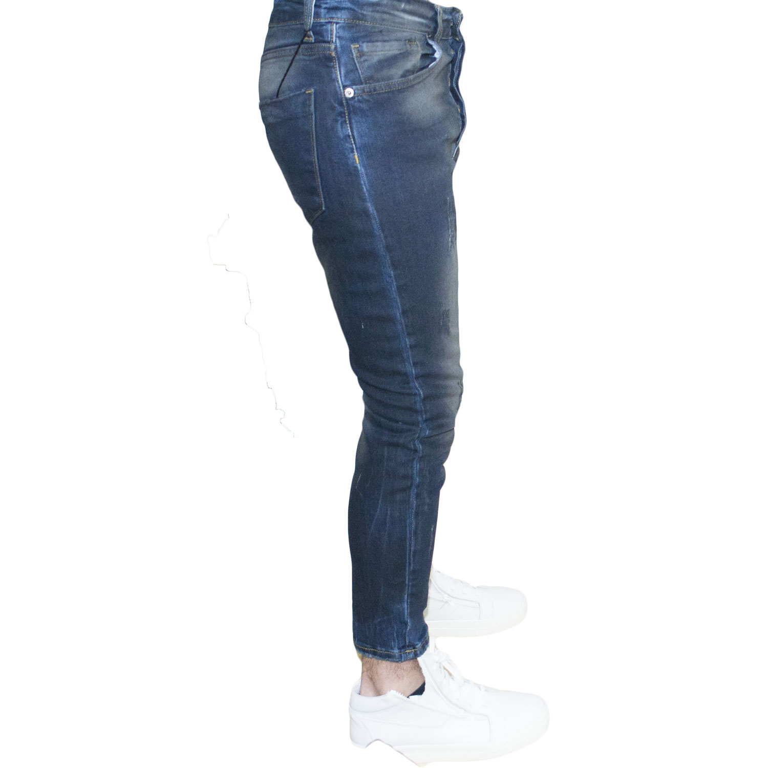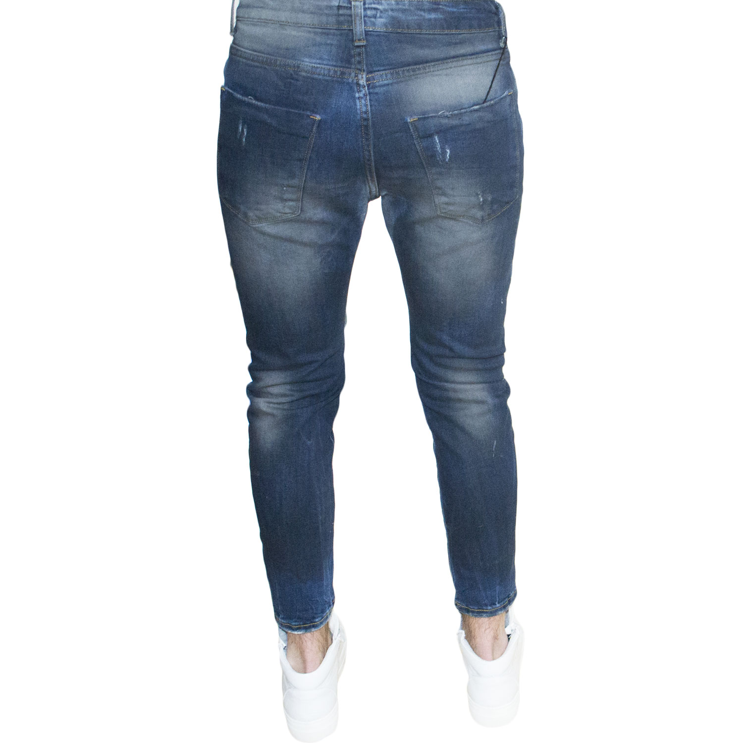 Pantaloni Jeans 5465 lavaggio scuro sfumato denim Skinny Fit con strappi. Chiusura con bottone e cerniera. Cinque tasche.