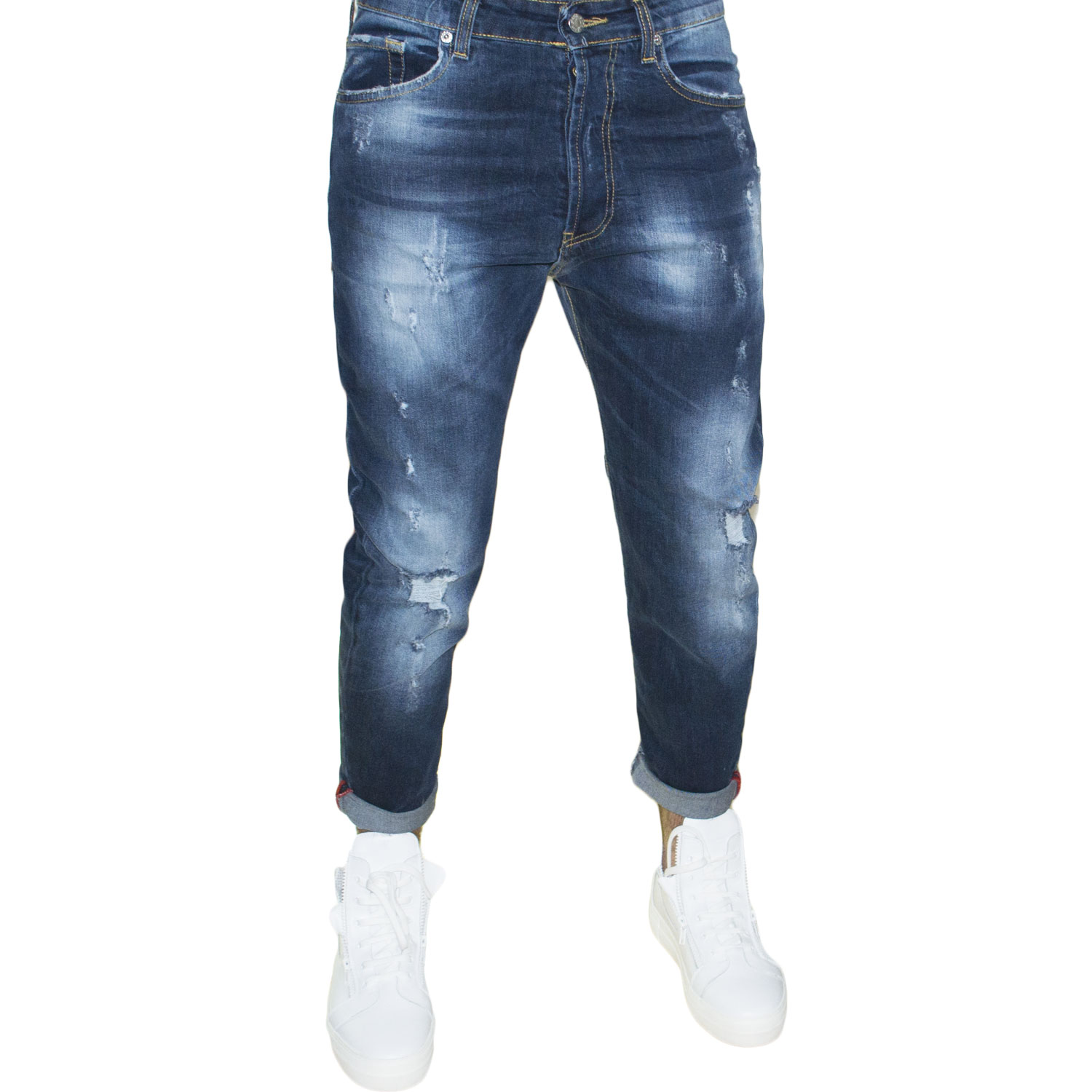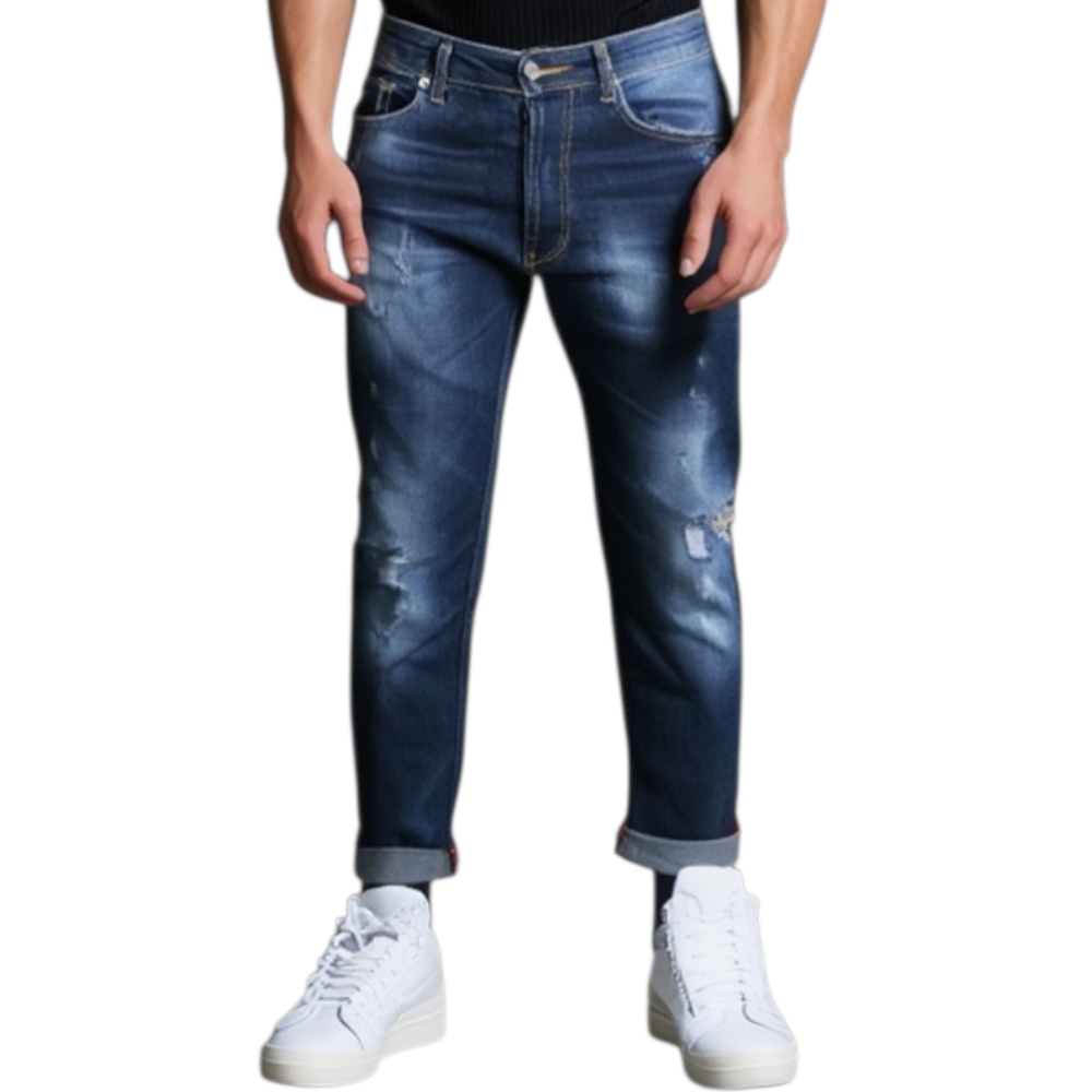Pantaloni denim 9023 raw edge Skinny fit. Chiusura con bottone e cerniera. Cinque tasche. Strappi sul ginocchio.