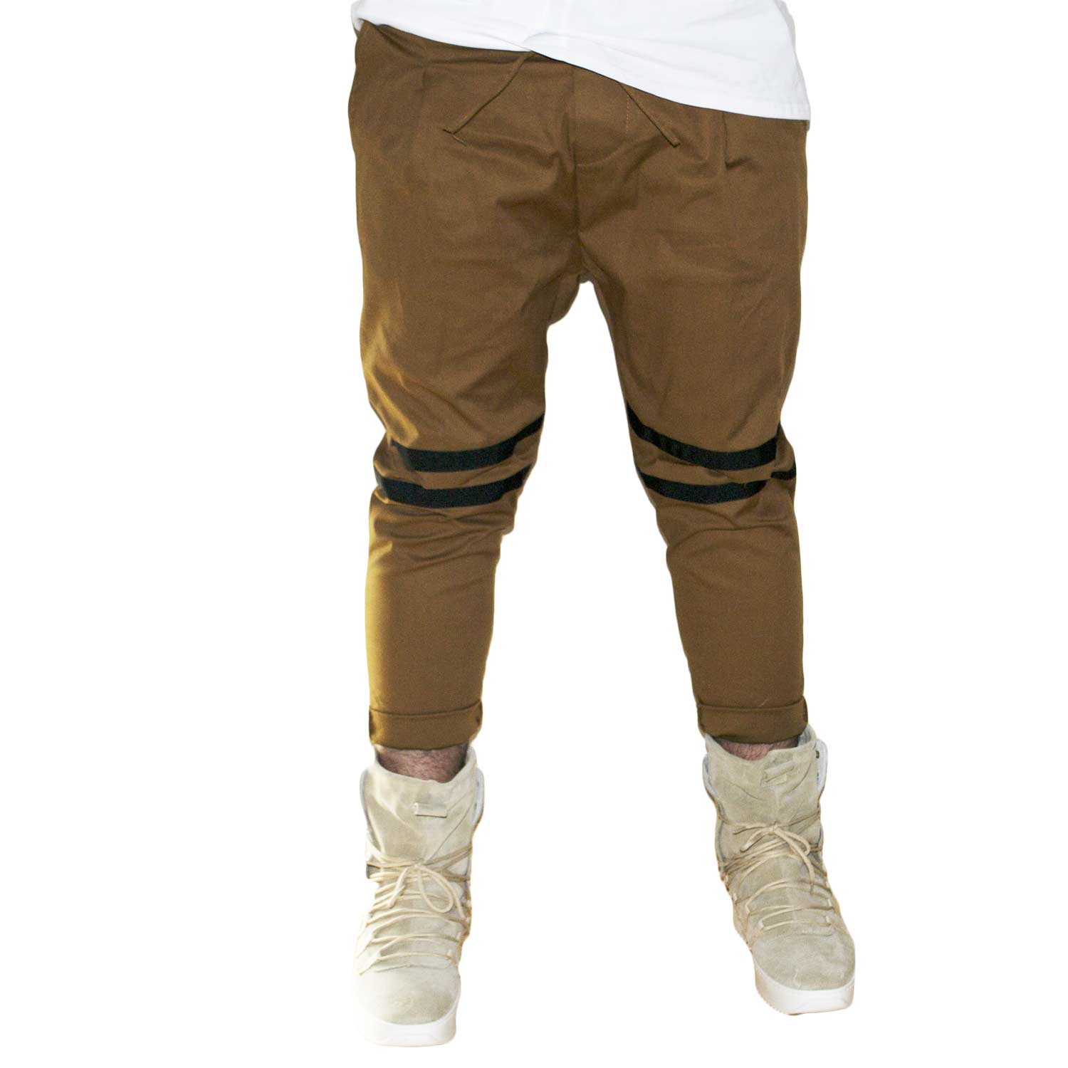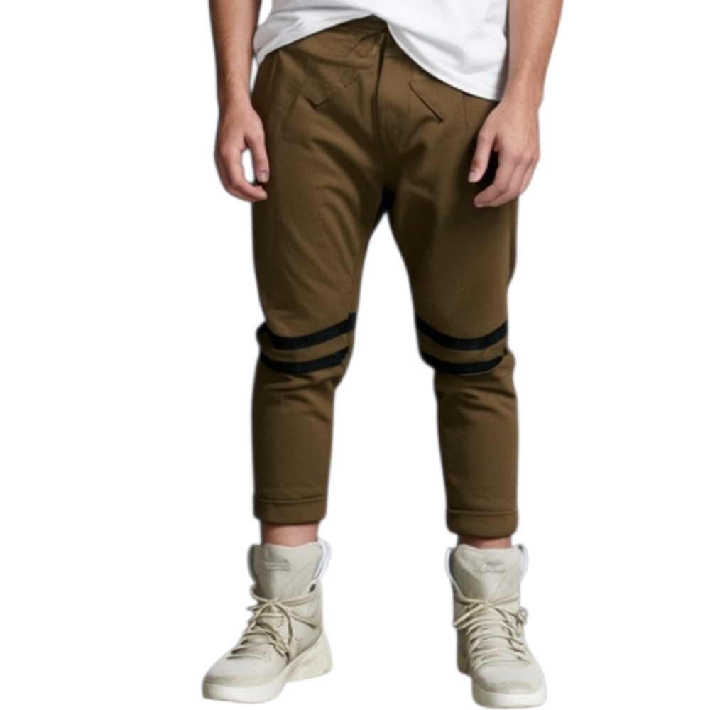 Pantaloni jogger marroni con elastico e coulisse e tasche laterali strappi sul ginocchio striscia nera moda giovane
