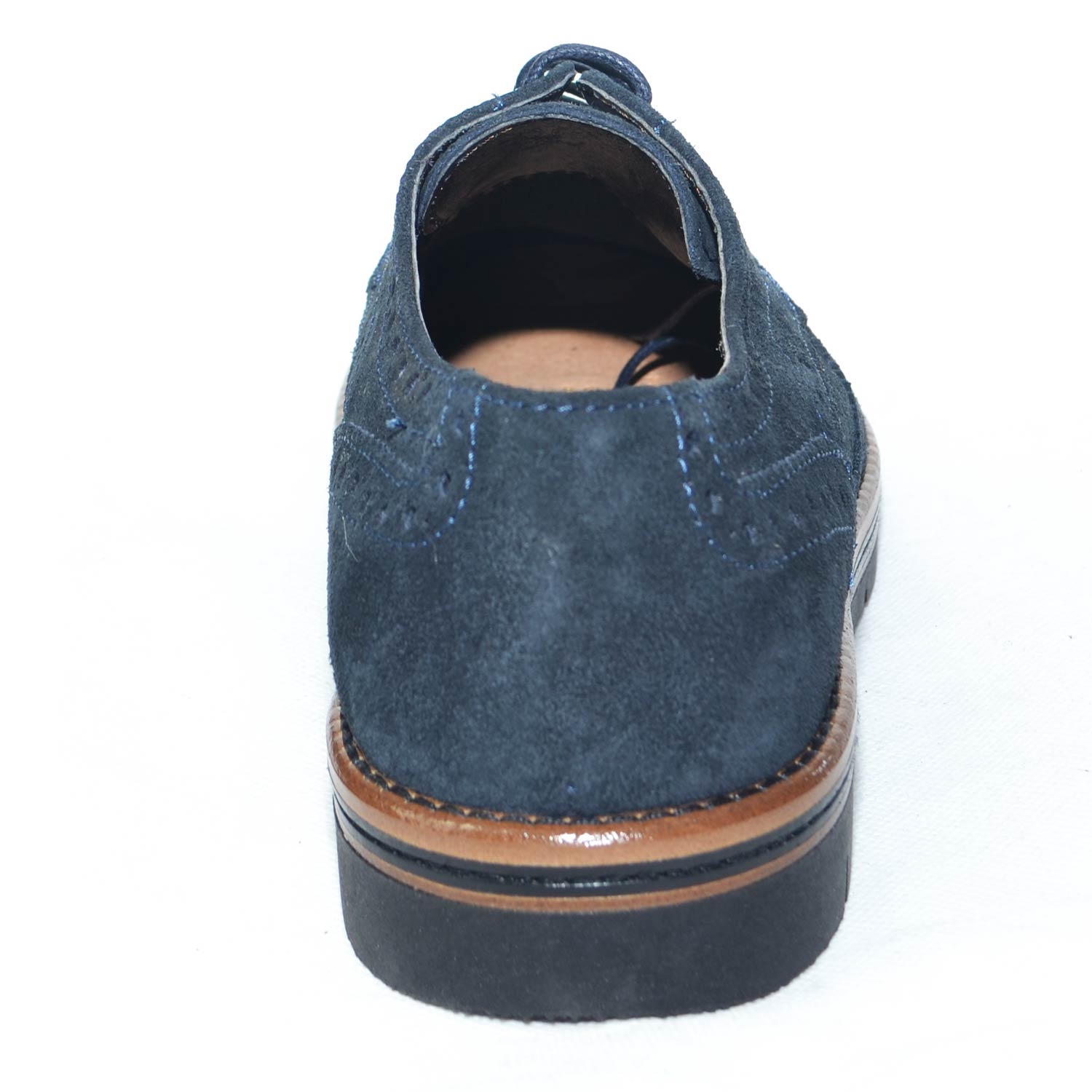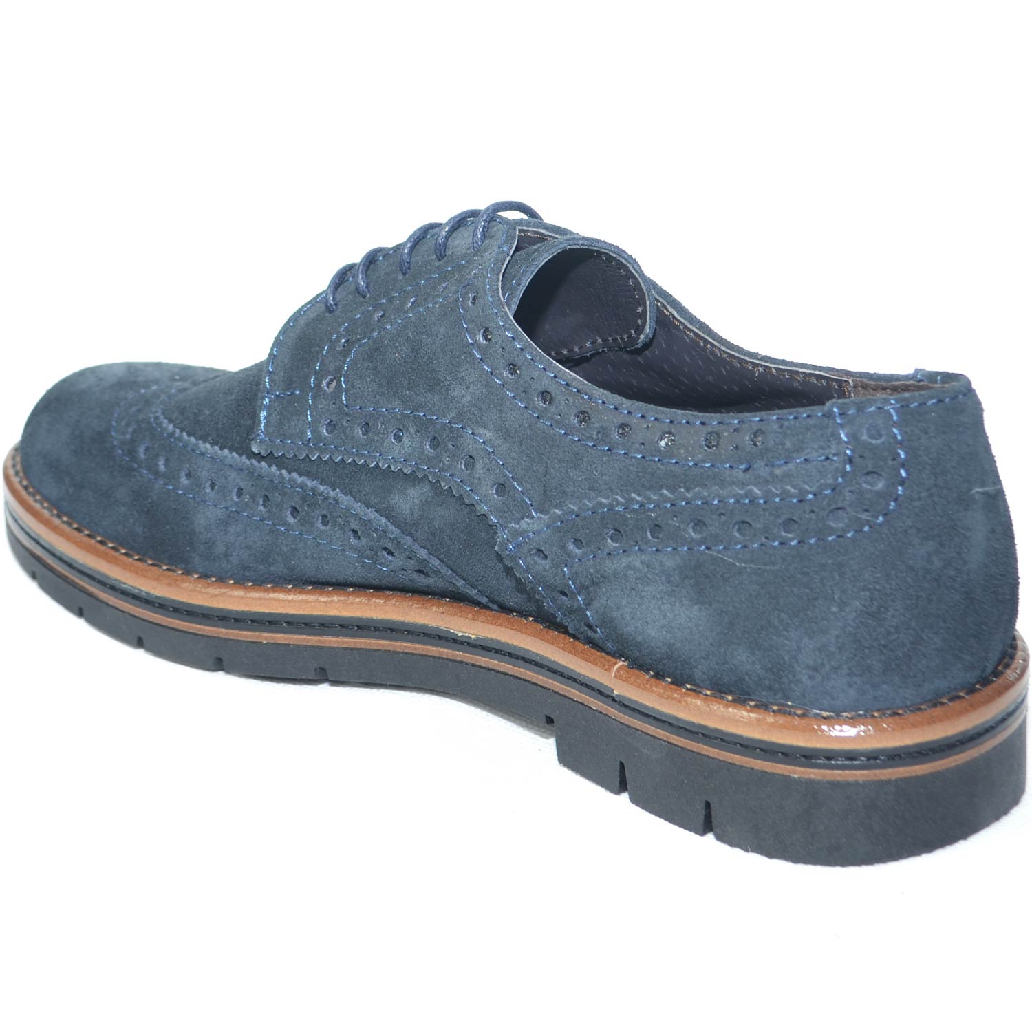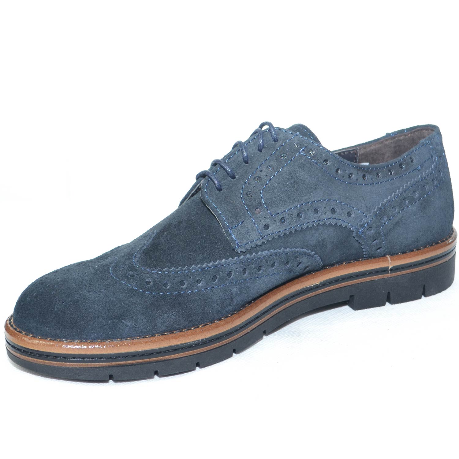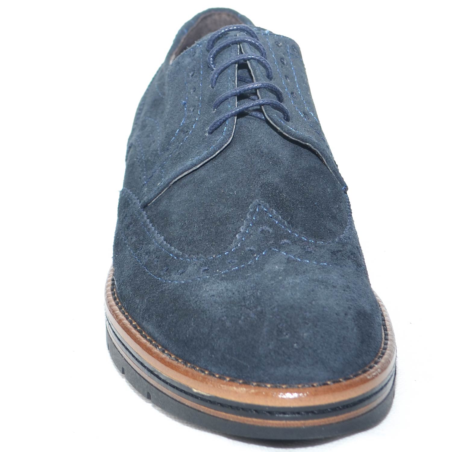 Scarpe francesina uomo stringata vera pelle abrasivato blu suola in gomma light zigrinata alta.