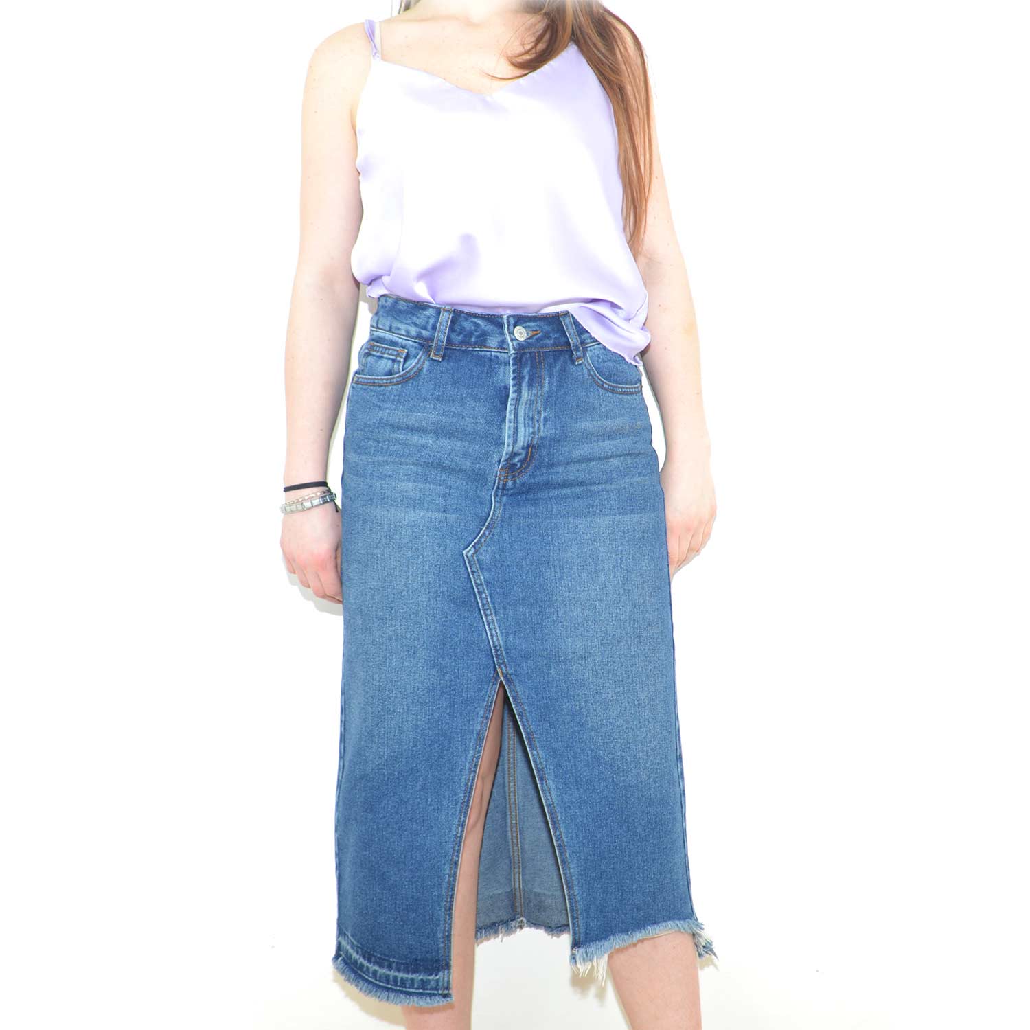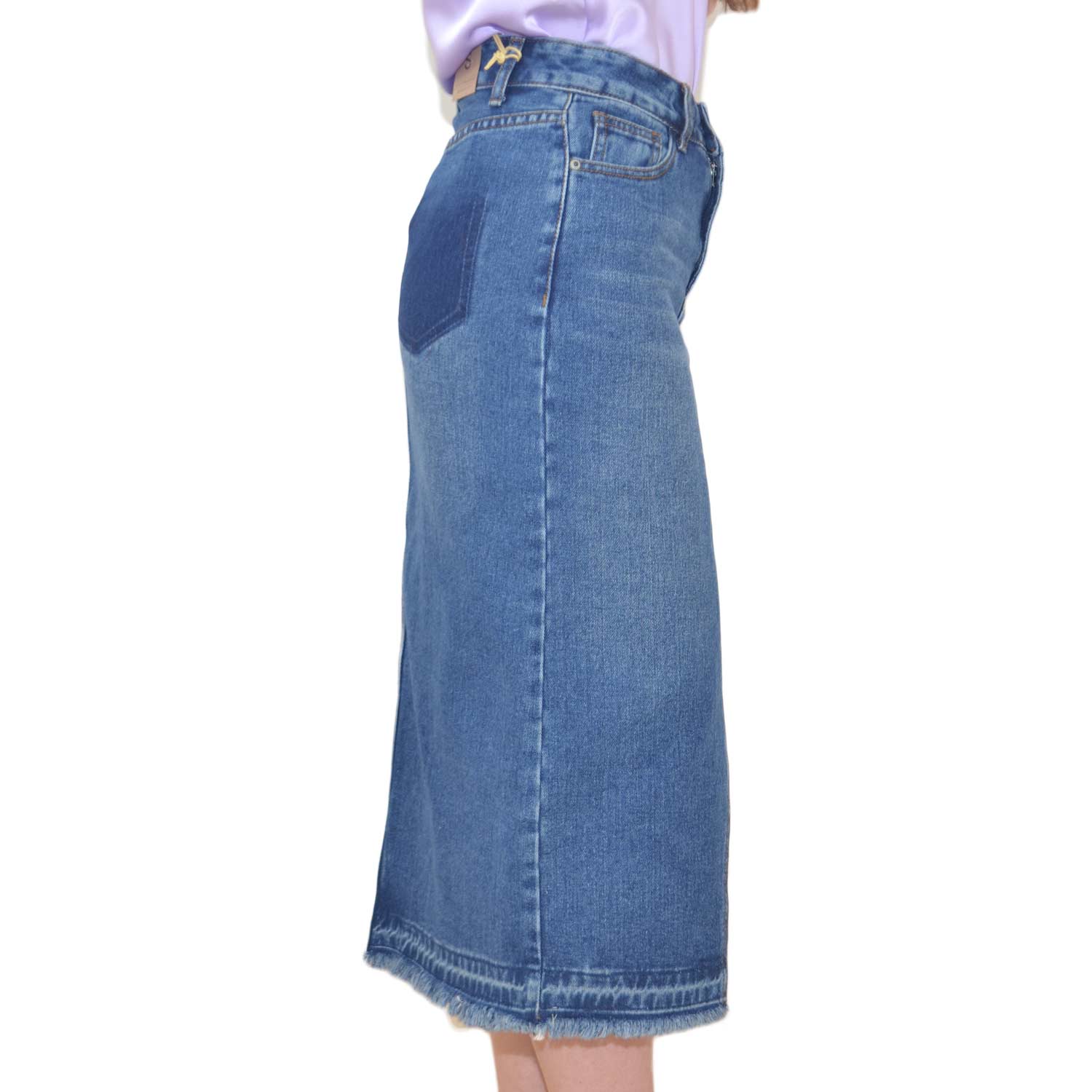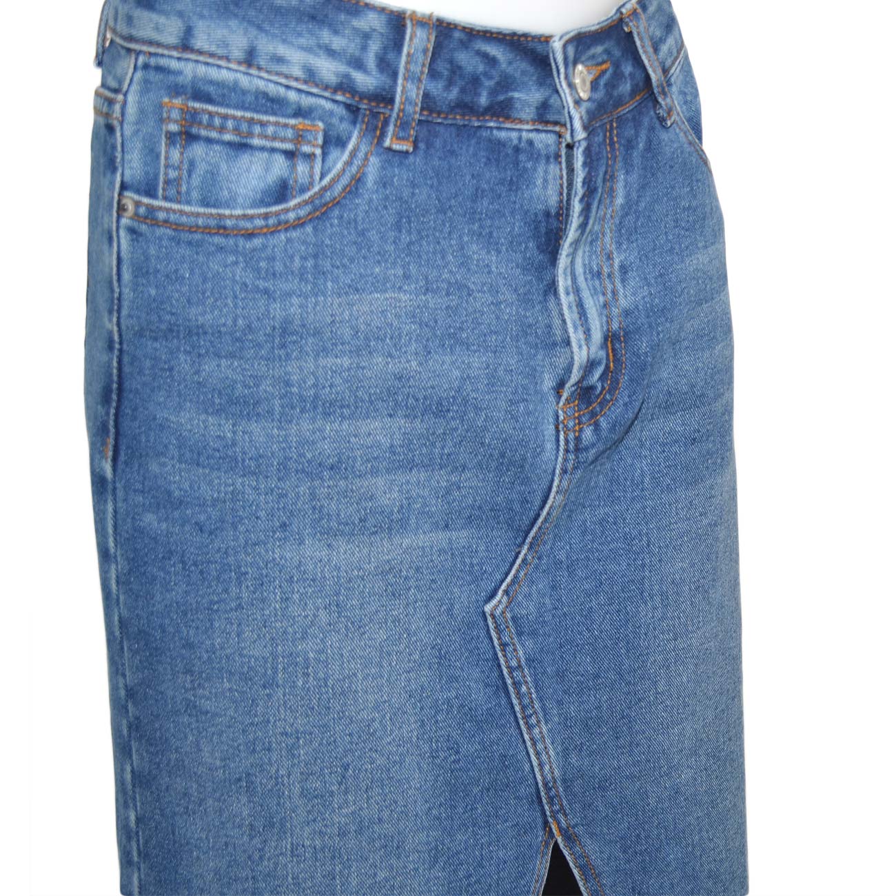 STILE: questa gonna basic in jeans si presenta sobria ed elegante. La lunghezza media e il lavaggio alla moda creano un look adatto a qualsiasi occasione. Spacco ampio presente nella parte anteriore