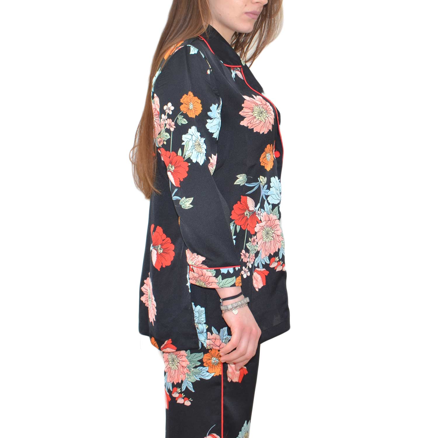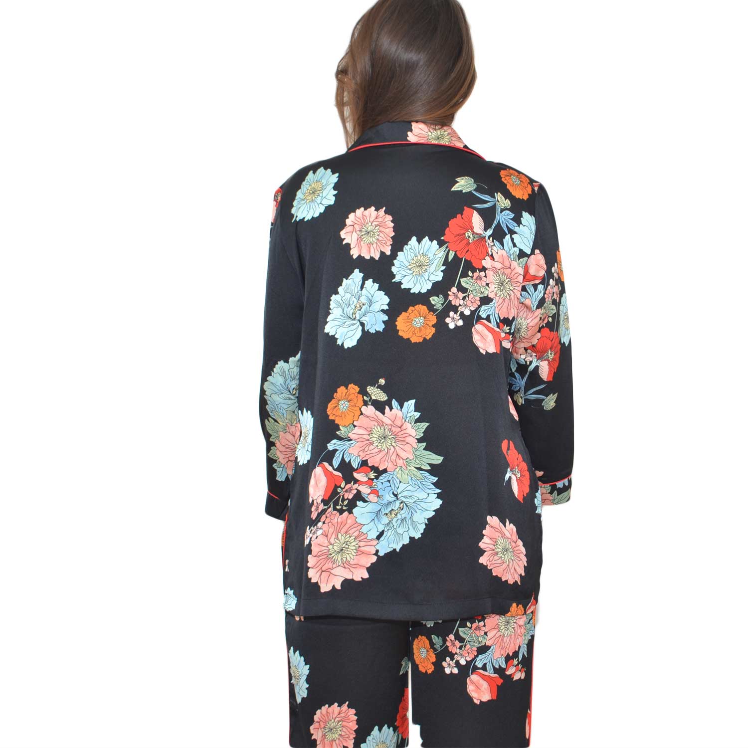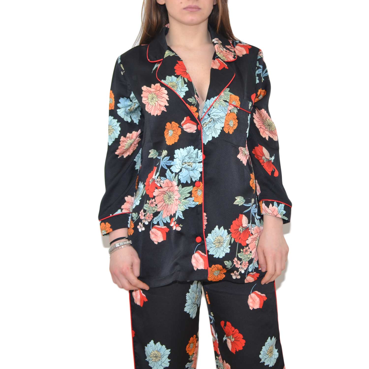Completo abito stile pigiama con pantalone giacca con bottoni, fantasia floreale colorata moda glamour