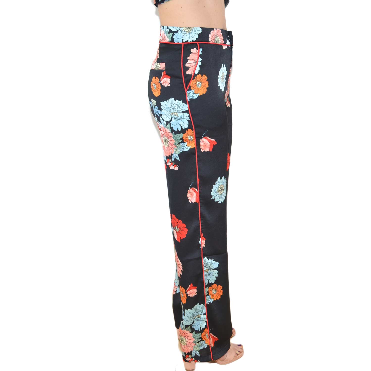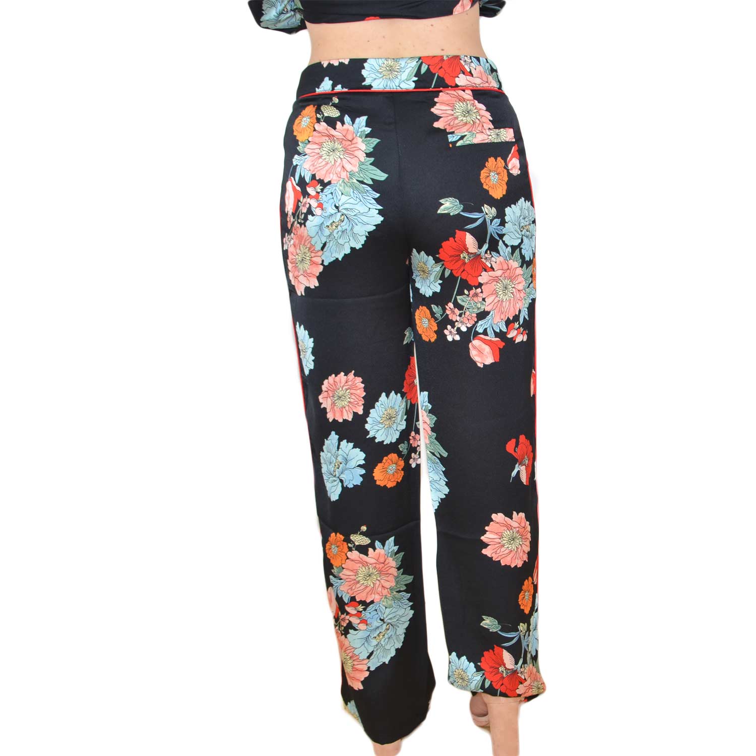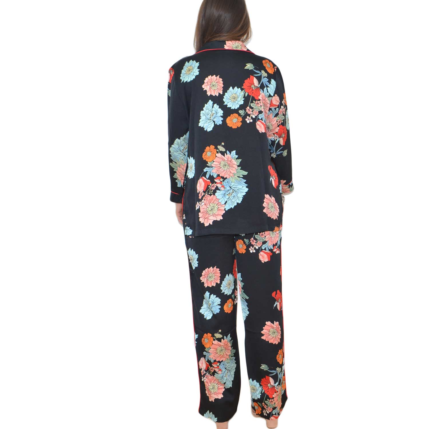 Completo abito stile pigiama con pantalone giacca con bottoni, fantasia floreale colorata moda glamour