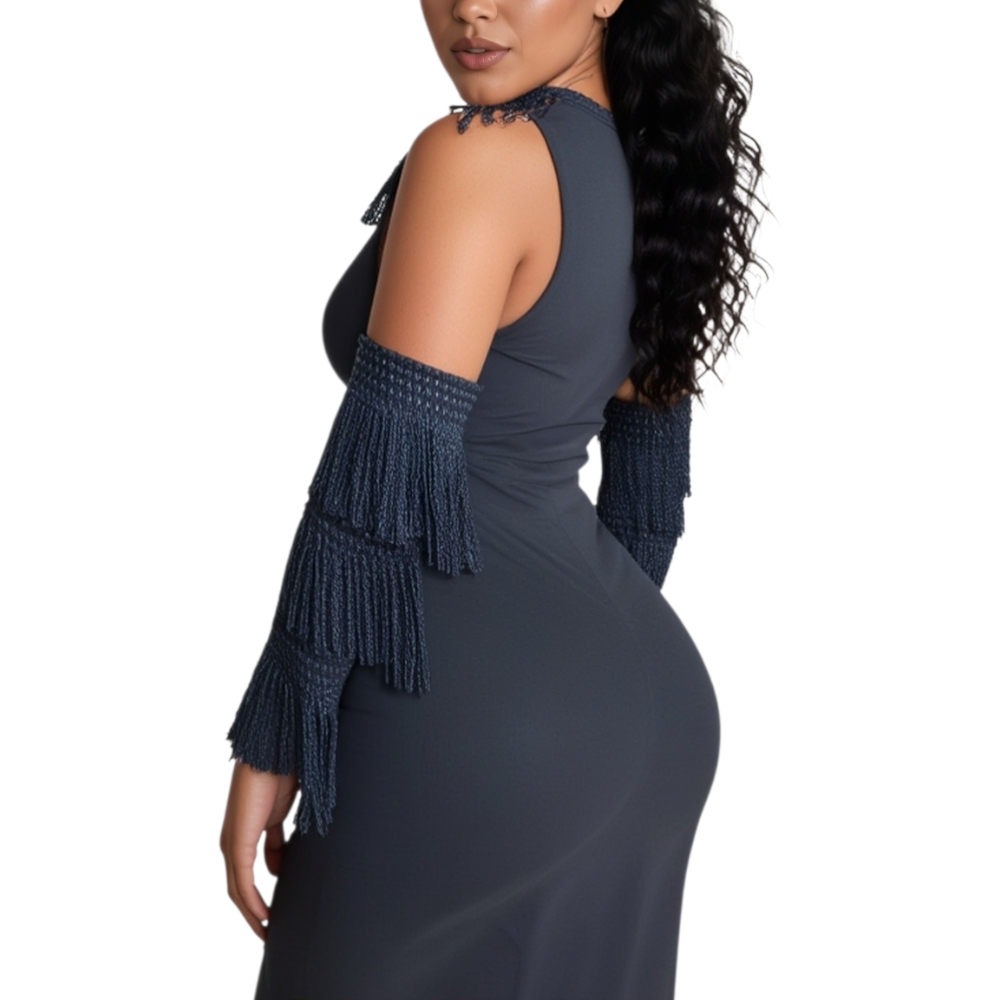 Abito charleston a frange con scollo imperiale, maniche staccate, vestibilità slim, gonna a tubino, spacco sul retro.