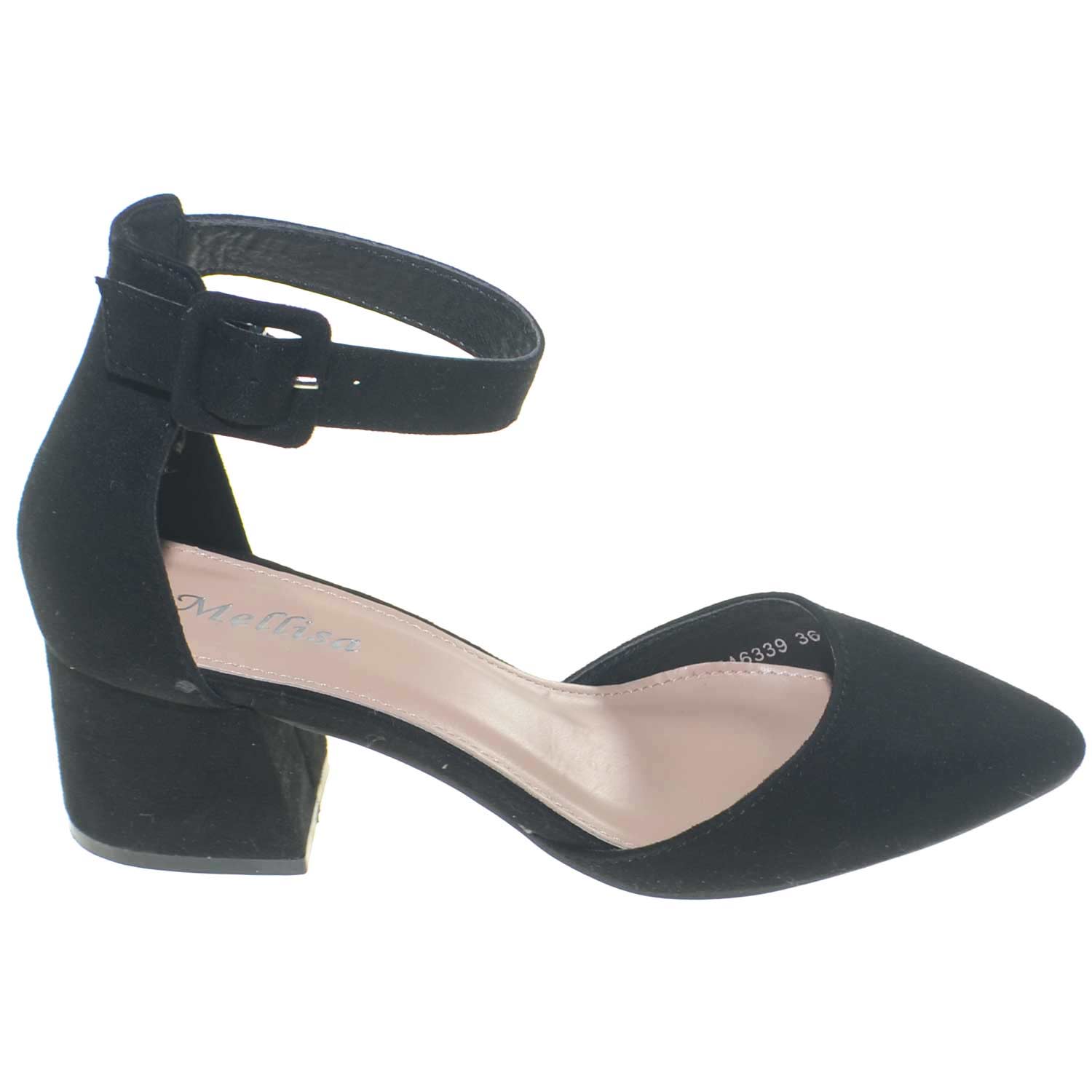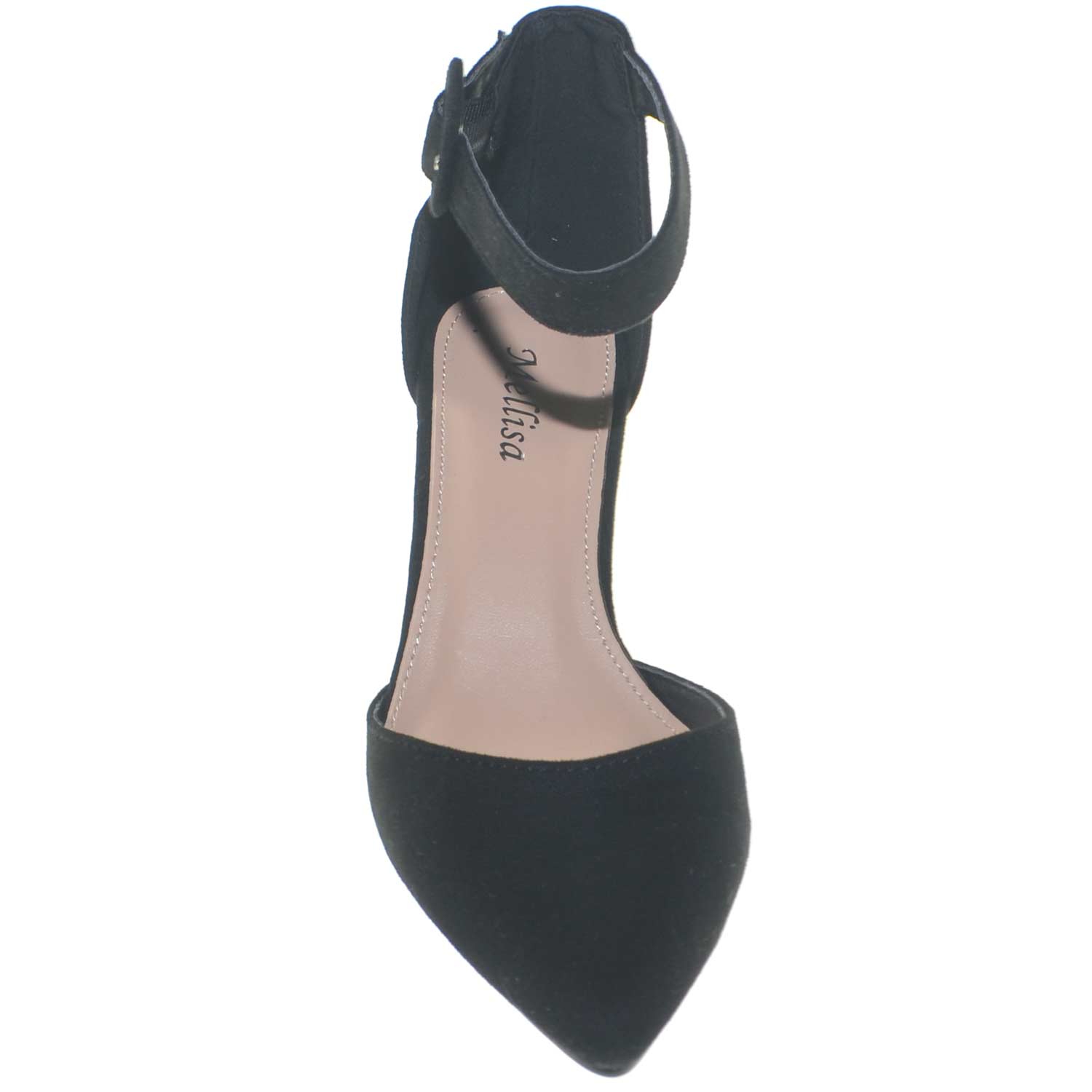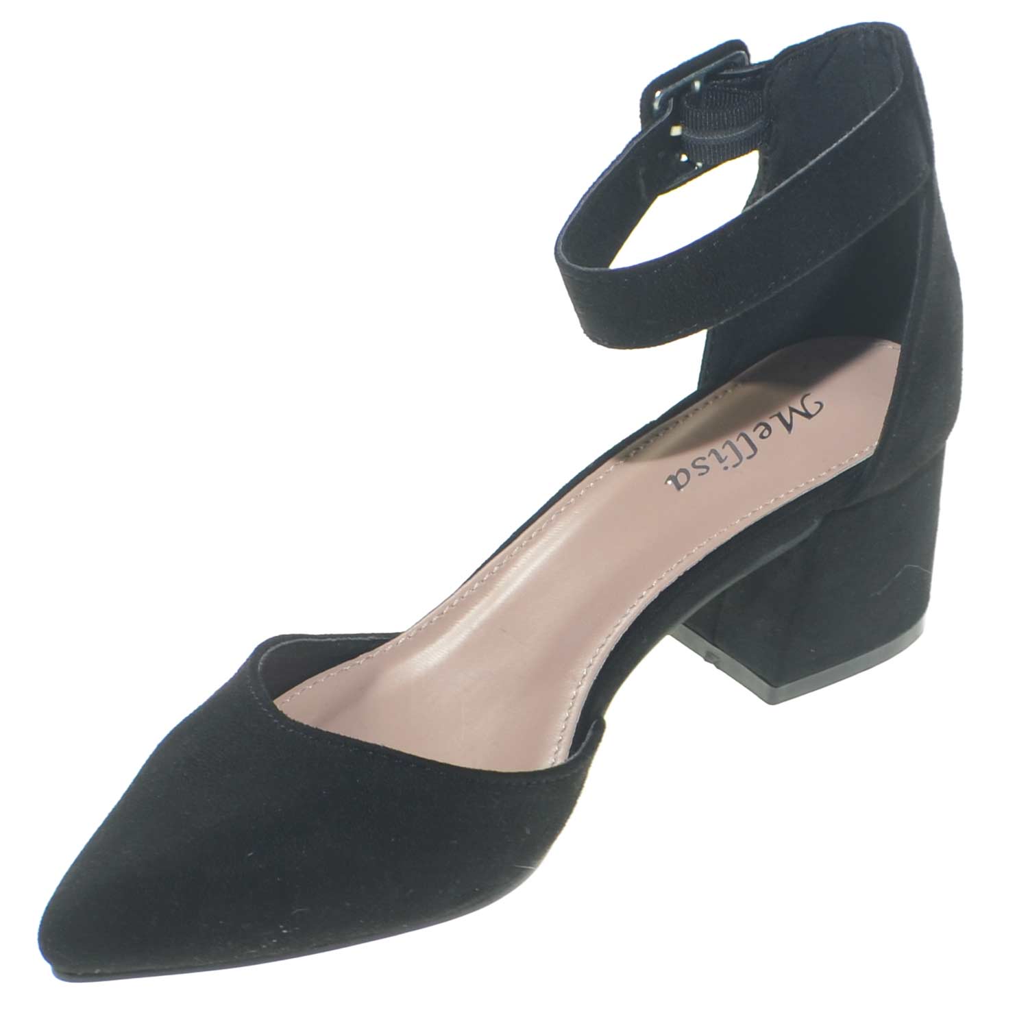 Sandalo tacco comfort aperto a punta in camoscio nero con tacco e cinturino alla caviglia glamour