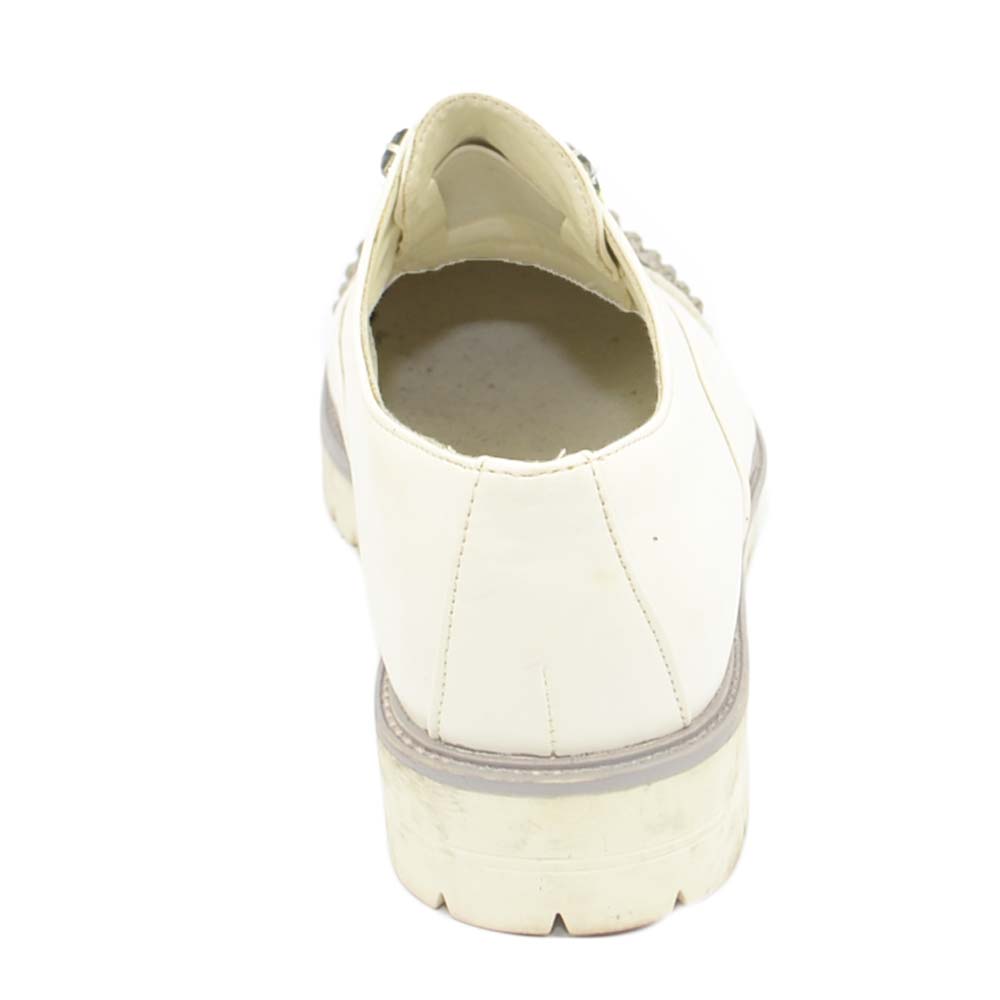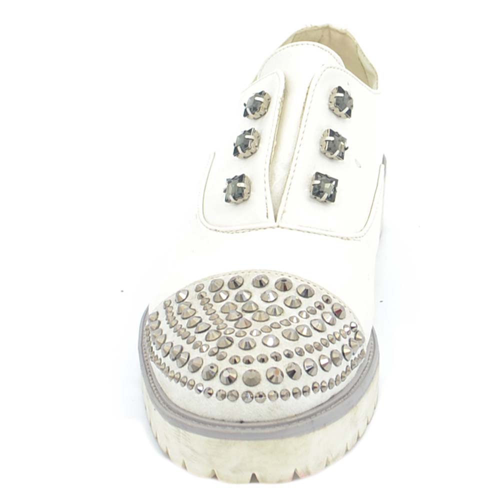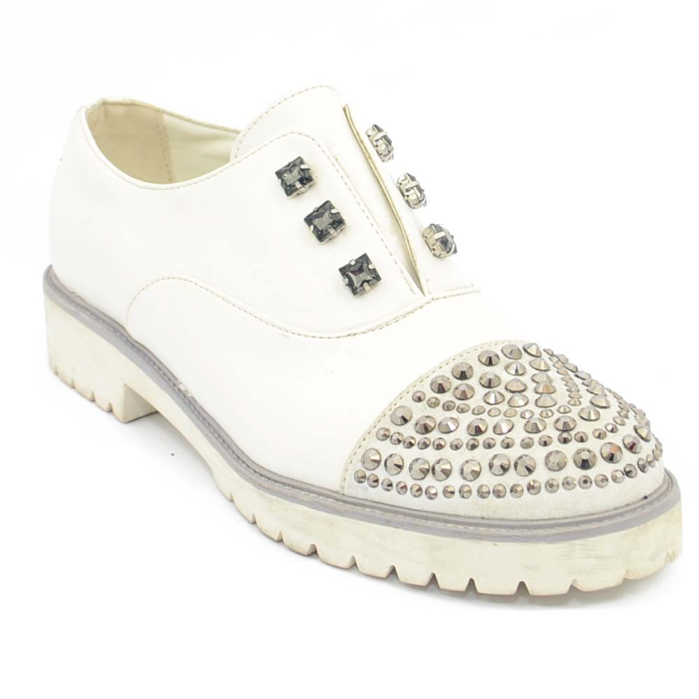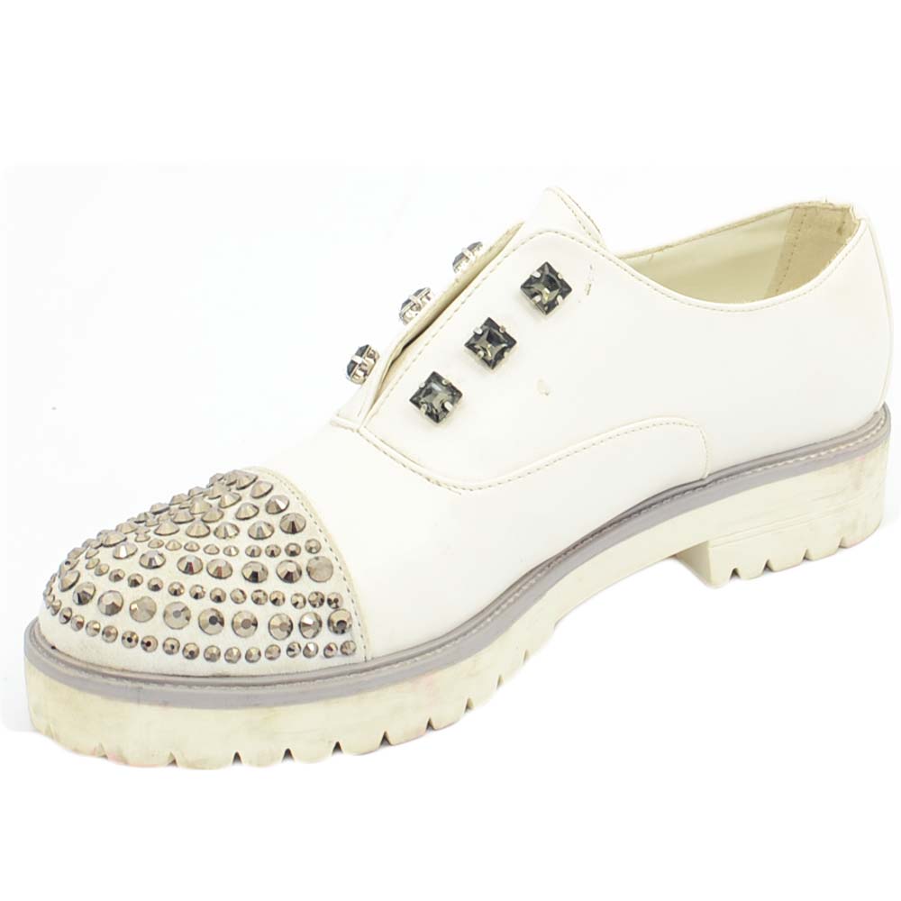 Scarpe francesina donna bianche senza lacci con borchie e strass in punta punta tonda vintage gomma comfort linea basic