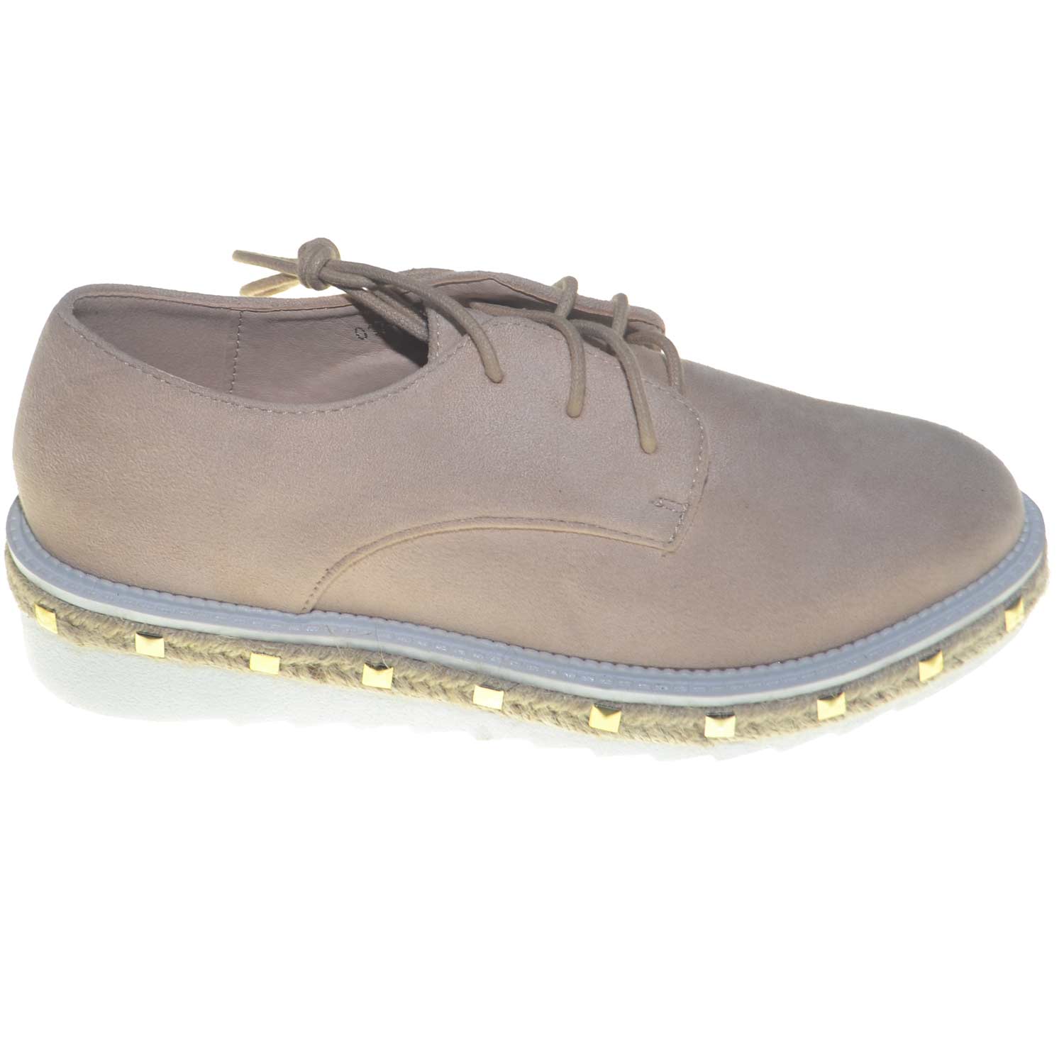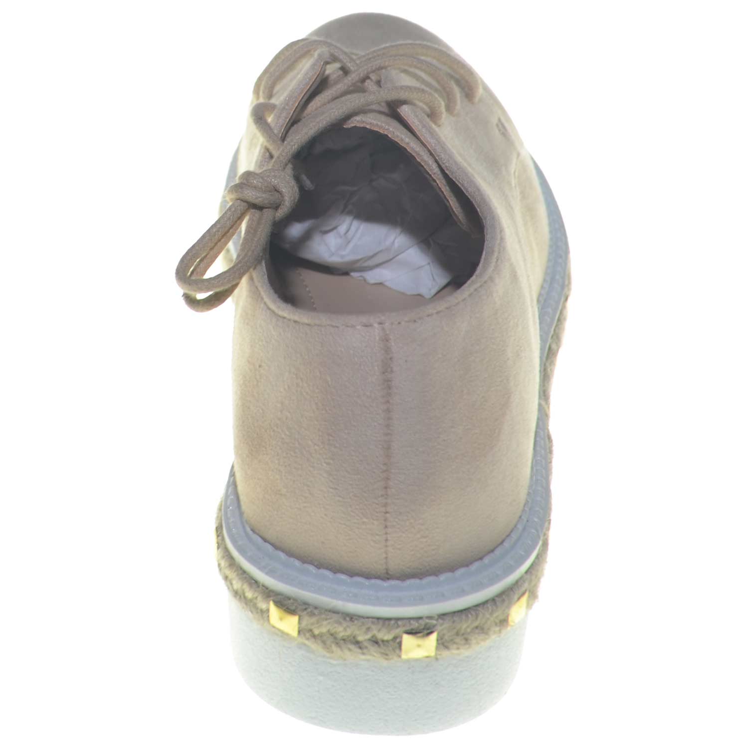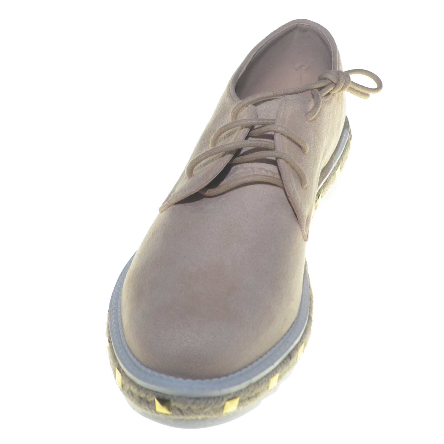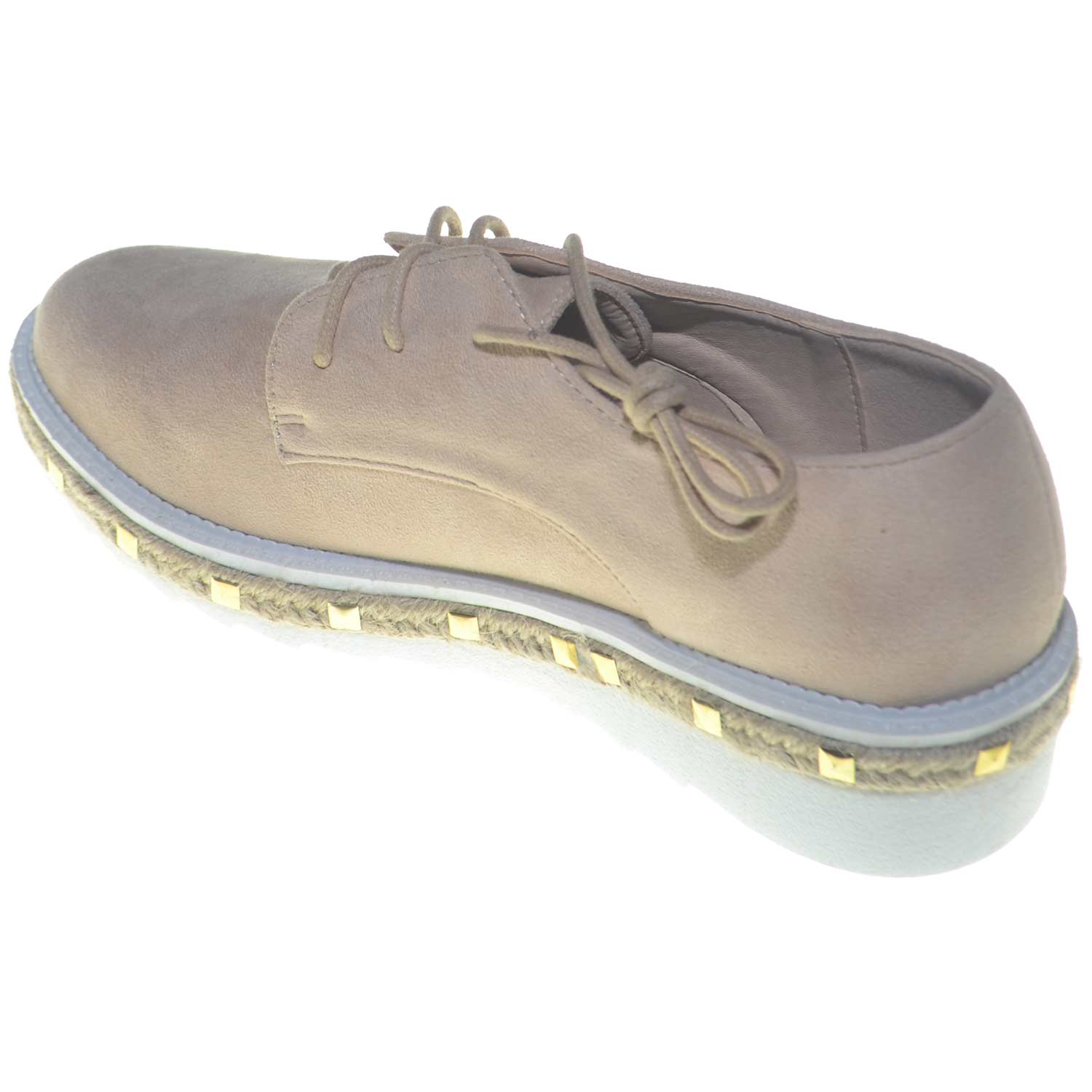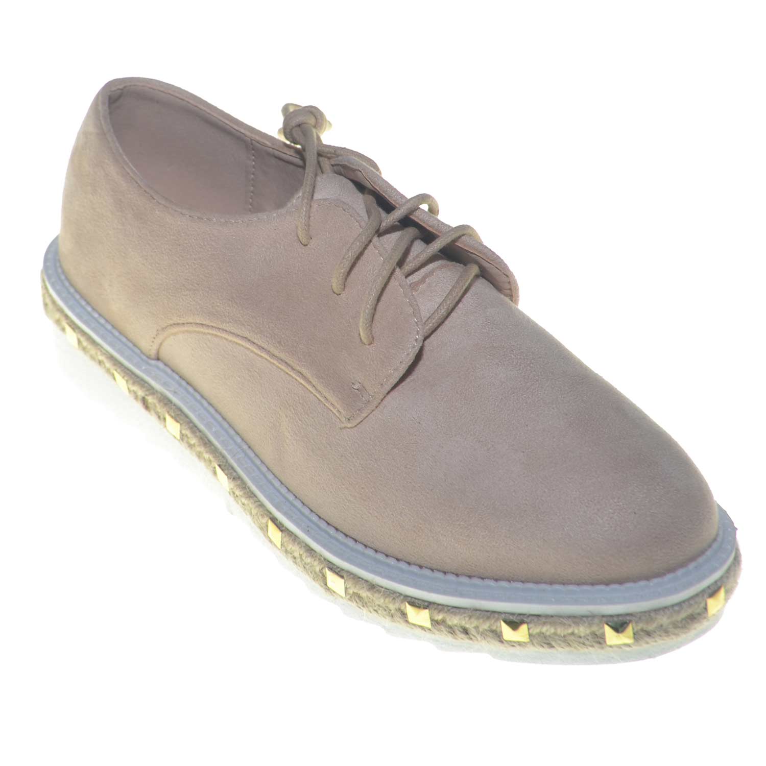 Descrizione: Borchie su entrambi i lati, cuciture a vista, lacci in cordino, tessuto effetto scamosciato, tacco alto 3 cm.