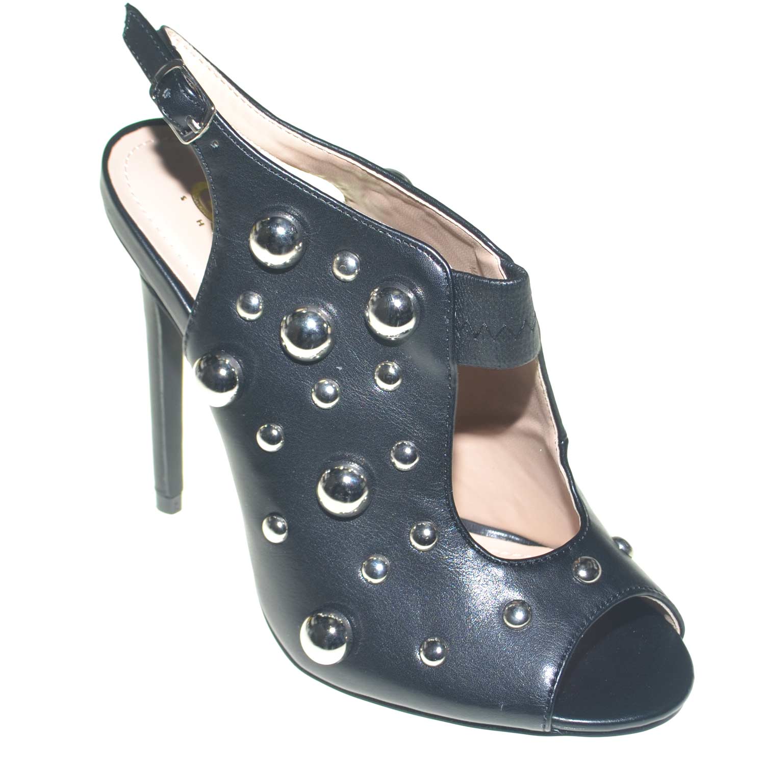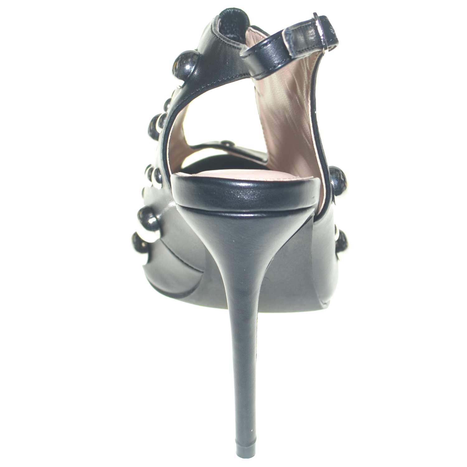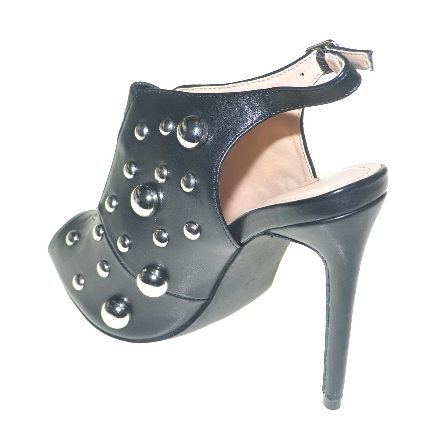 Sandalo nero donna con allacciatura cinturino open toe e plateau applicazioni con borchioni tacco a spillo