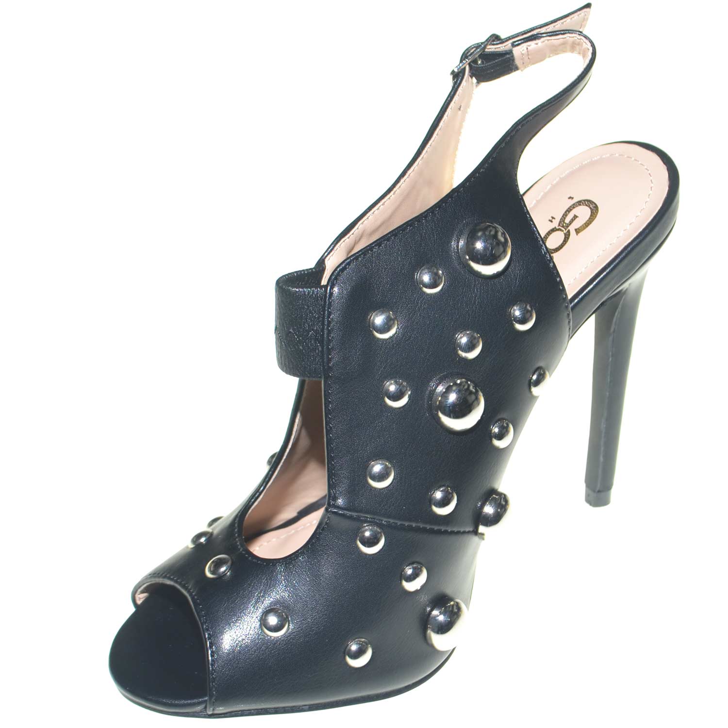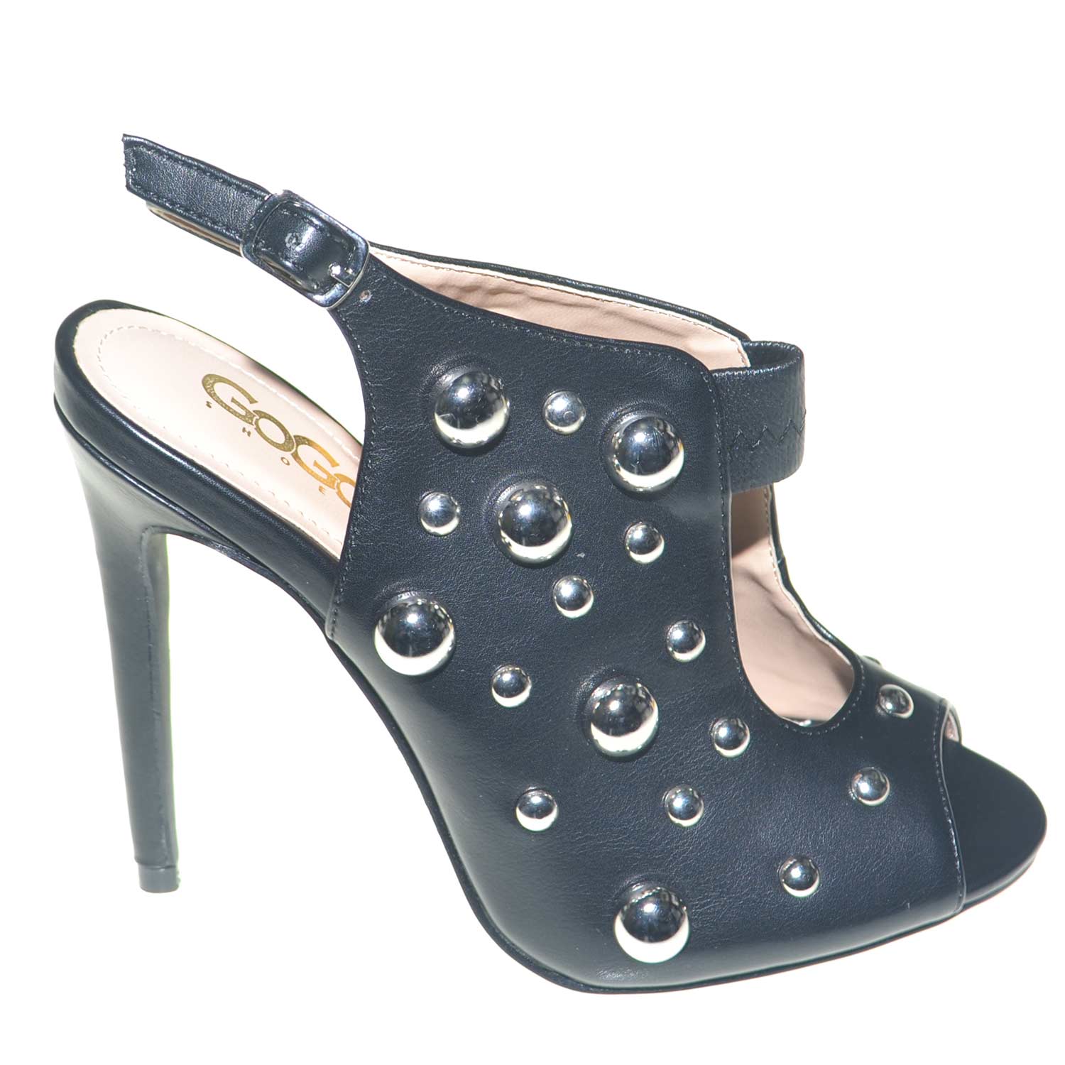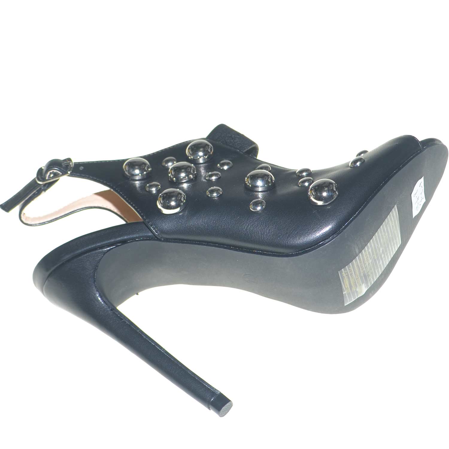 Sandalo nero donna con allacciatura cinturino open toe e plateau applicazioni con borchioni tacco a spillo
