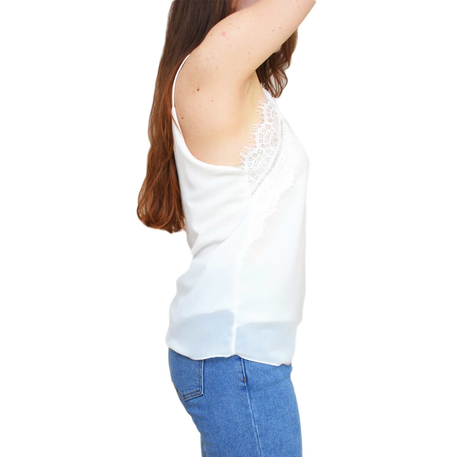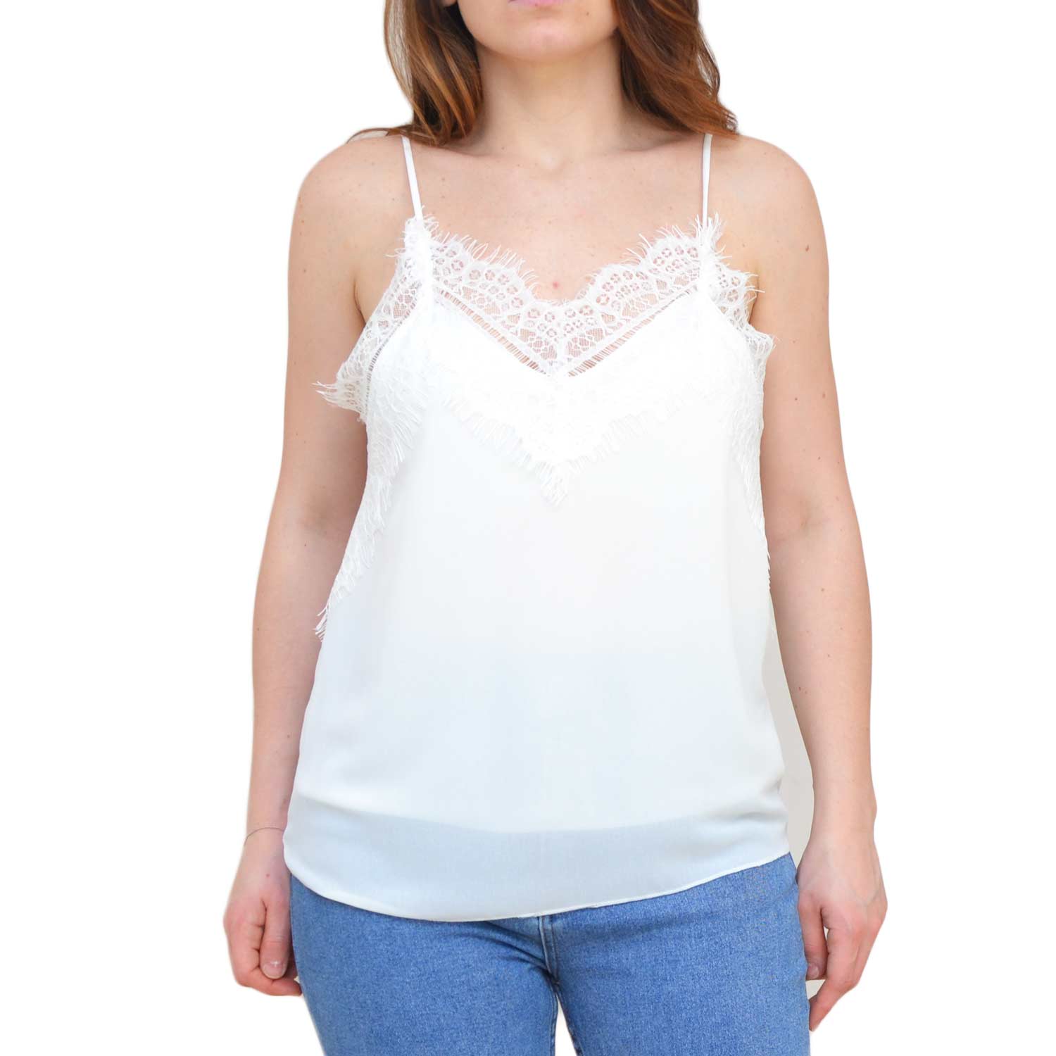 Top sottogiacca bianco donna velato a bratelline con scollo a V e ricamo in pizzo elegante glamour moda