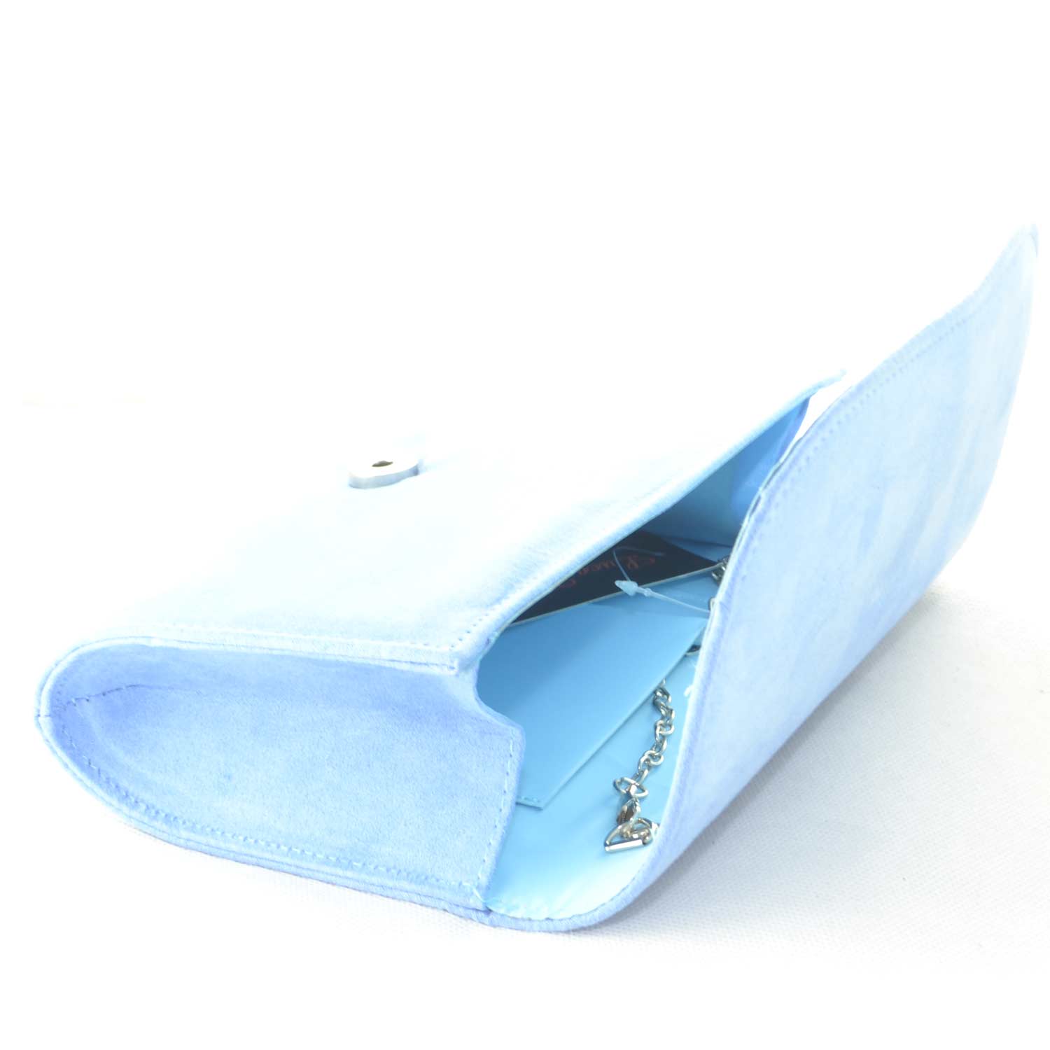 Pochette rettangolare in camoscio azzurro polvere con catena e chiusura clip linea basic