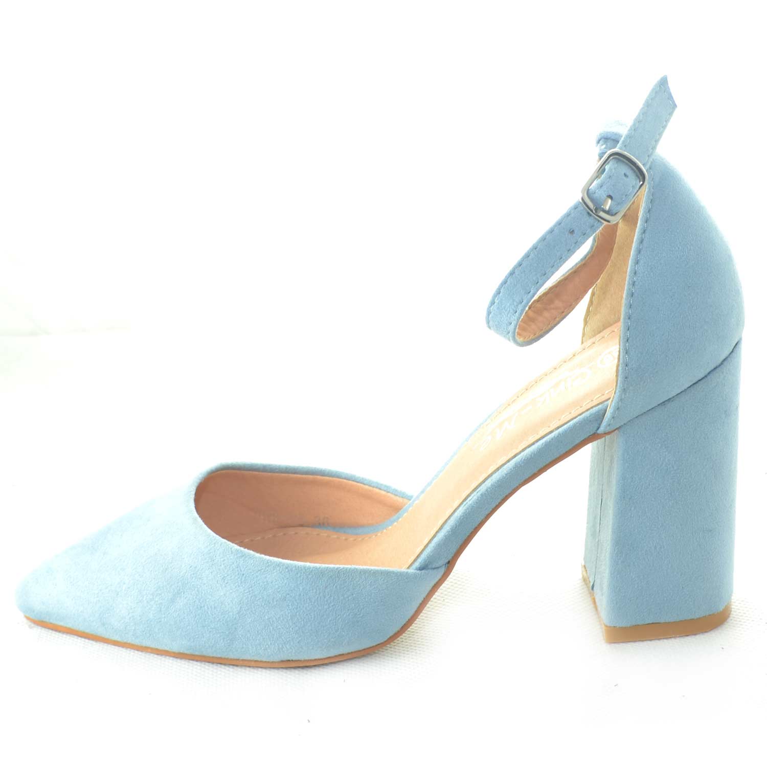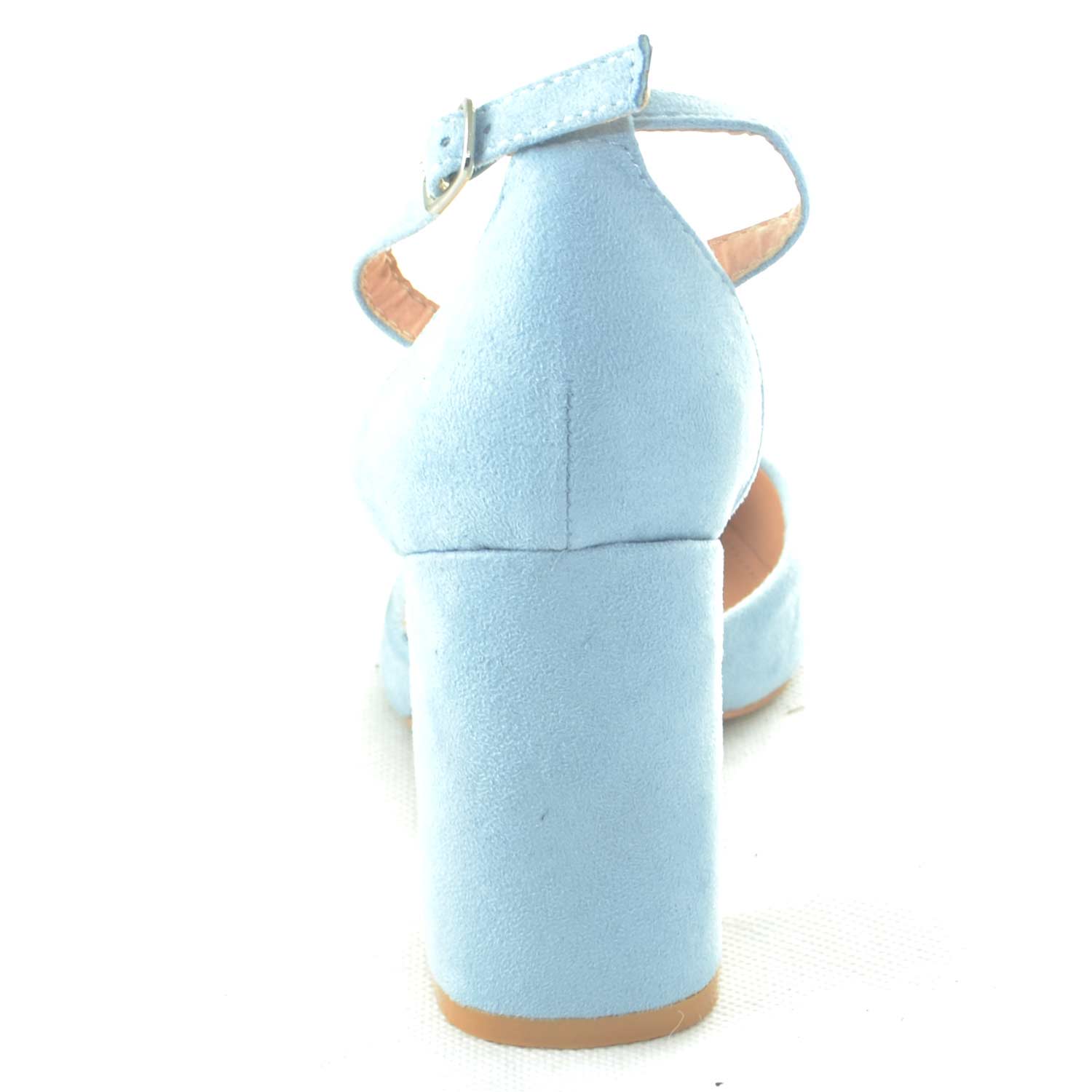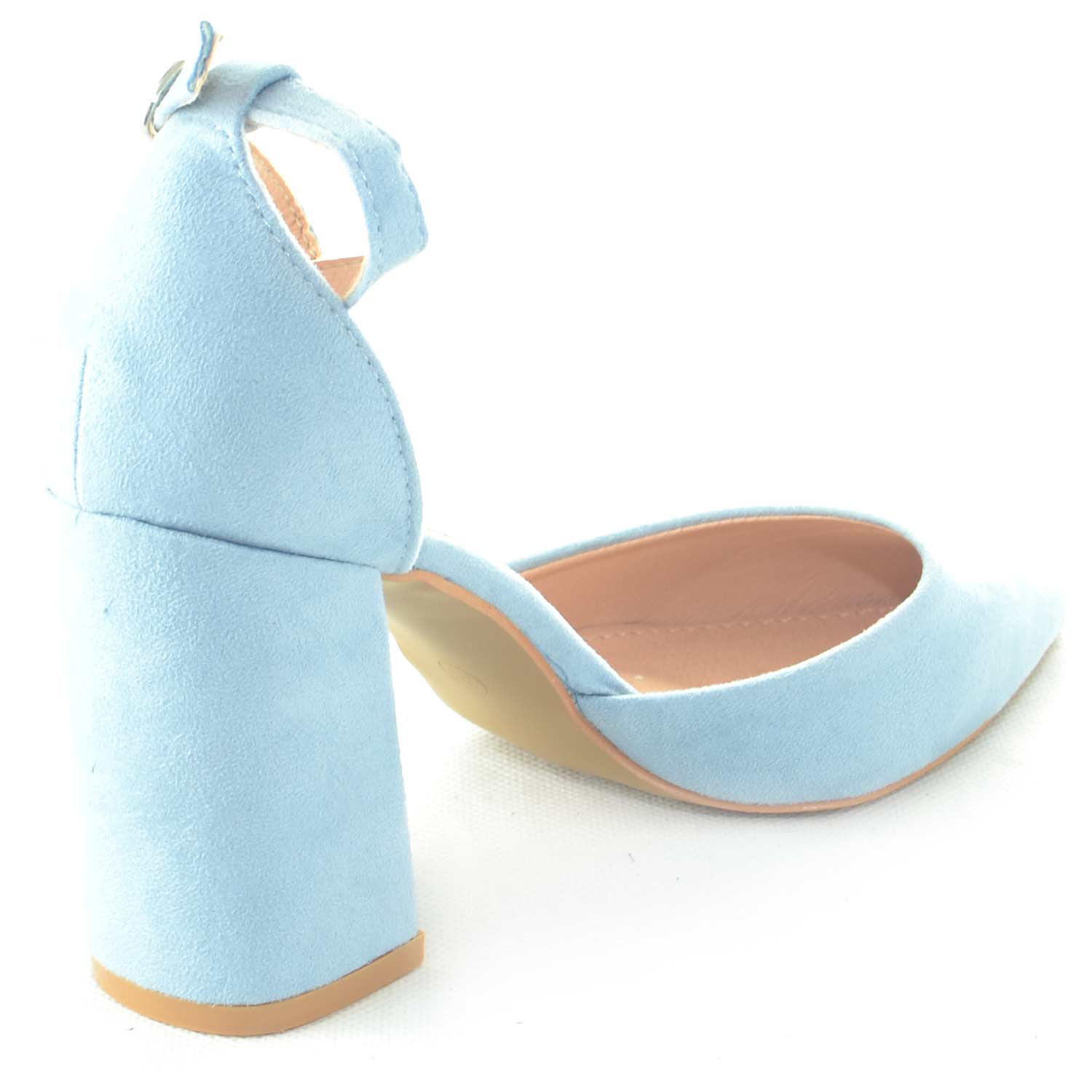 DECOLLETE' SANDALO TACCO ALTO APERTO A PUNTA IN CAMOSCIO AZZURRO POLVERE CON TACCO E CINTURINO ALLA CAVIGLIA GLAMOUR
