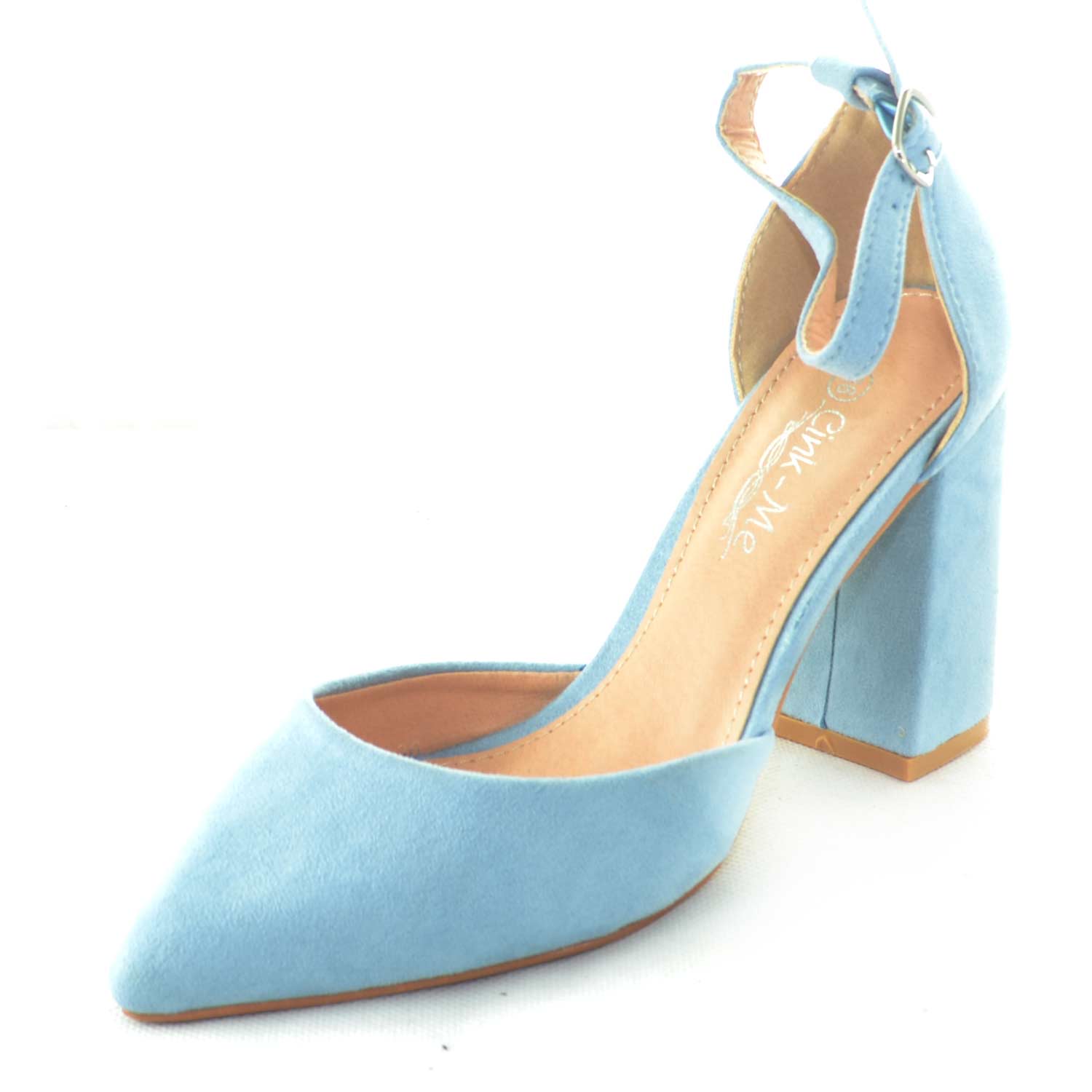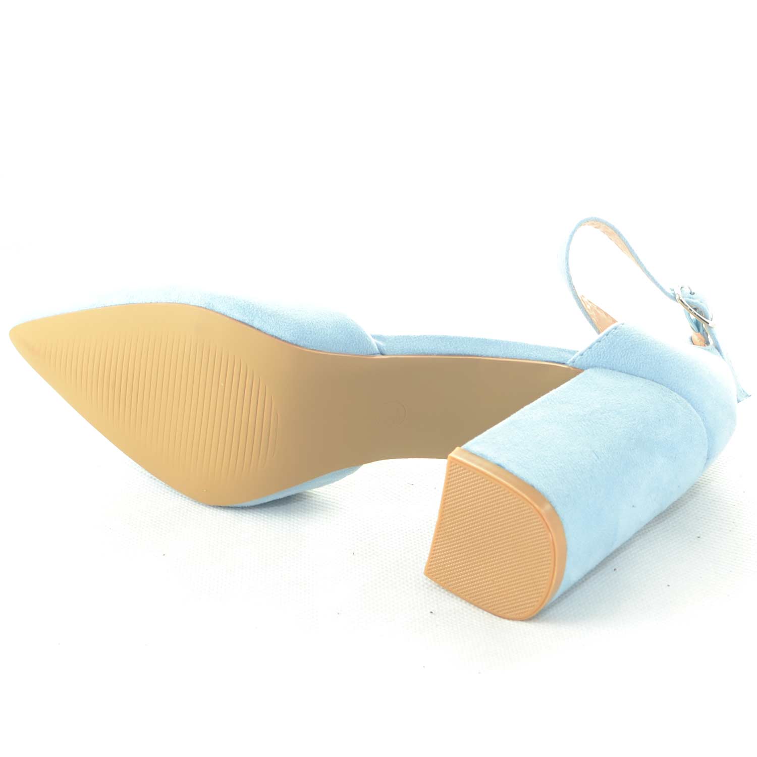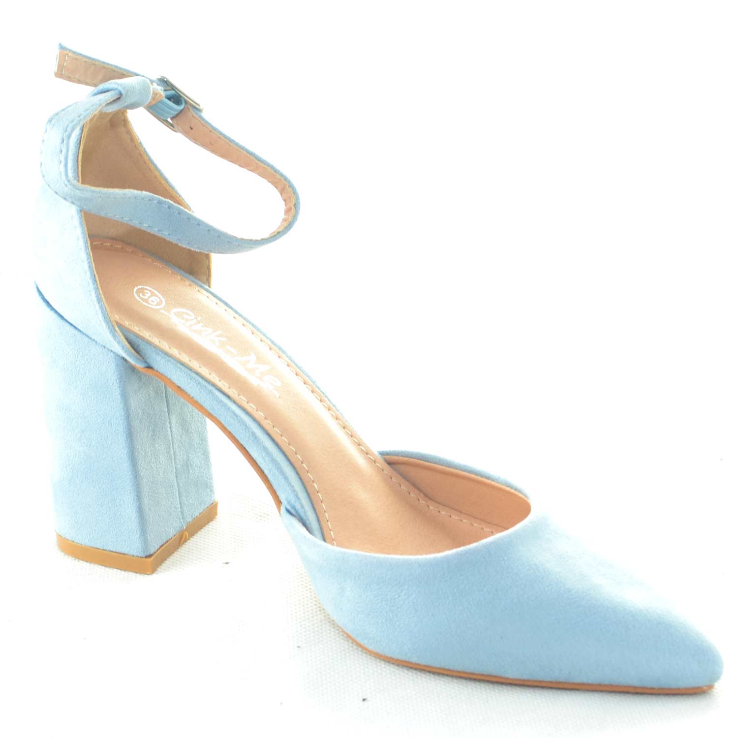 DECOLLETE' SANDALO TACCO ALTO APERTO A PUNTA IN CAMOSCIO AZZURRO POLVERE CON TACCO E CINTURINO ALLA CAVIGLIA GLAMOUR