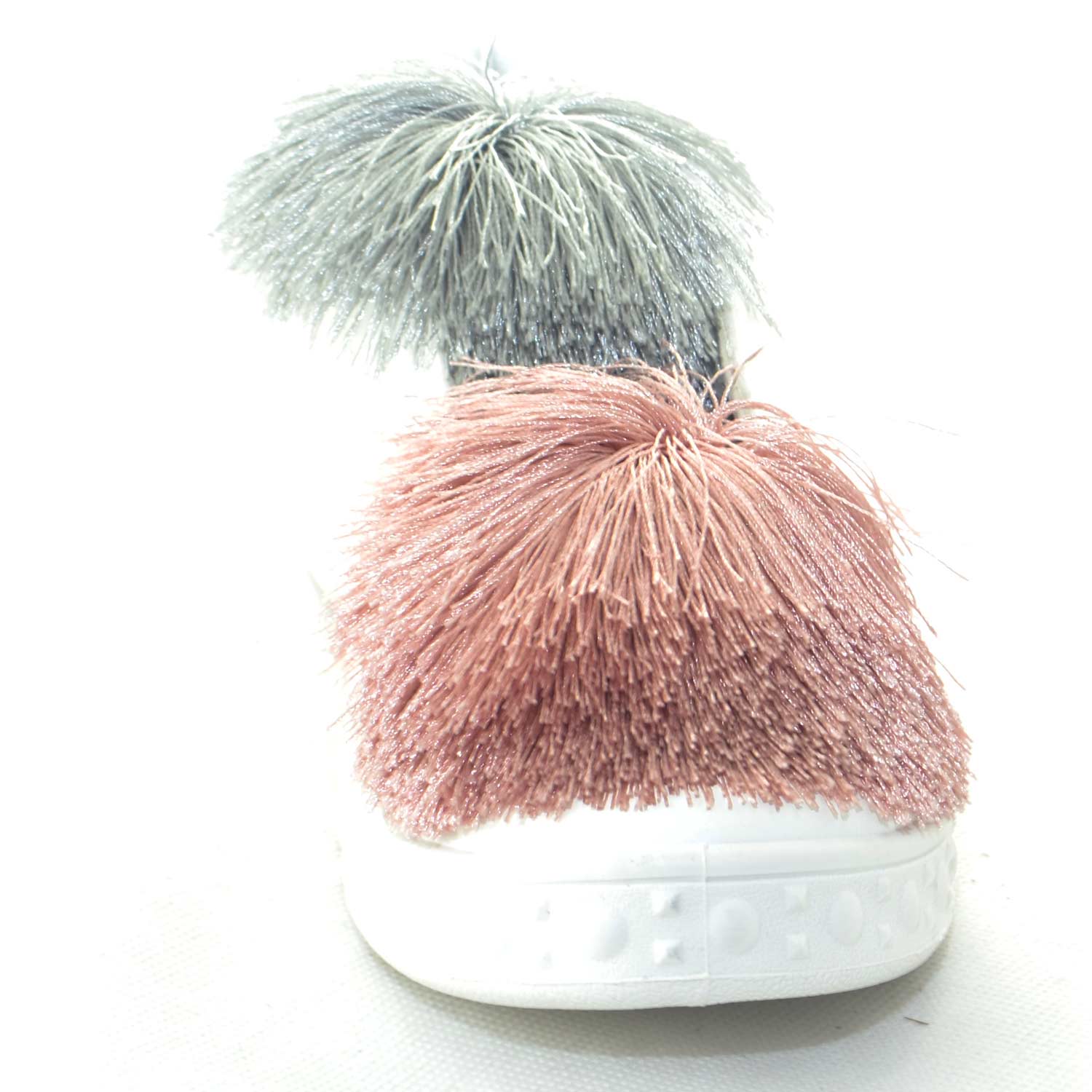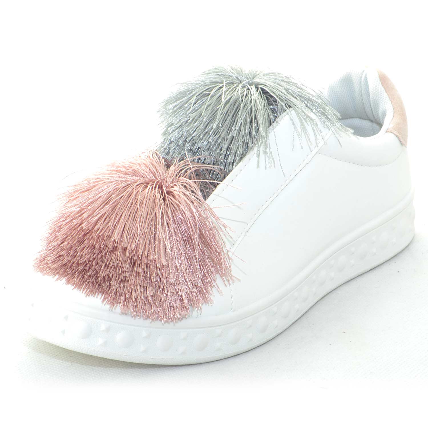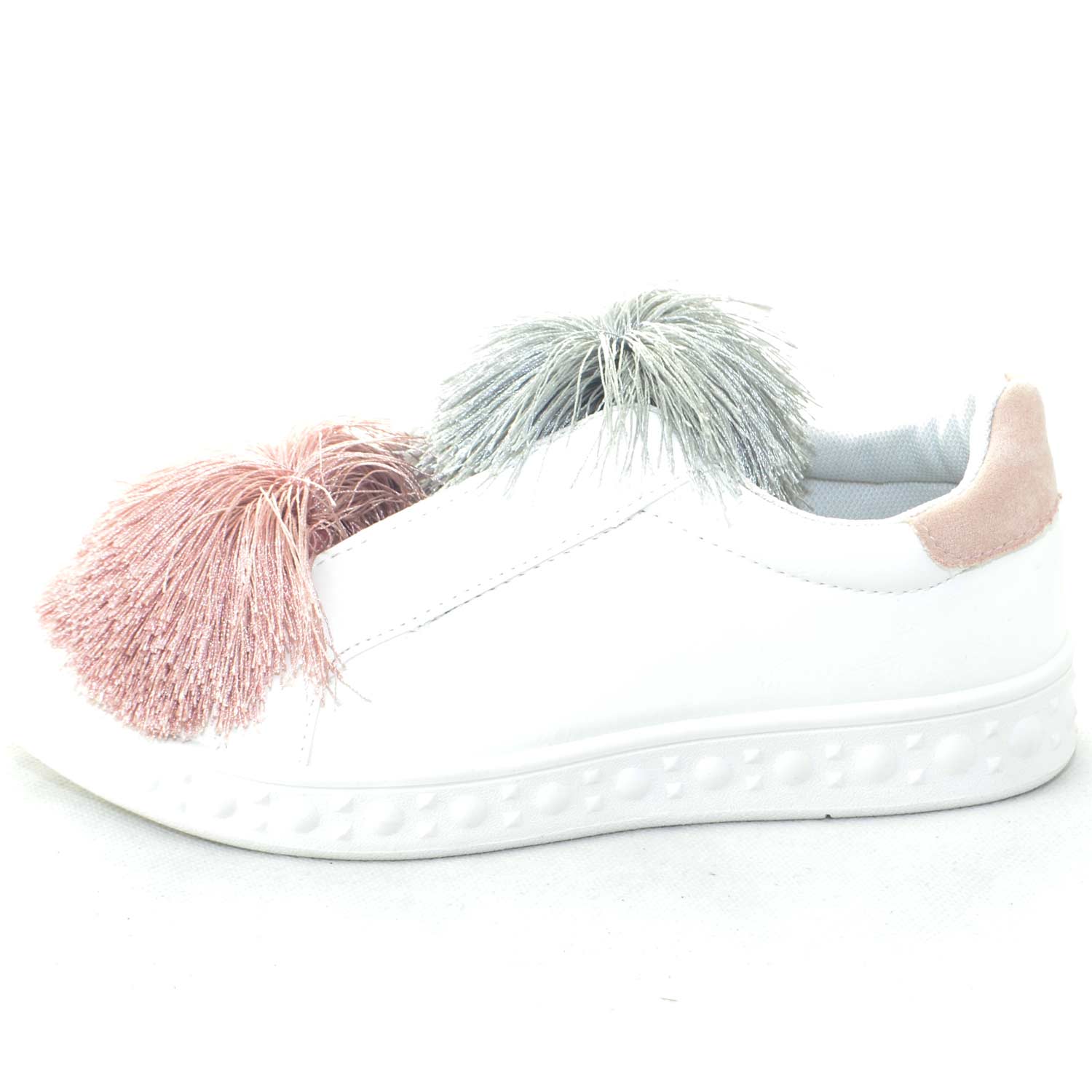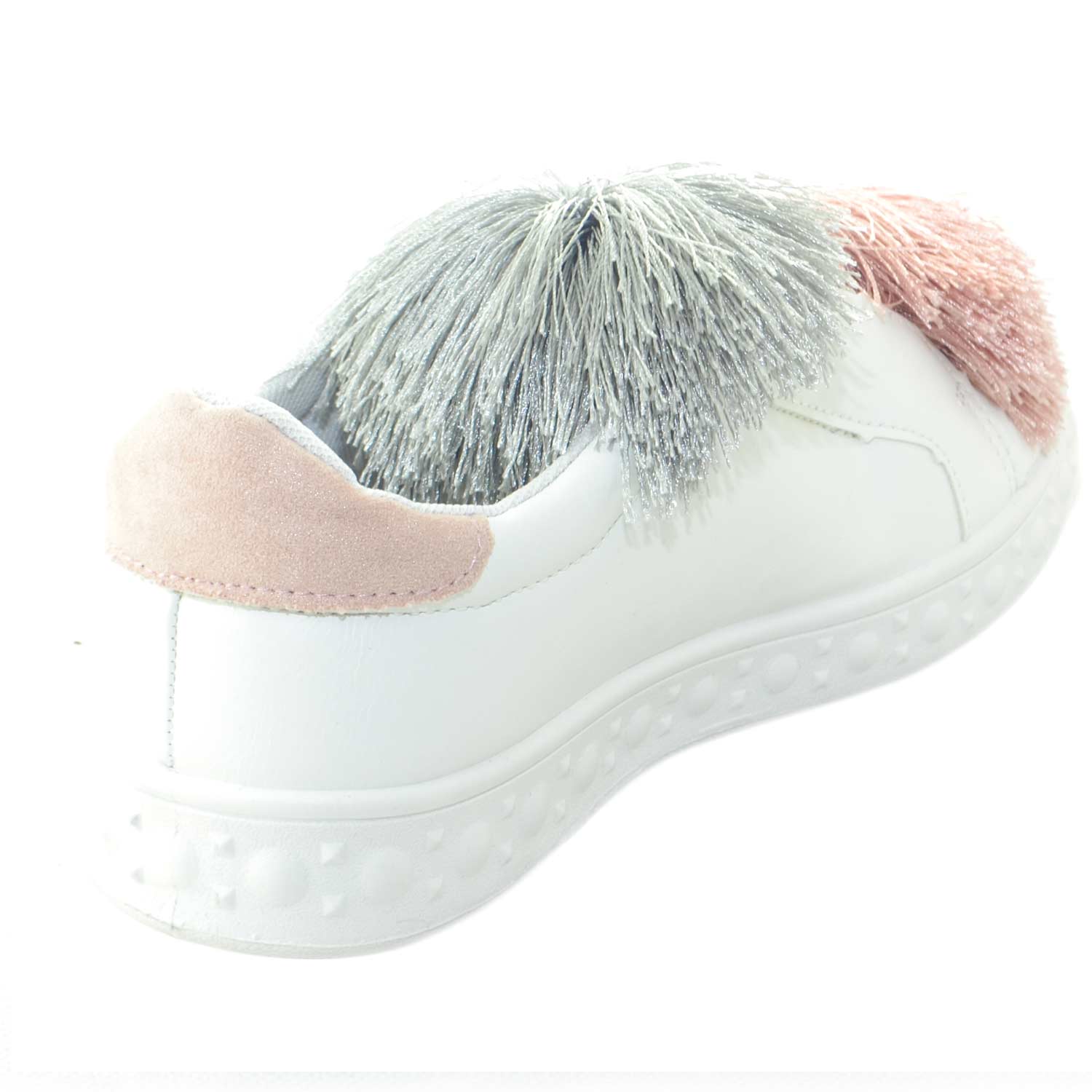 scarpe donna sneakers bassa bianco femminili pelle con applicazioni colorate simil pon pon fondo liscio glamour