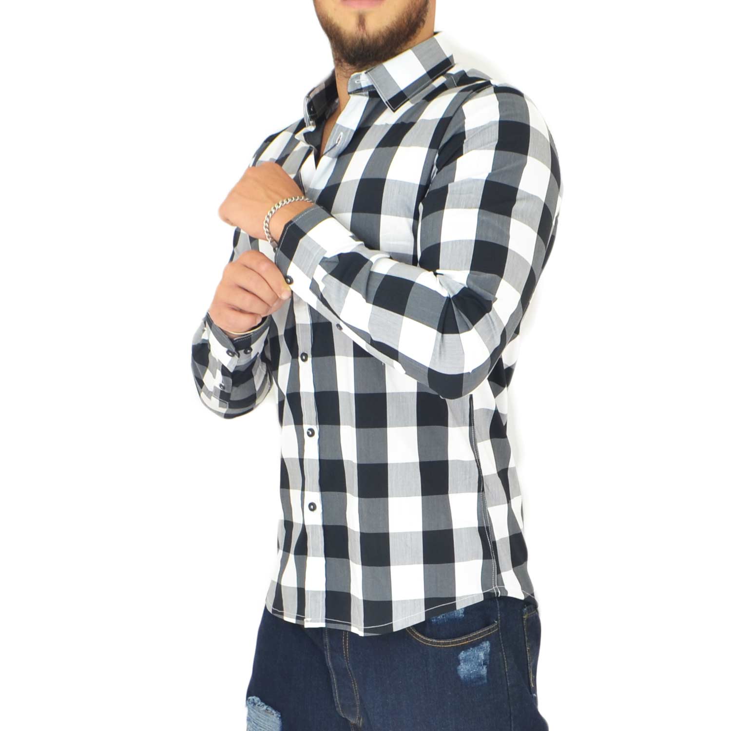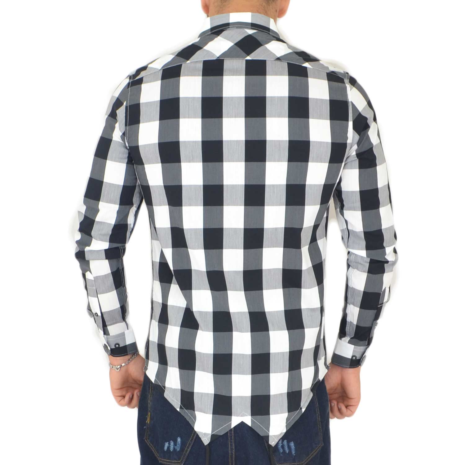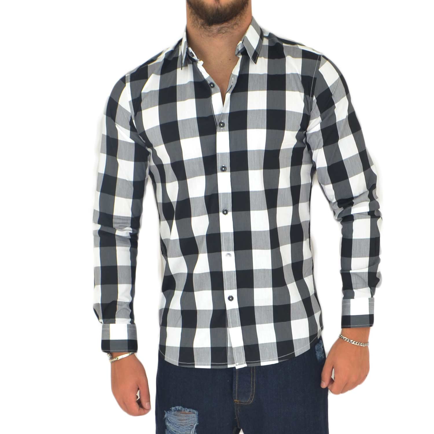 Camicia uomo cotone nero collo rigido manica lunga motivo a quadri nero bianco basic