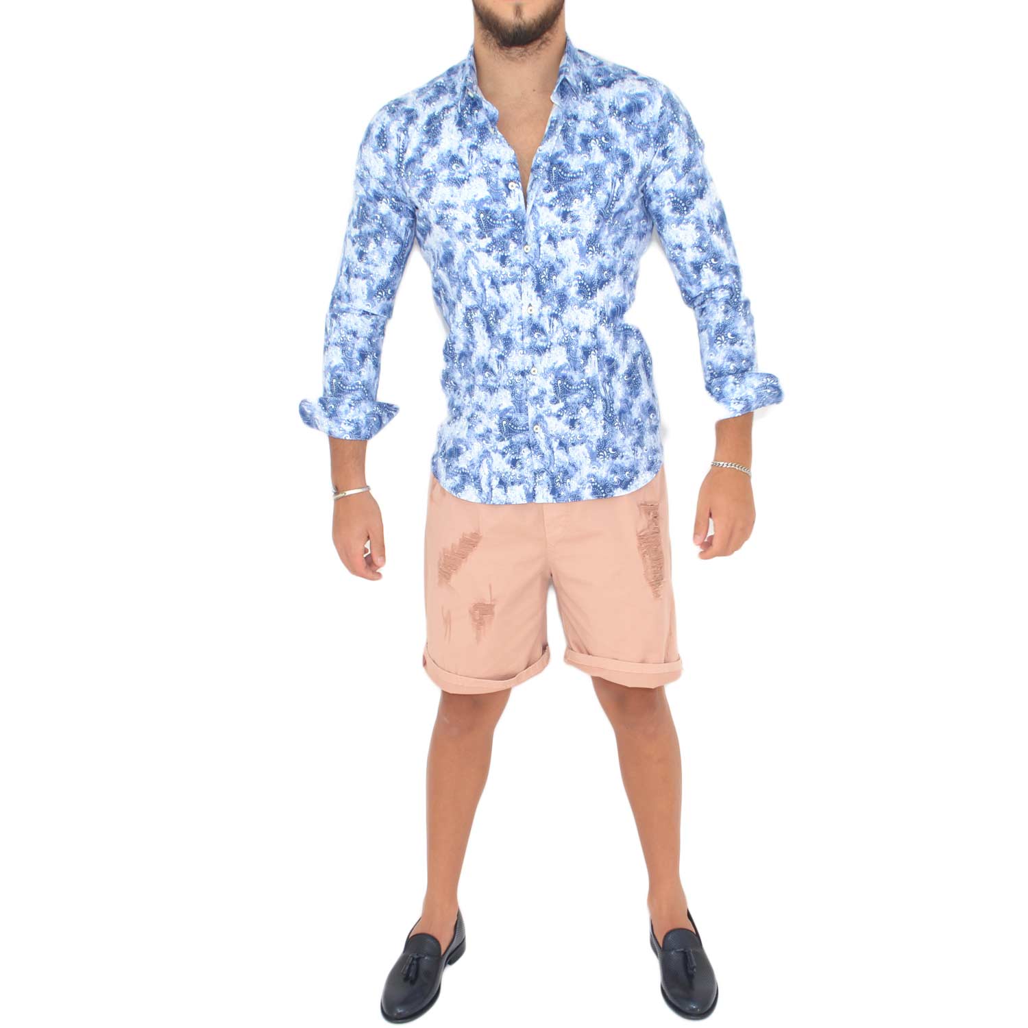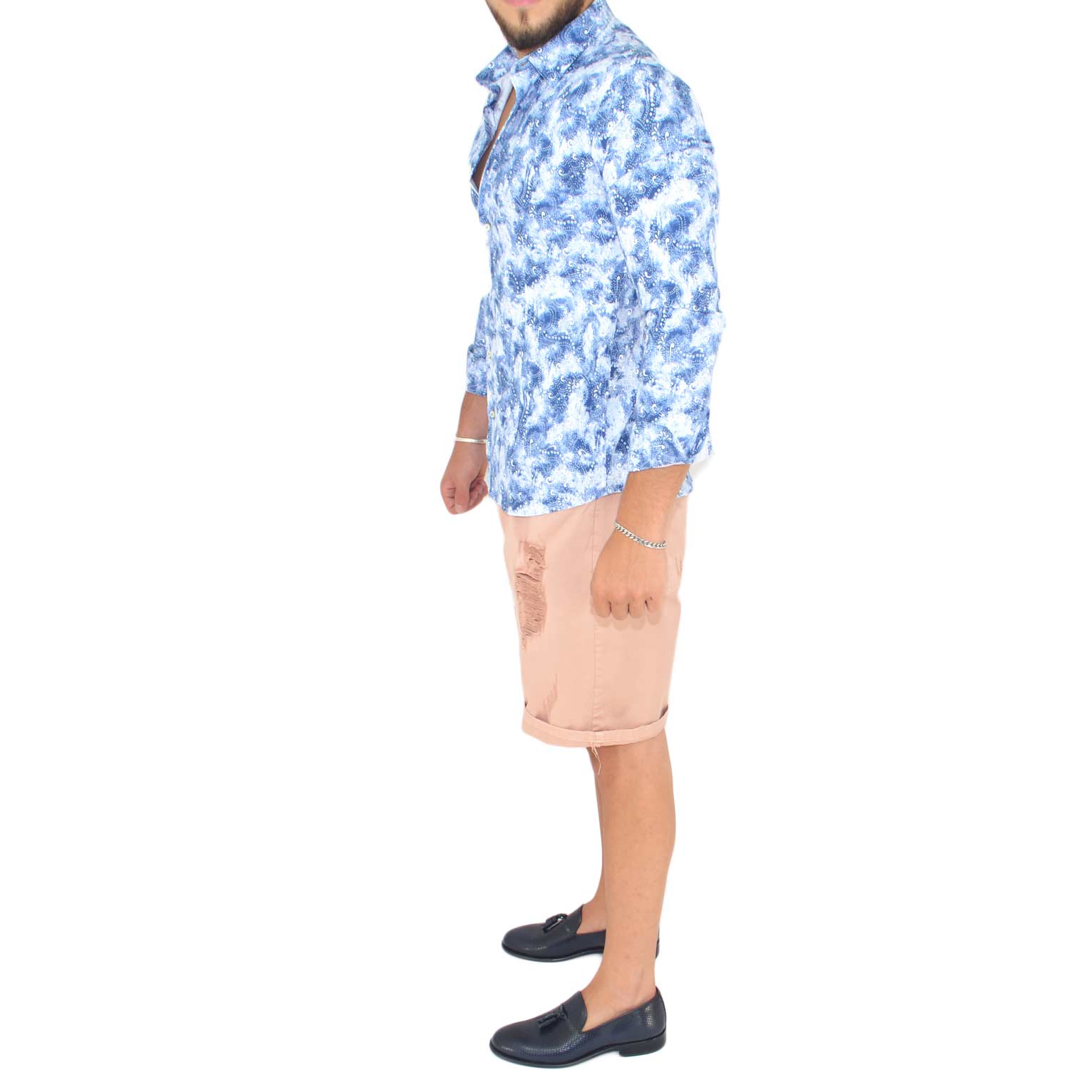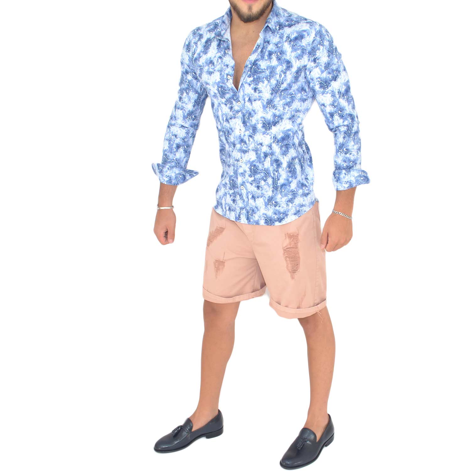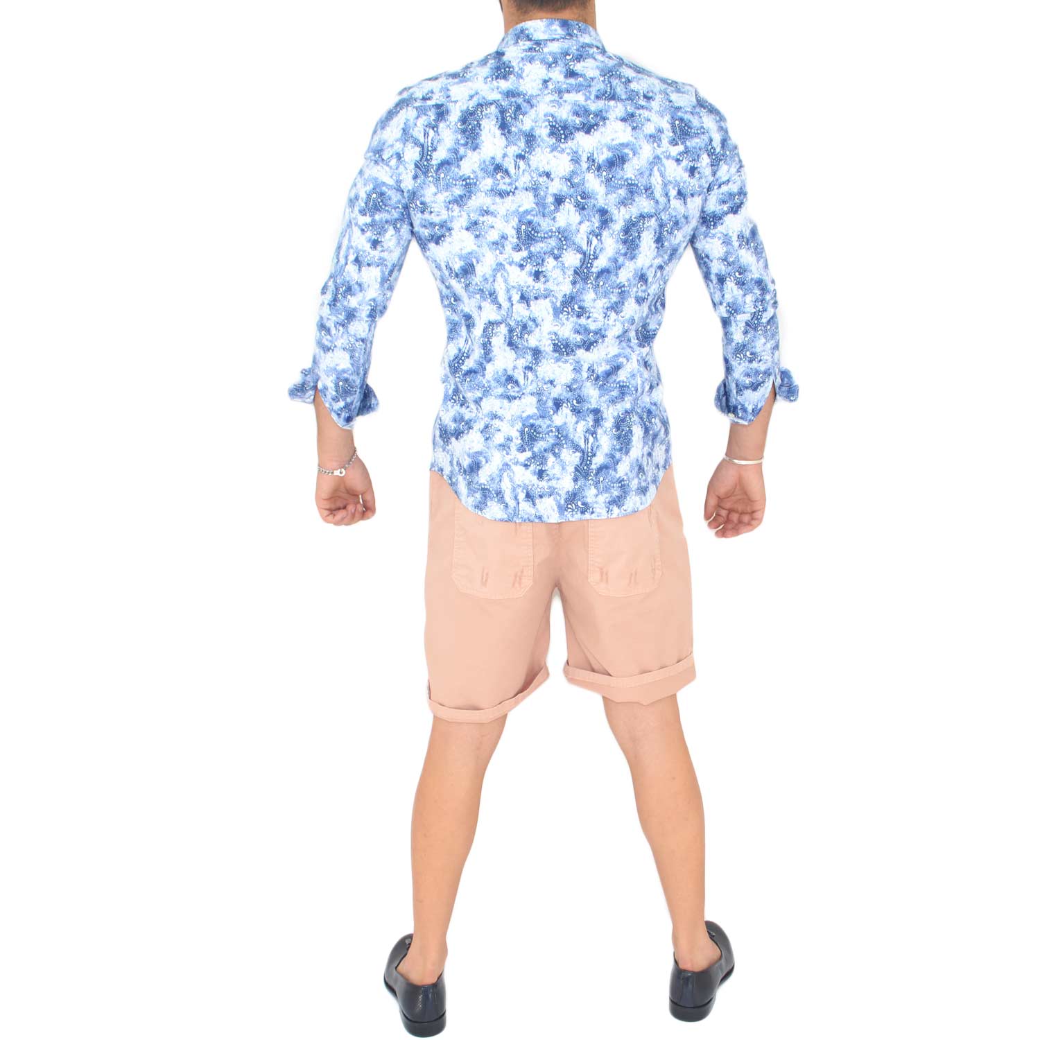 Camicia uomo cotone blu collo rigido manica lunga motivo astratto made in italy slim linea  basic.