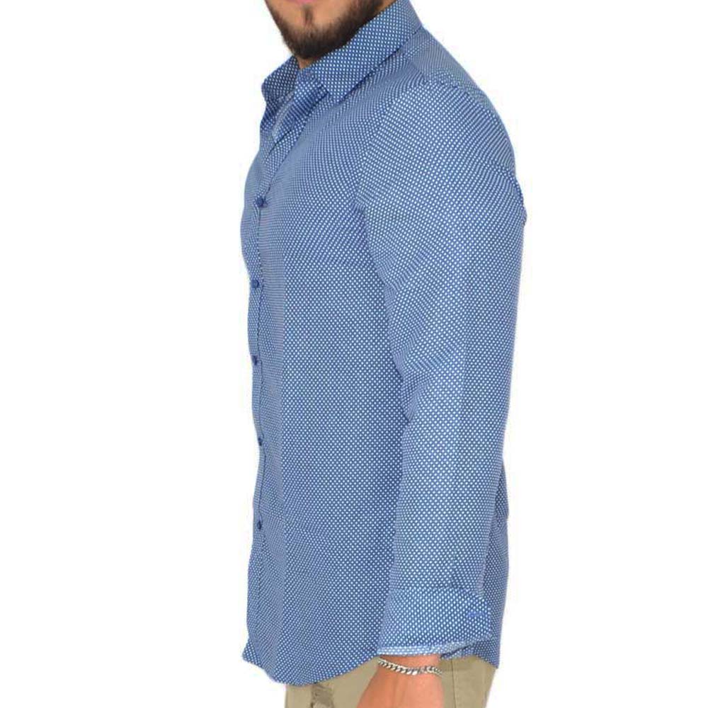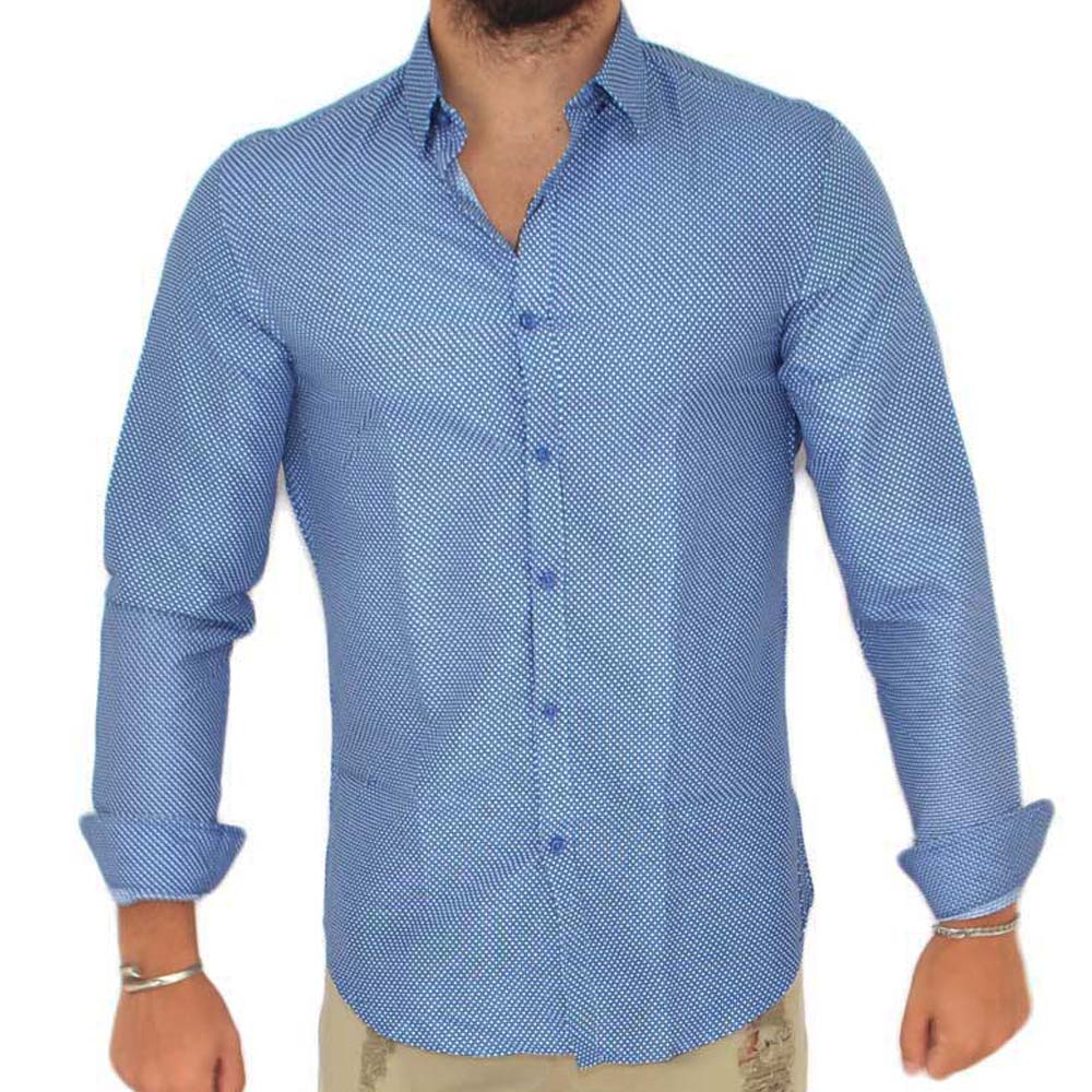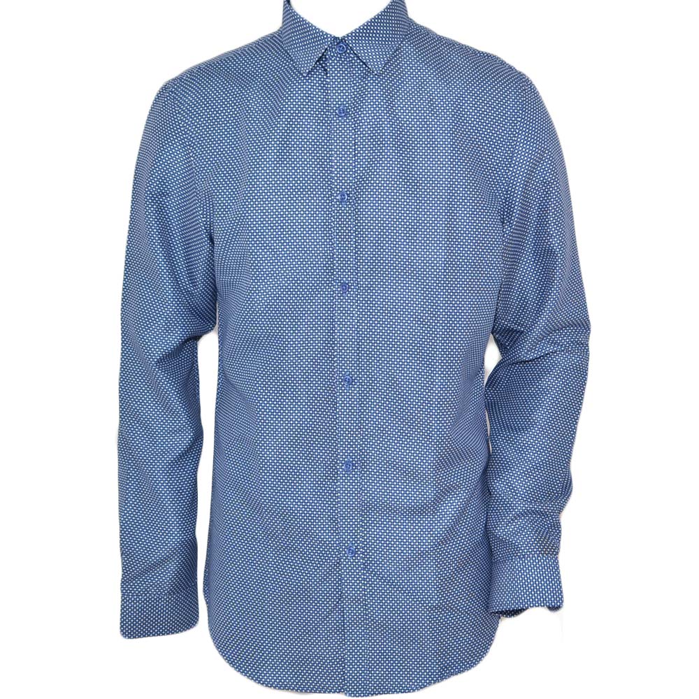 Camicia uomo cotone blu collo rigido manica lunga motivo astratto made in italy slim linea basic