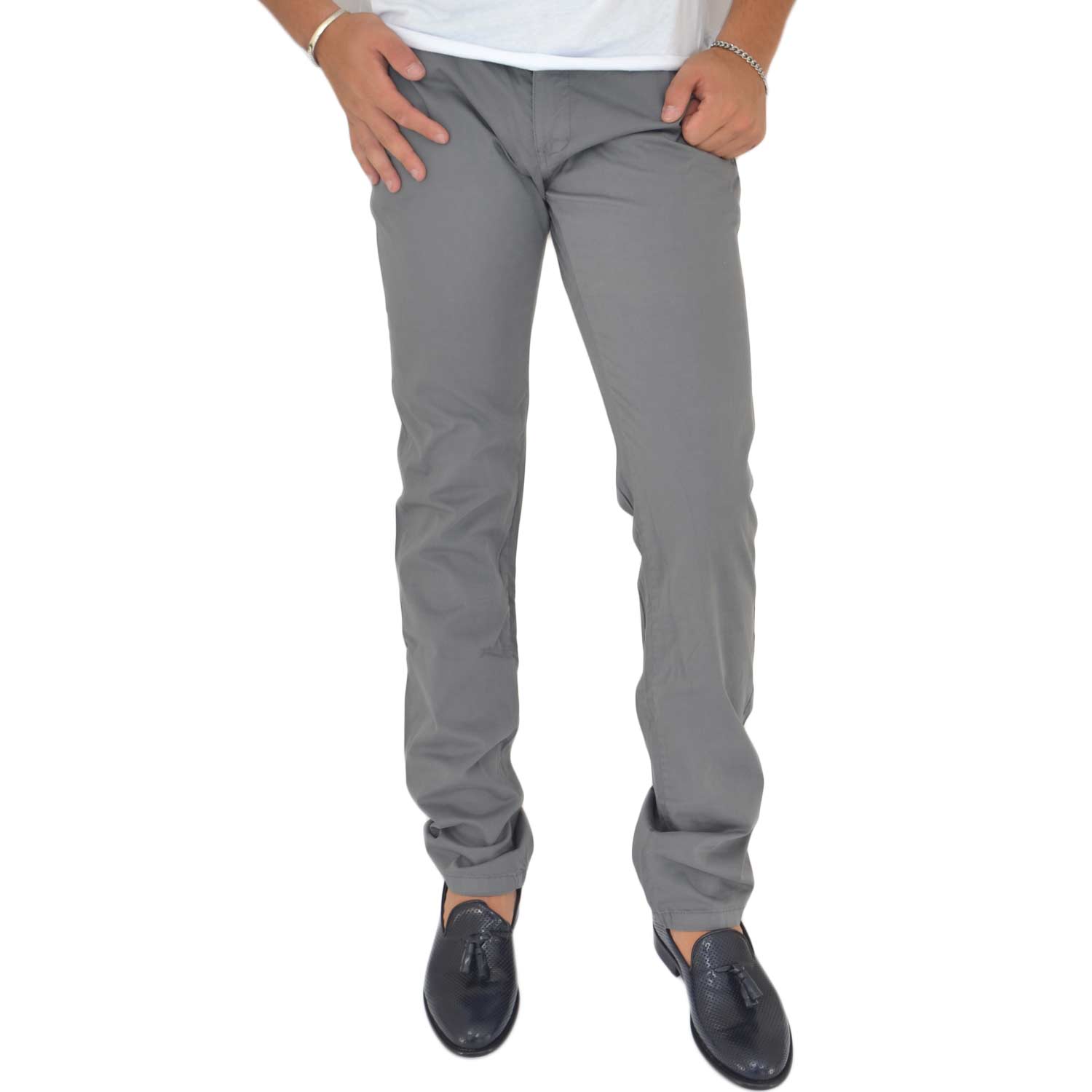 Pantaloni grigio cotone, Skinny Fit con tasca americana . Chiusura con bottone e cerniera.