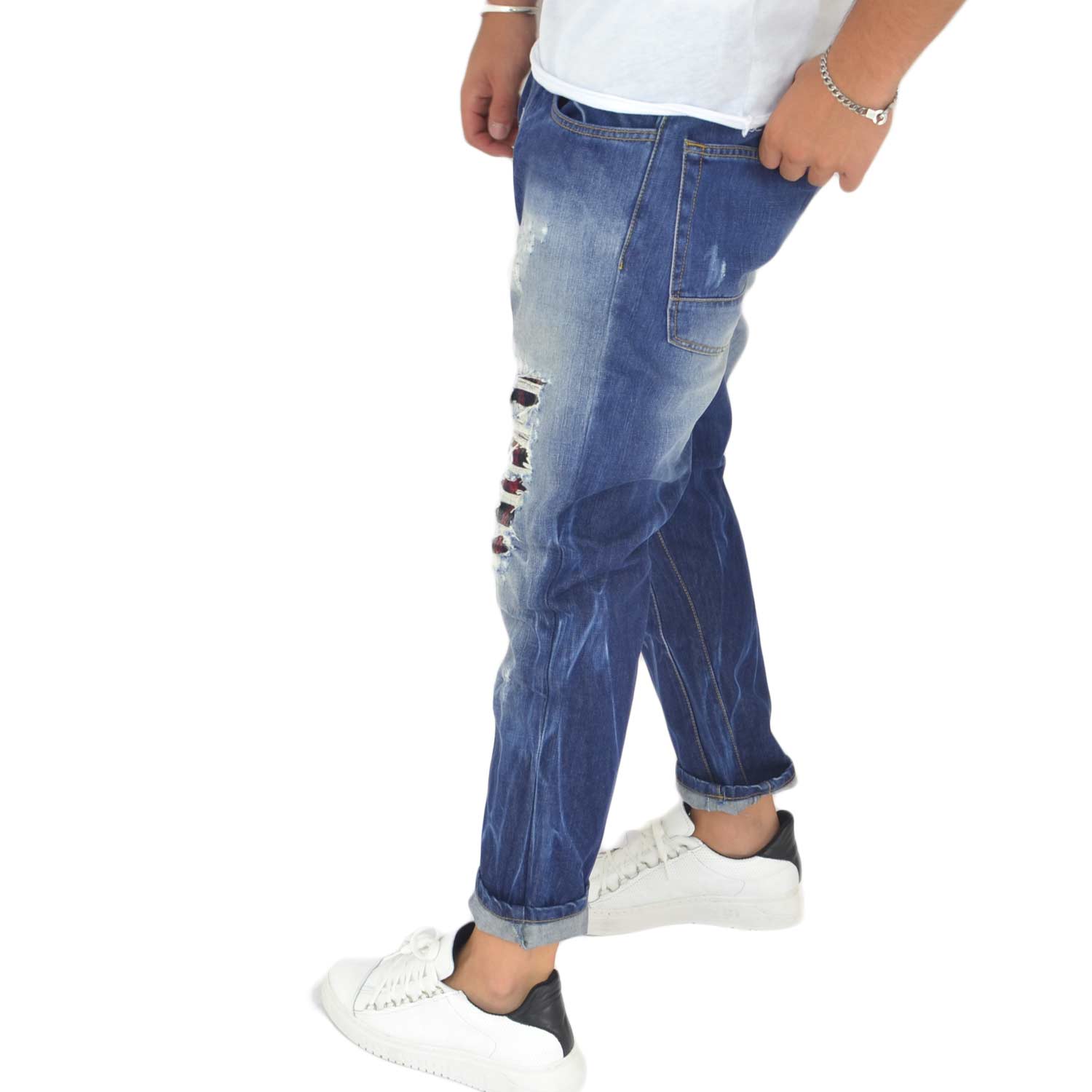 Pantaloni Jeans uomo blu scuro denim biker chiusura con bottone e cerniera strappato con toppa fantasia a quadri