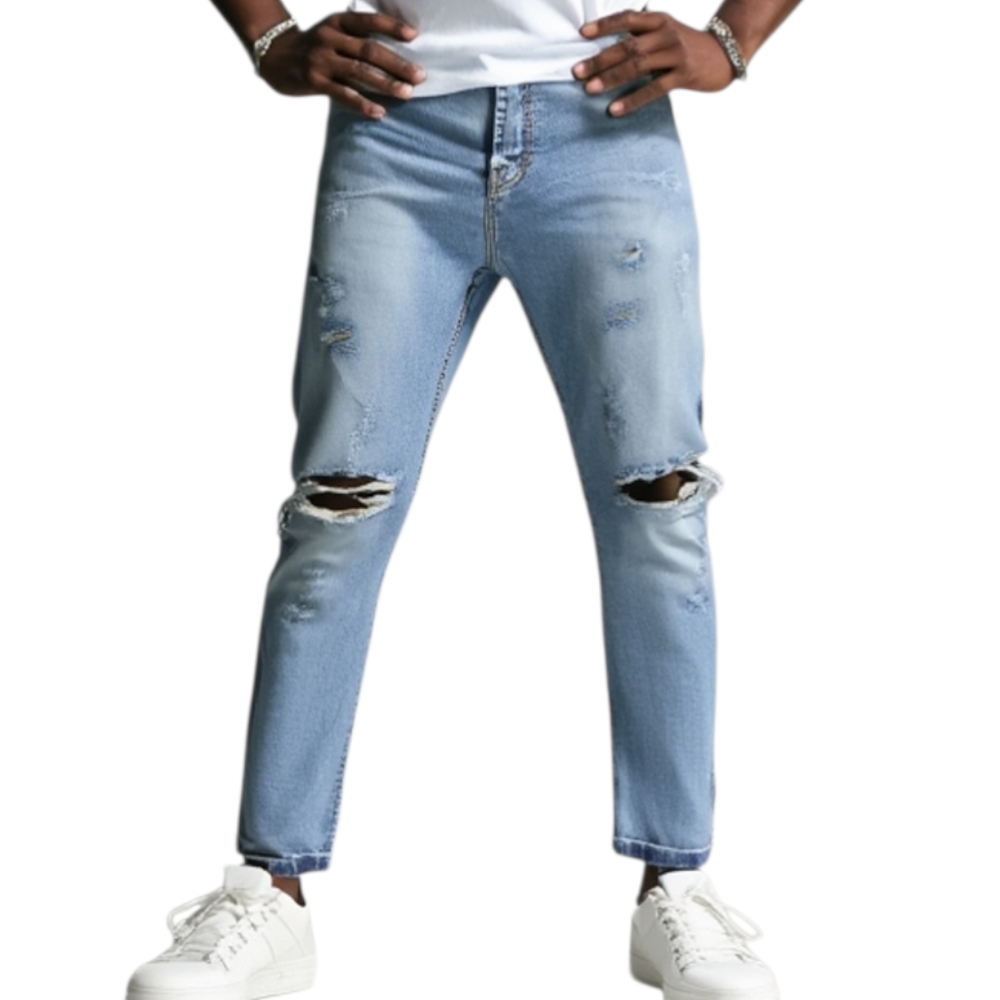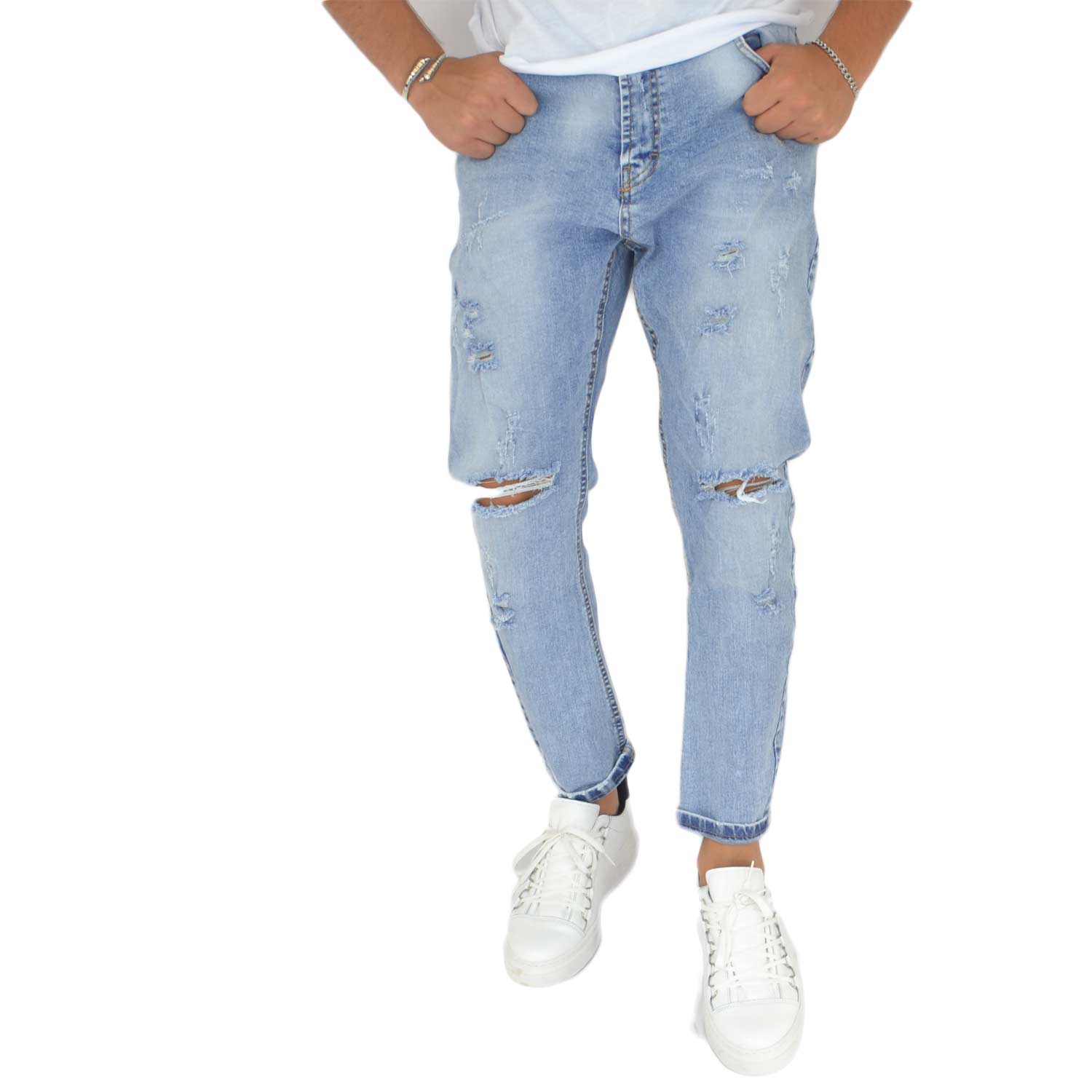 Pantalone Jeans Uomo Denim Rotture Mod Jeans Effetto Sfumato Cinque Tasche Con Rotture Moda Giovanile.