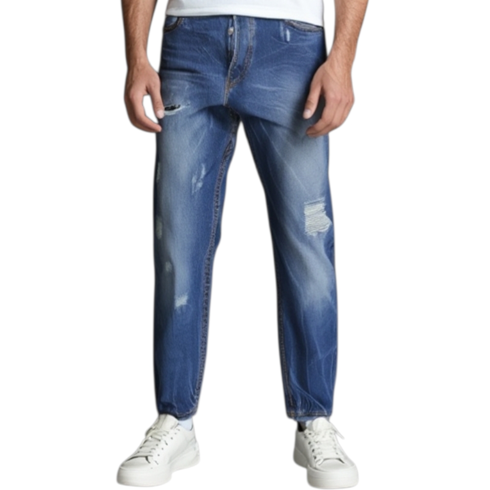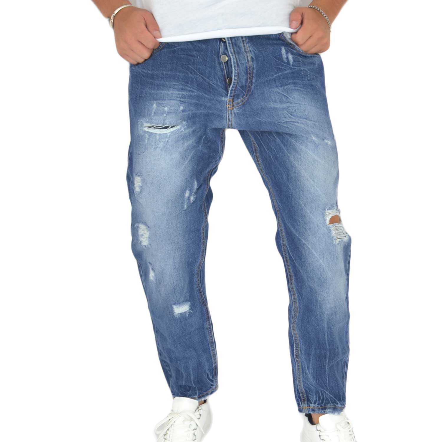 I jeans comfort cavallo medio e denim con strappi sul ginocchio, il modello preferito per gli amanti della moda , in versione di puro cotone e con leggere sfumature interne per il tocco di moda!