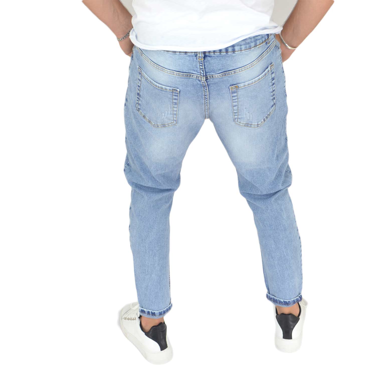 Pantaloni Jeans chiaro denim biker. Skinny fit.Chiusura con bottone e cerniera. strappo moda ginocchio glamour