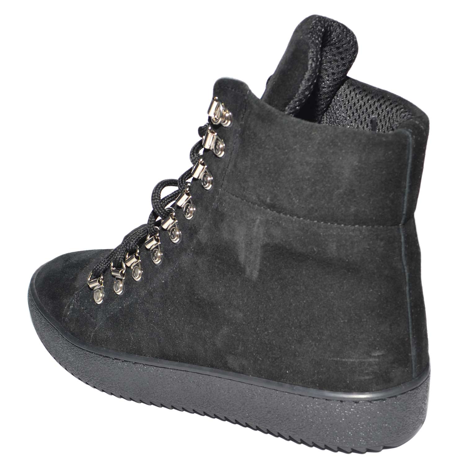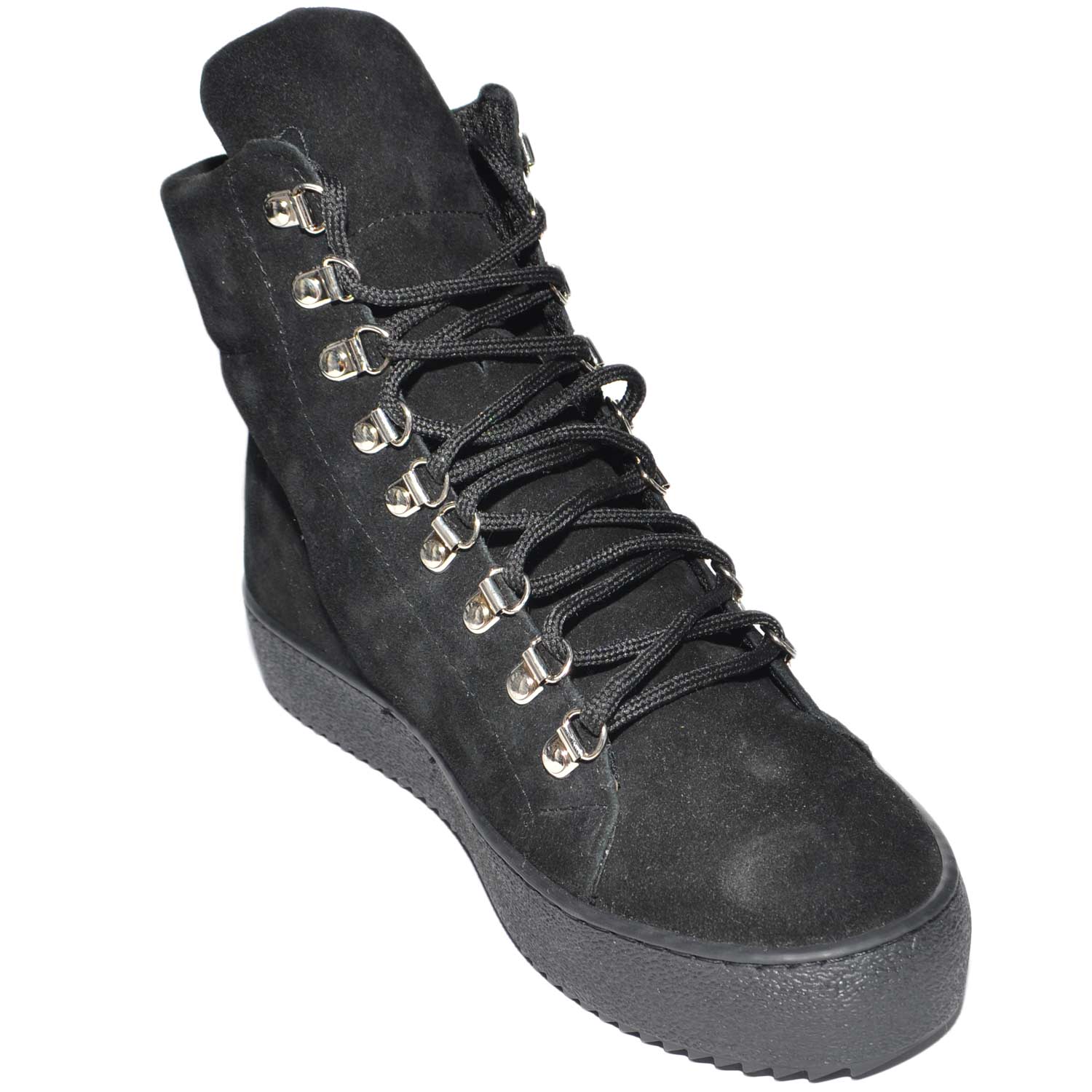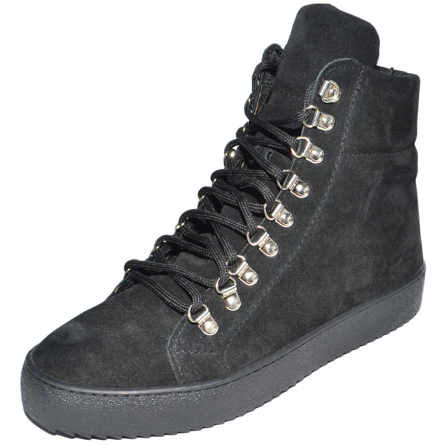 Sneakers uomo alta in vera pelle scamosciata nera con fondo doppio army nero, lacci con occhielli dorati