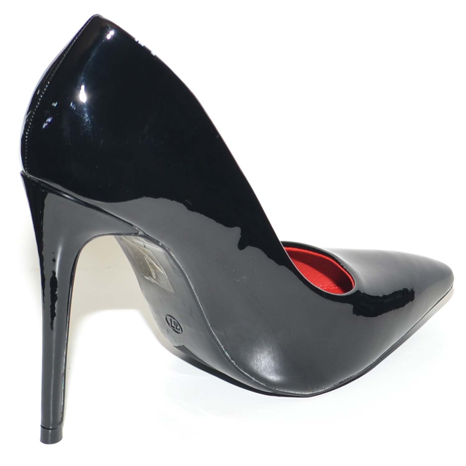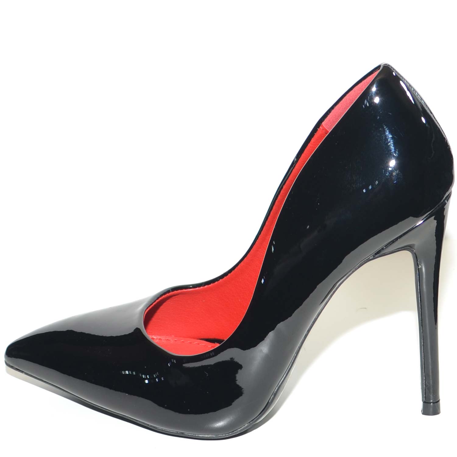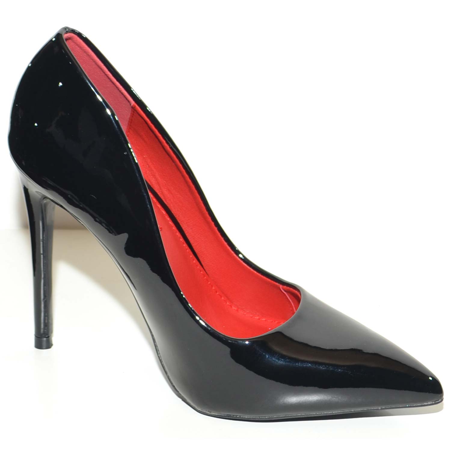 Decollete donna nero linea basic in vernice nero tacco a spillo 12 cm elegante interno rosso