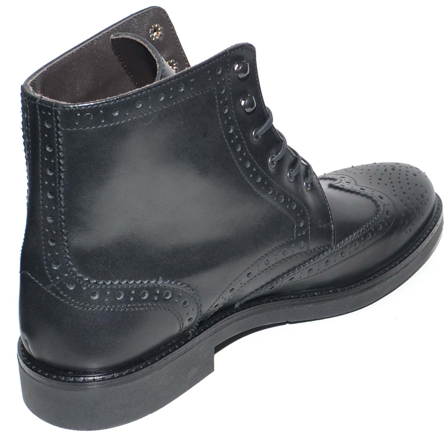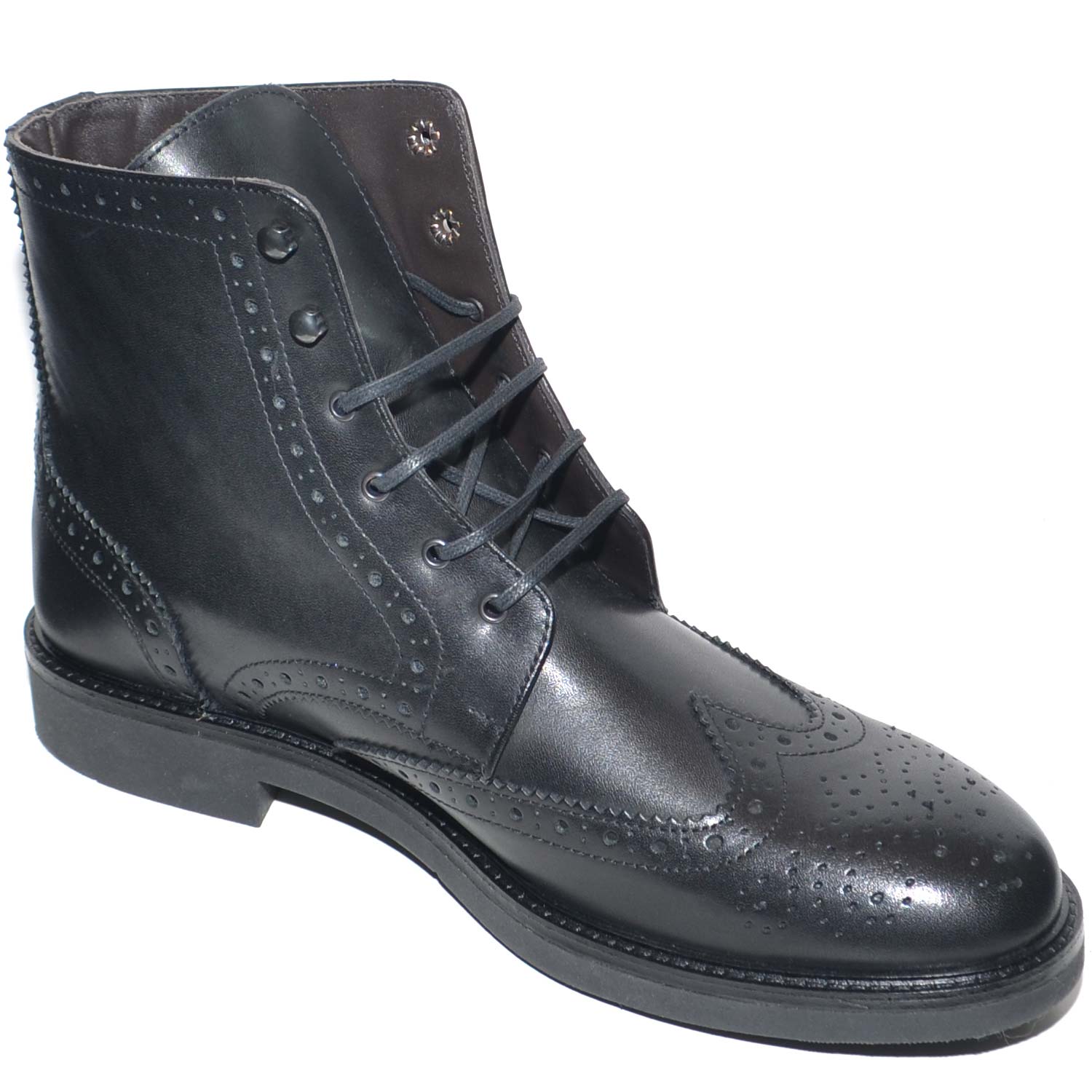 Anfibio vintage in vera pelle nero spazzolato con cucitura in punta fondo gomma lacci in tinta chiusura handmade