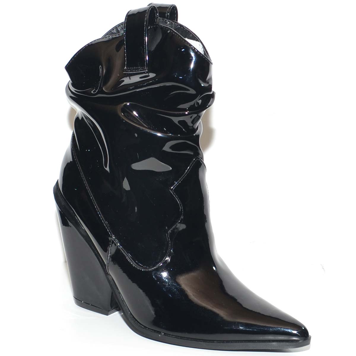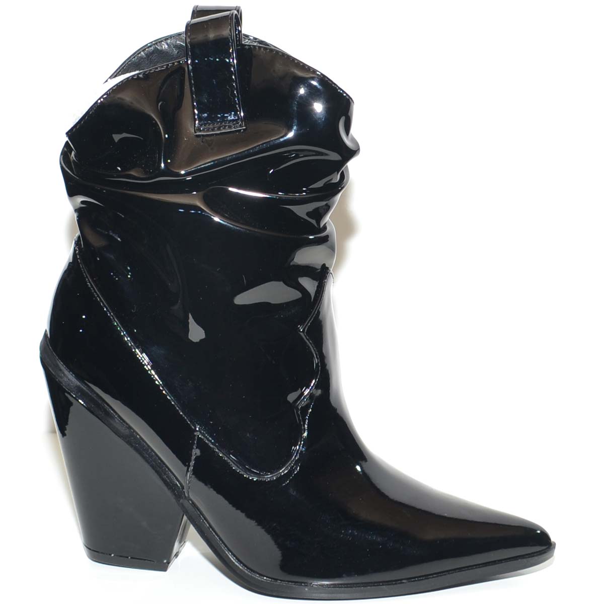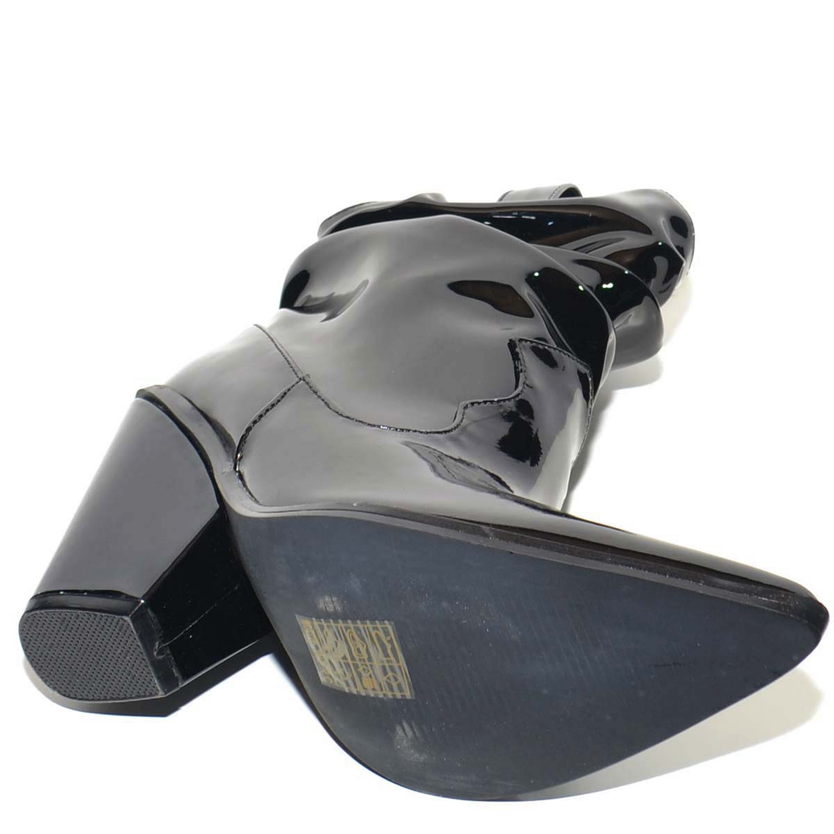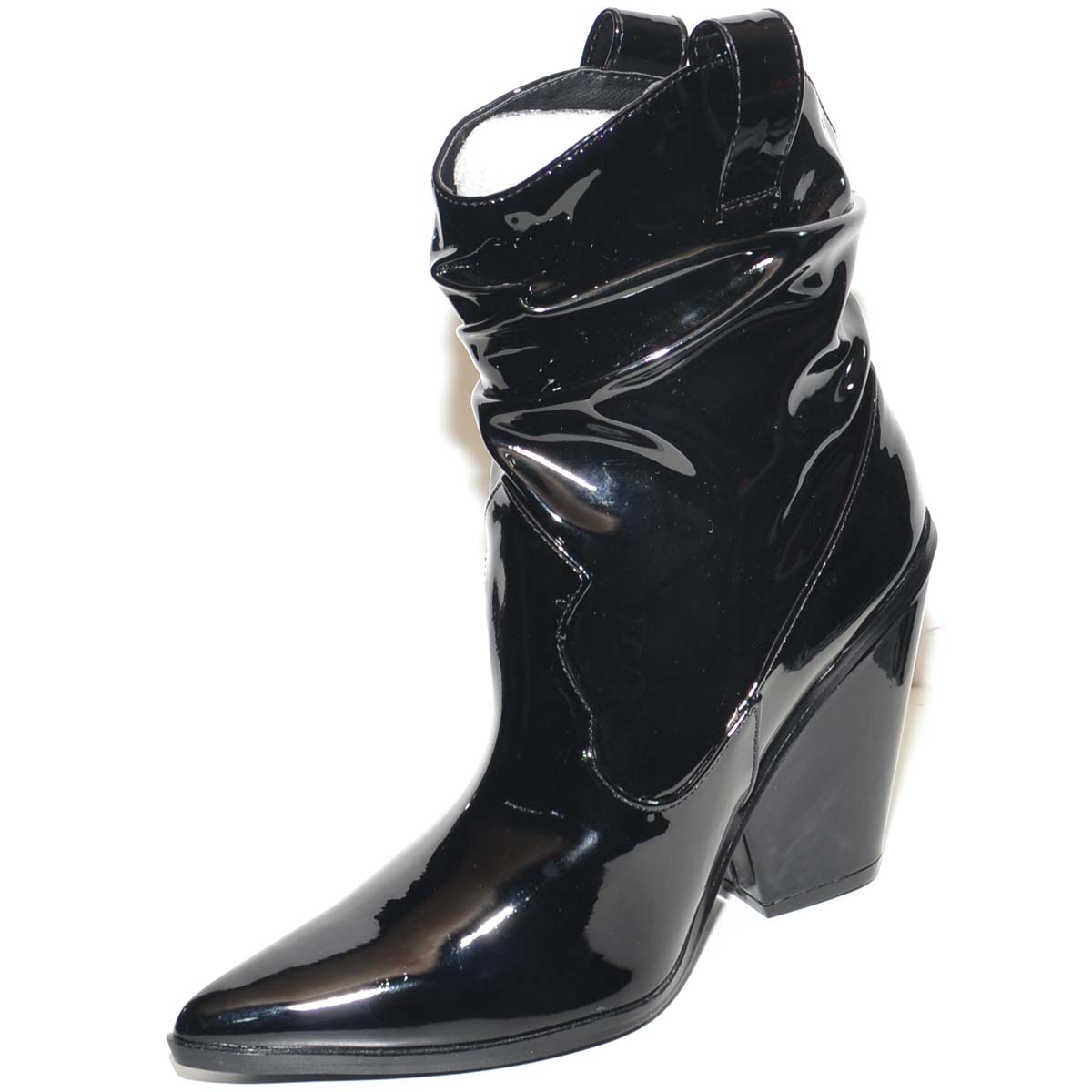 TRONCHETTO DONNA CAMPEROS LUCIDO NERO CON TACCO CONO COMODO E ROUCHES ALLA CAVIGLIA MODA TREND TENDENZA