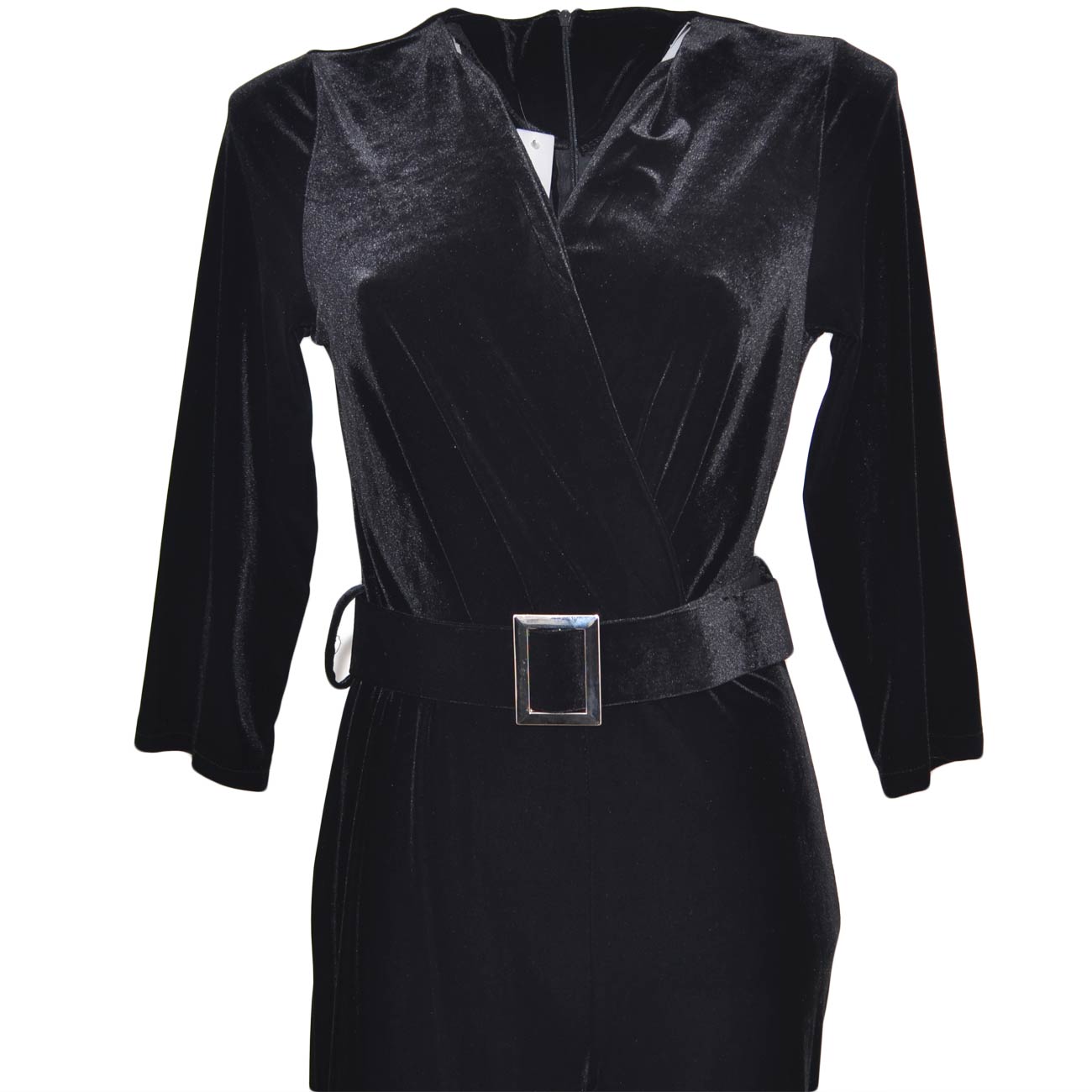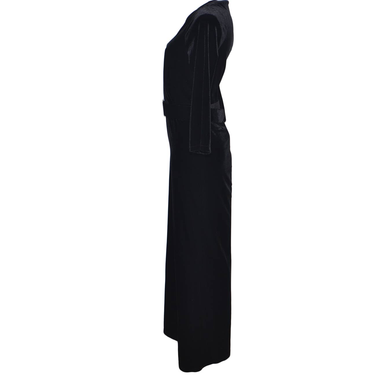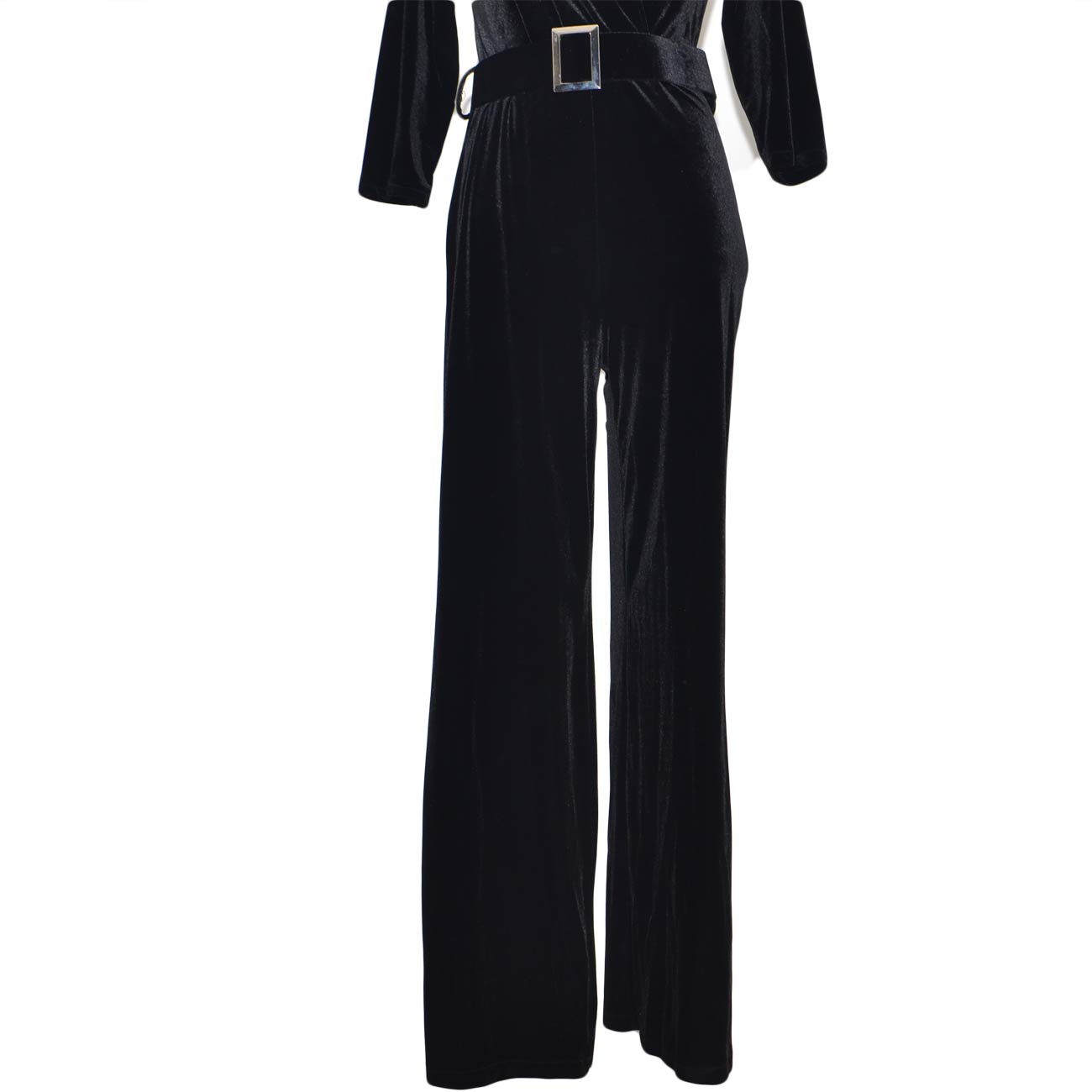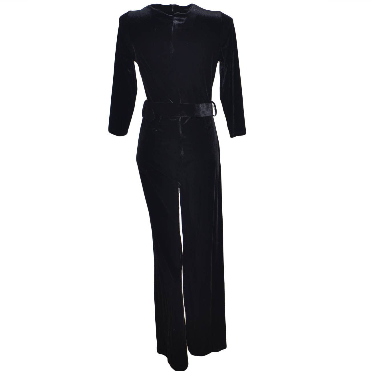 Tuta donna nera in ciniglia velluto con scollo a V e cinturone in vita pantalone palazzo e manica a tre quarti