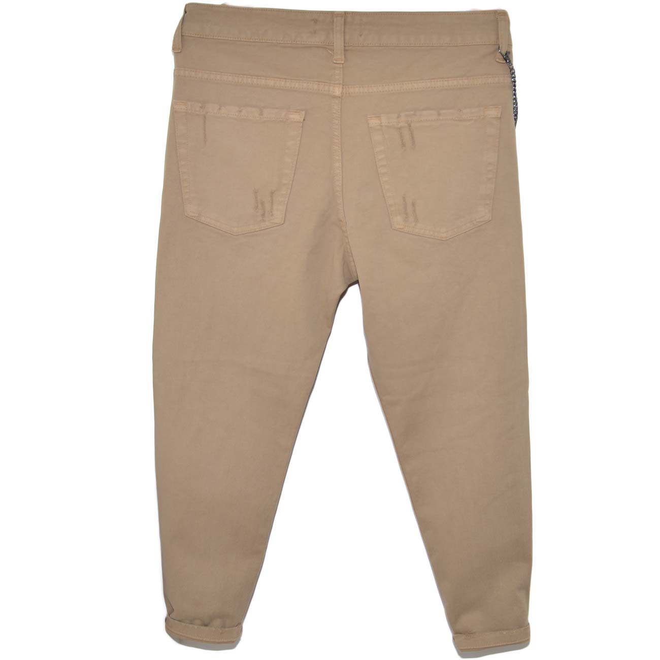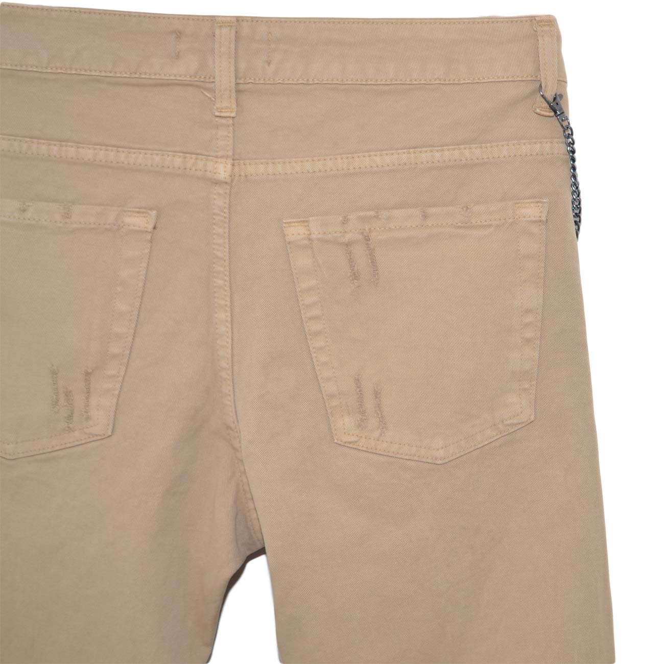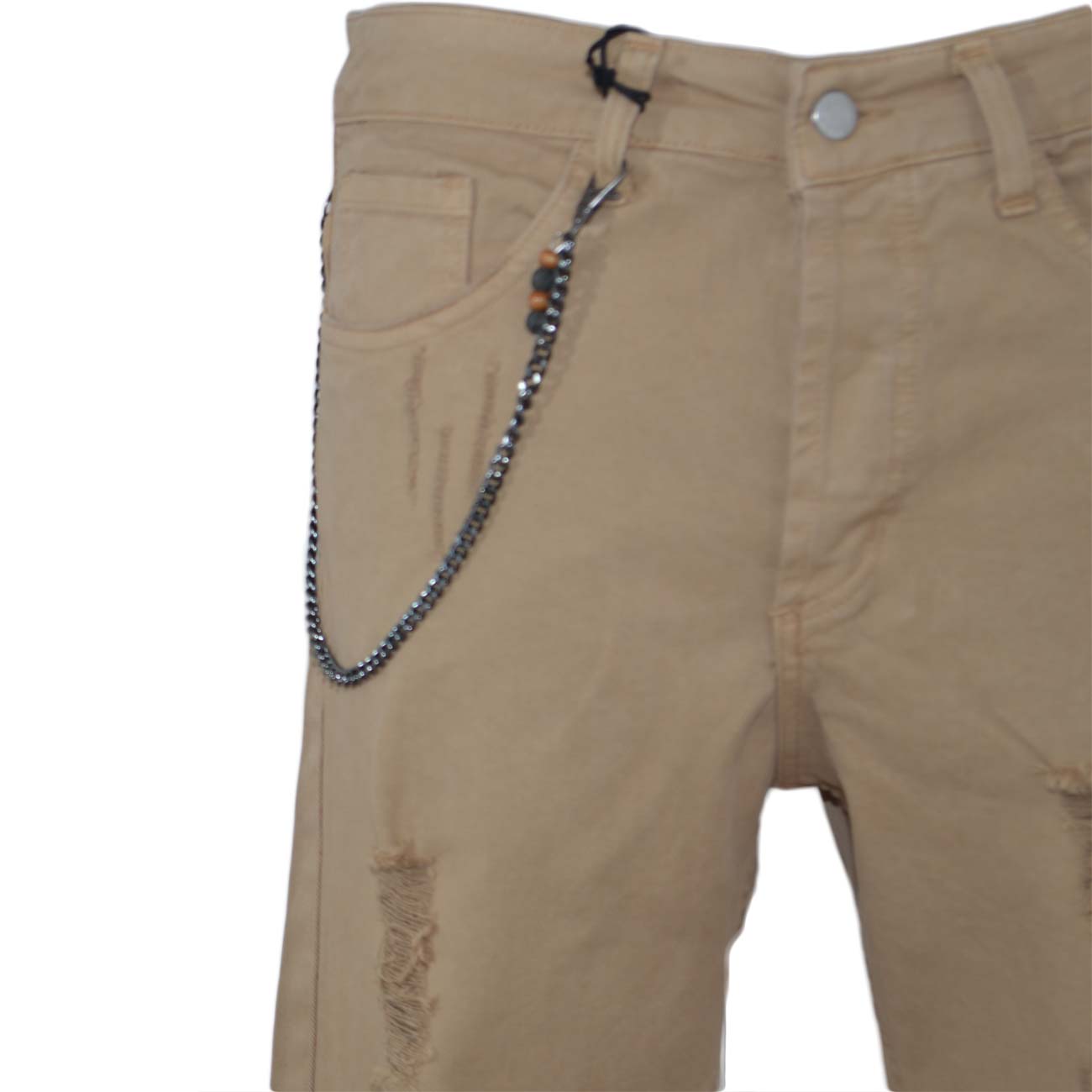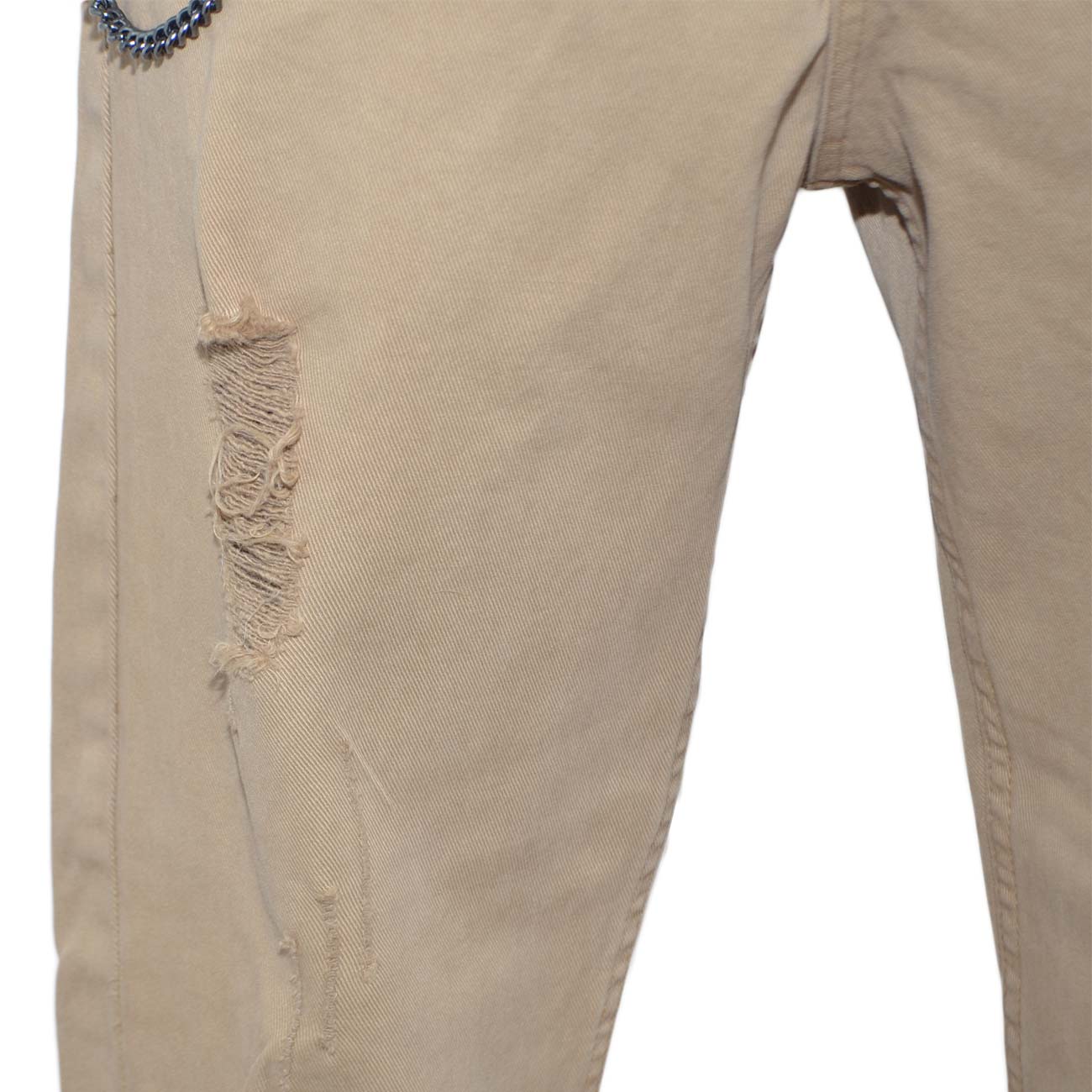 Pantaloni Jeans beige denim biker. Skinny fit.Chiusura con bottone e cerniera. strappi e tasche dettaglio catena