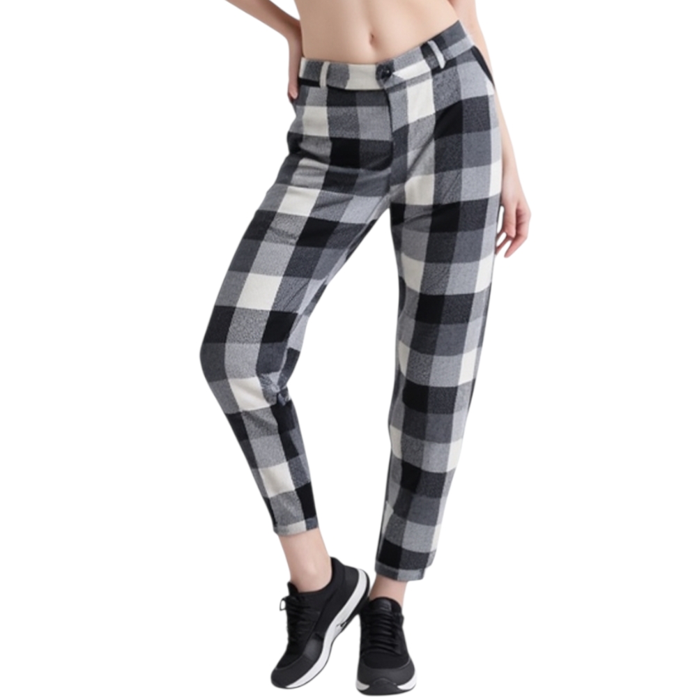 Pantaloni donna a sigaretta in lanetta rasata fantasia scacchi vita alta 4 tasche moda boyfriend