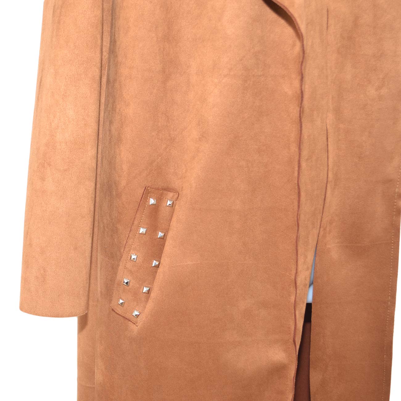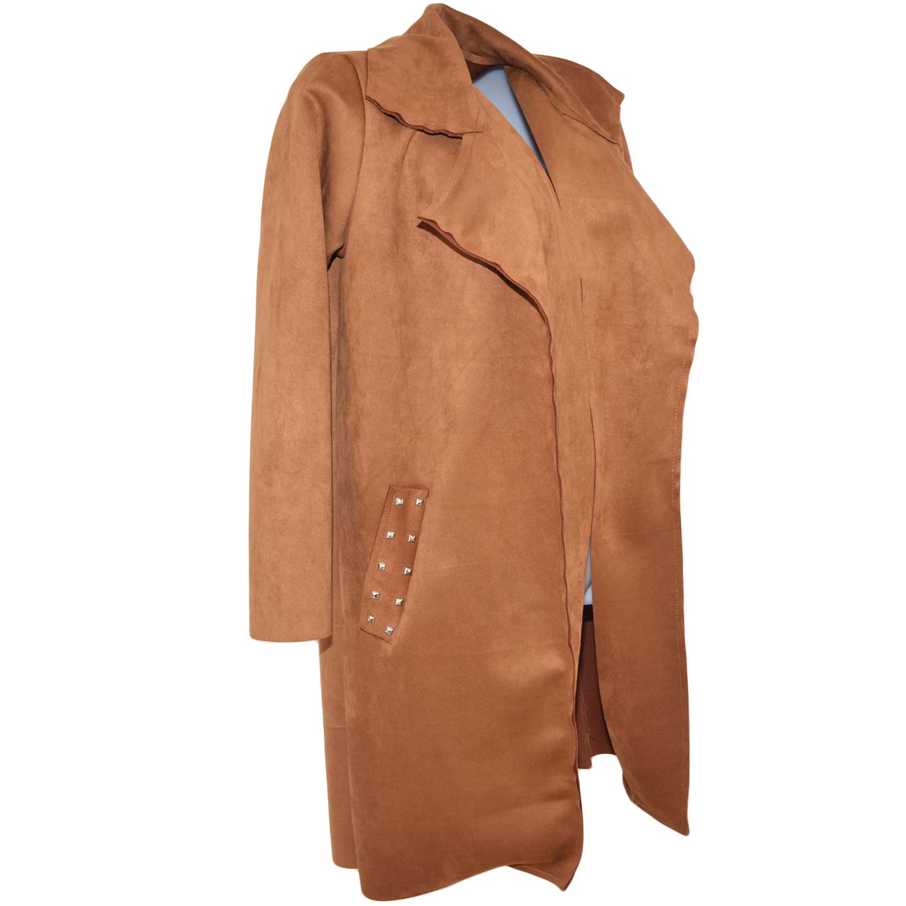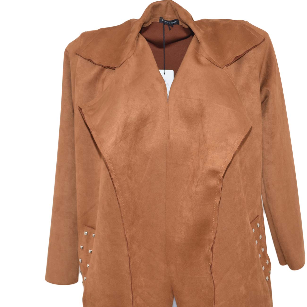 Cappotto giacca donna cuoio in tessuto scamosciato a due tasche con borchie taglio lento moda elegante
