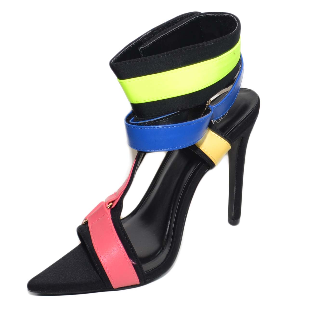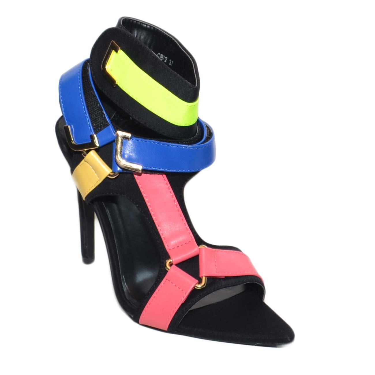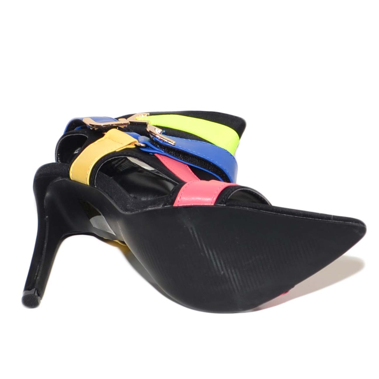 Sandalo donna colorato a punta con fibbie colorate rosa giallo blu tendenza moda tacco a spillo 12 cinturino caviglia