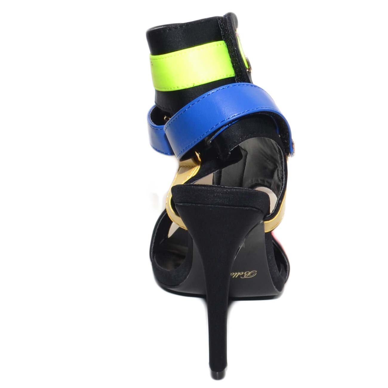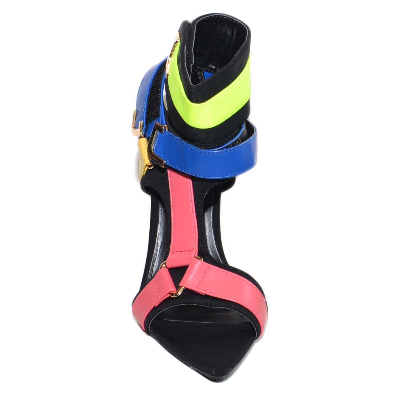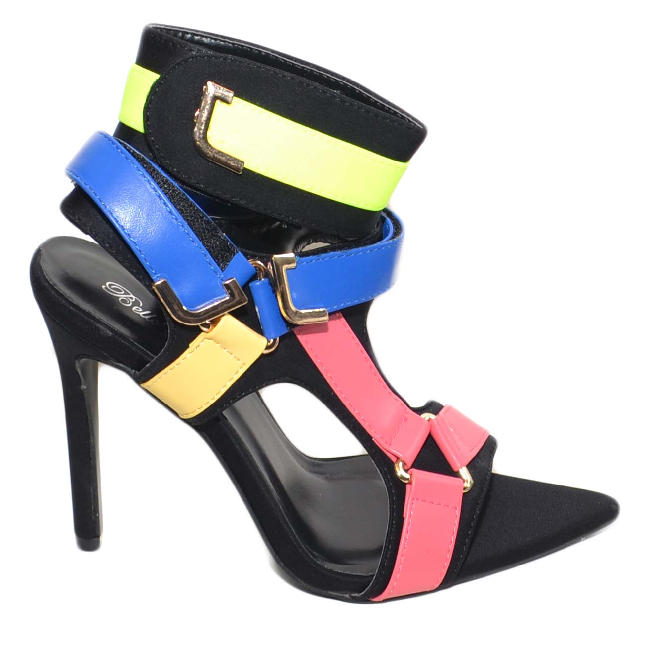 Sandalo donna colorato a punta con fibbie colorate rosa giallo blu tendenza moda tacco a spillo 12 cinturino caviglia