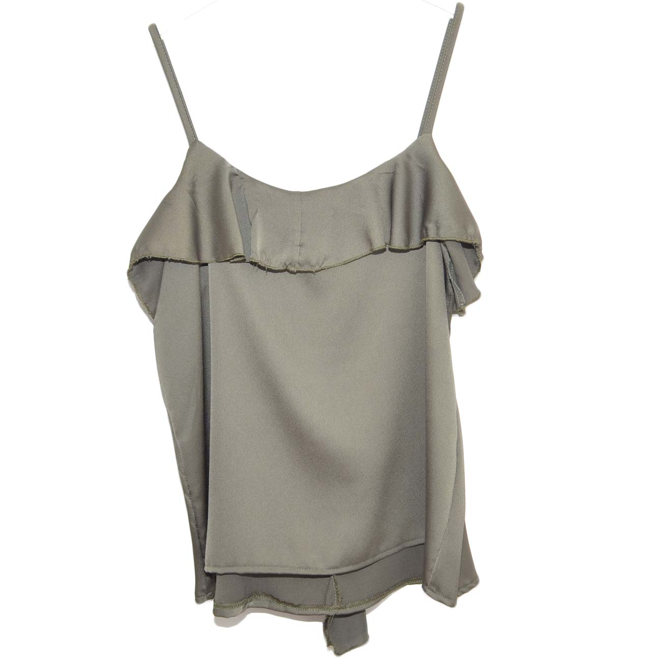 Canotta top sotto giacca donna in raso verde militare con volant e scollo a V moda basic giromanica bretella regolabile