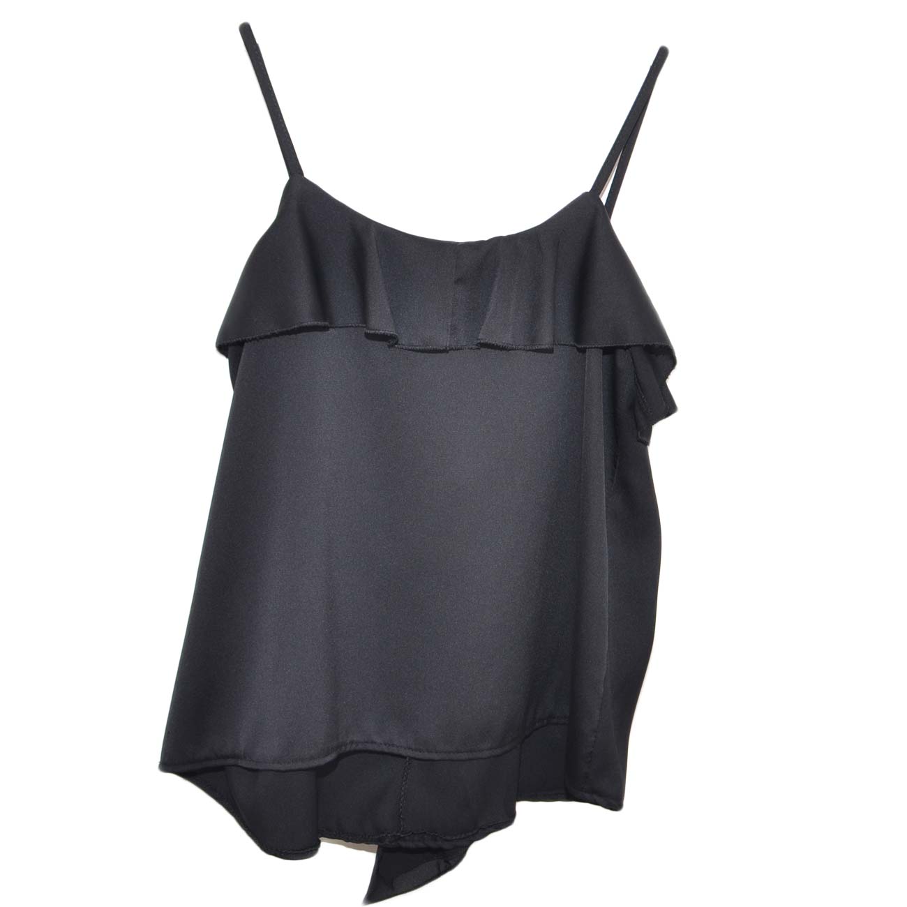 Canotta top sotto giacca donna in raso nero con volant e scollo a V moda basic giromanica bretella regolabile